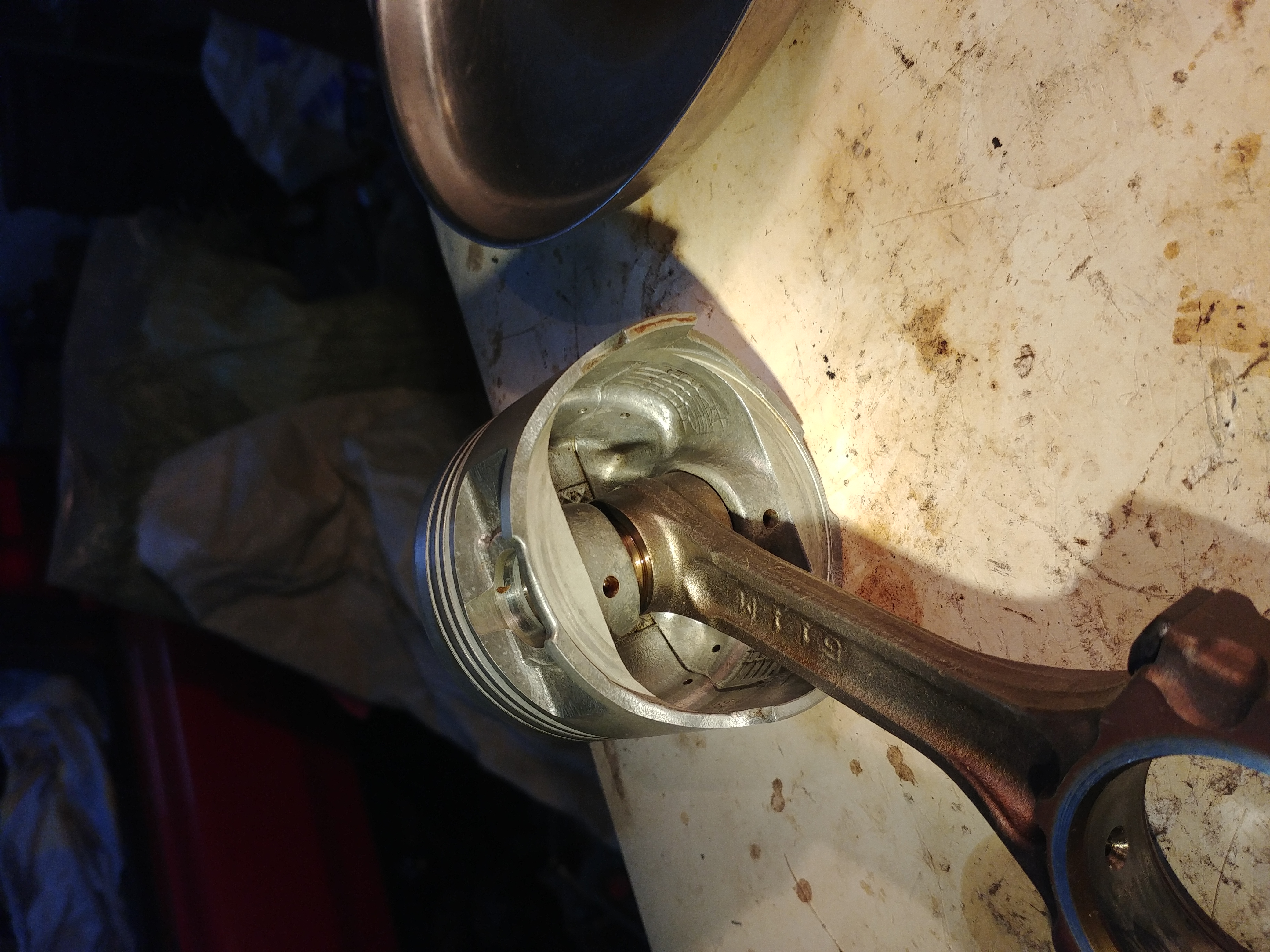 Трохи відмив кацемби та зробив фото поршнів. Кільця були запаковані наглухо, після жорсткої хімії звільнились компресійні. Але, на світлинах видно що там є... Шановні, це повна дупа. Якщо кільця лягли - тілько розбирати на відмивати. І тілько ручна робота, те що виймав з масловідвідних каналів не візьме ніяка УЗ мийка, проходив свердлом (пальцями потроху...). Клапанну групу верстатнику, там геометрію однозначно треба буде відновлювати.