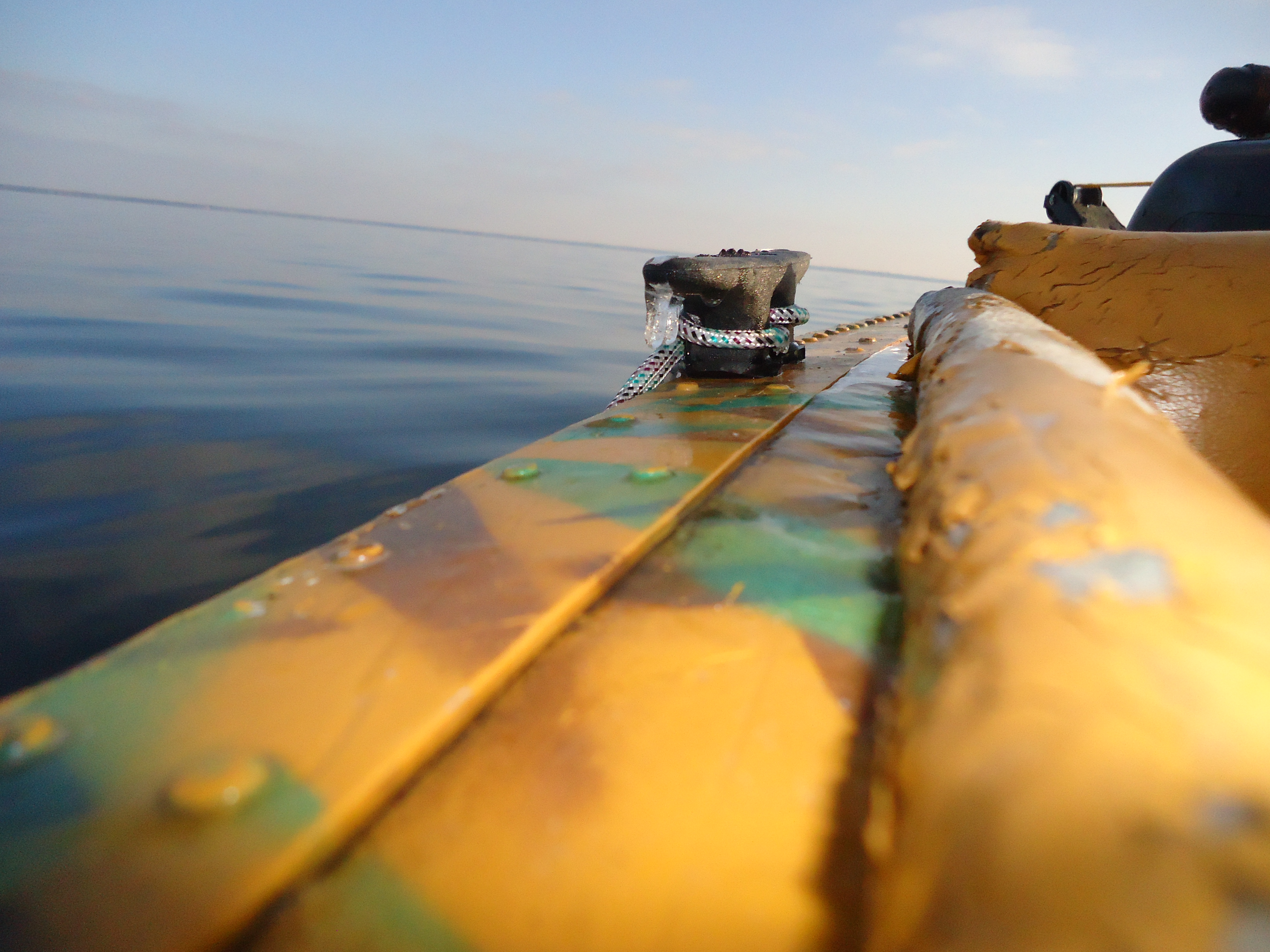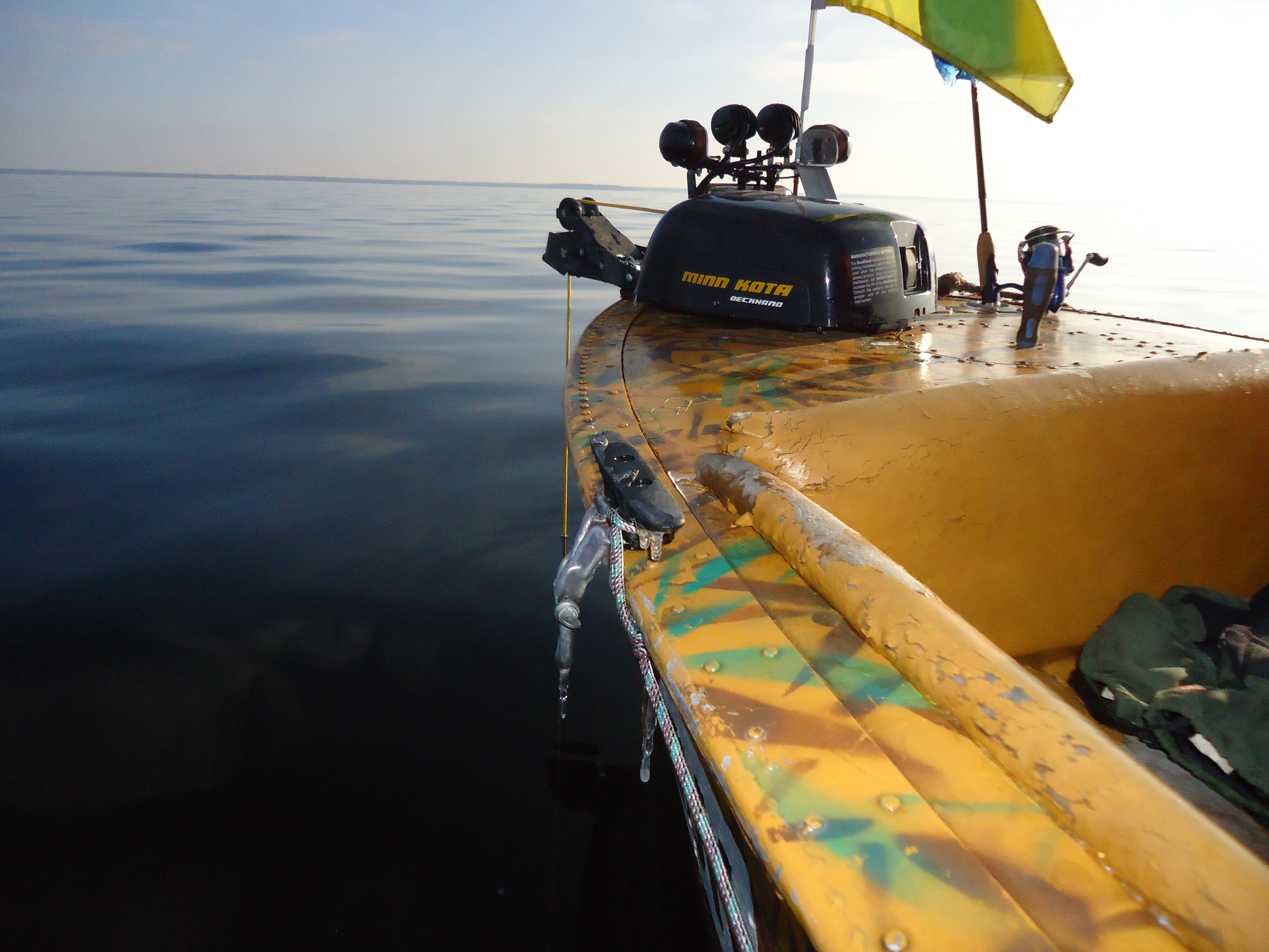 электро-проводка уложена по левому борту в 40мм трубе до носа. Есть помпа , ходовые огни, фары, два рундука под АКБ и под бак. В носу диван с рундуком. Цельная фанера на всю длину. В нагрузку якорь ромашка.