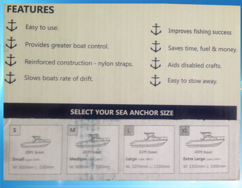 В наличии есть плавучие якоря Sea-Drogue - профессиональная модель из полиамидной ткани Rip-stop с толстой усиливающей нитью, пропитанной двумя слоями ПВХ. Буксирные хомуты и усиления на горловинах выполнены из нейлоновой ленты. Якорь Sea-Drogue (артикул 32.756.02) подходит для судна длиной до 8 метров.