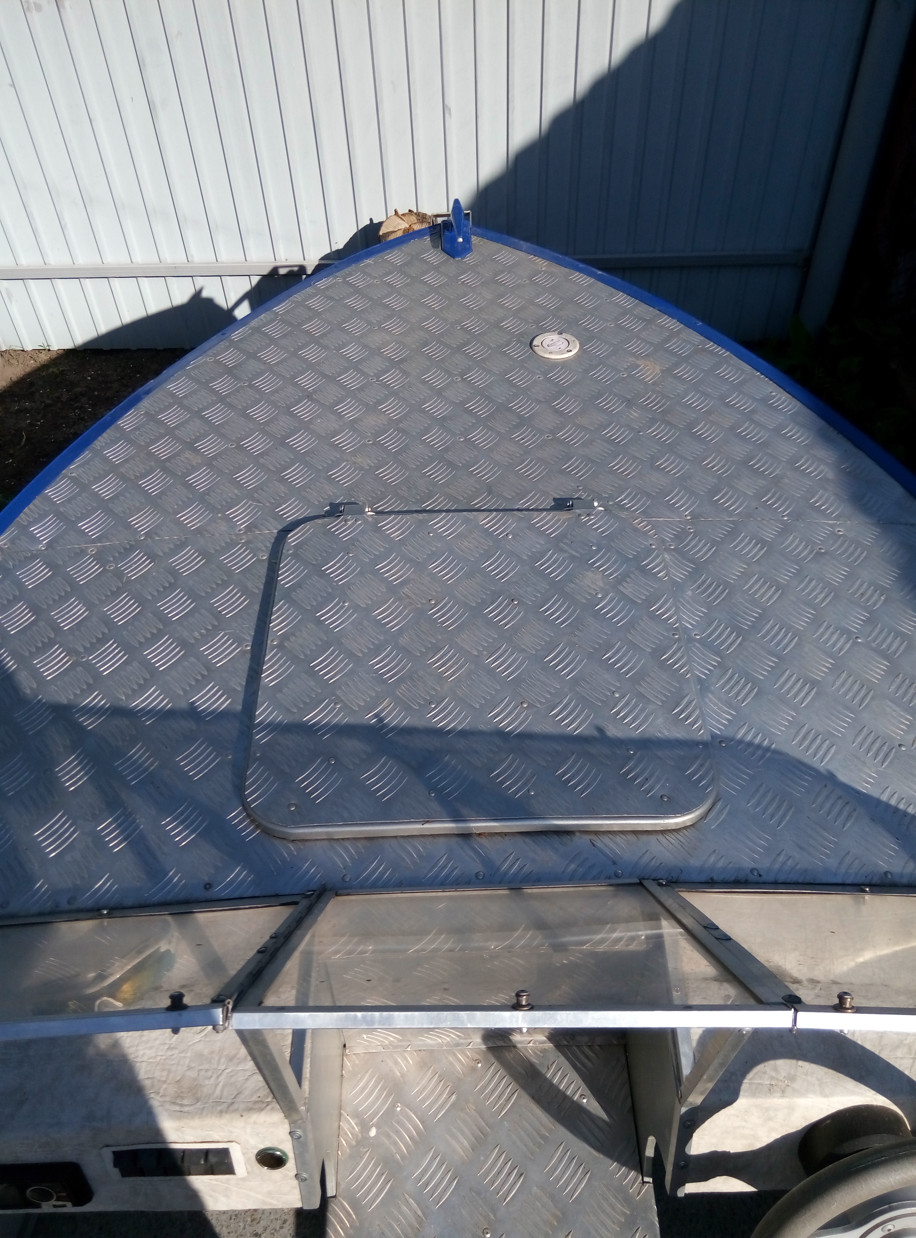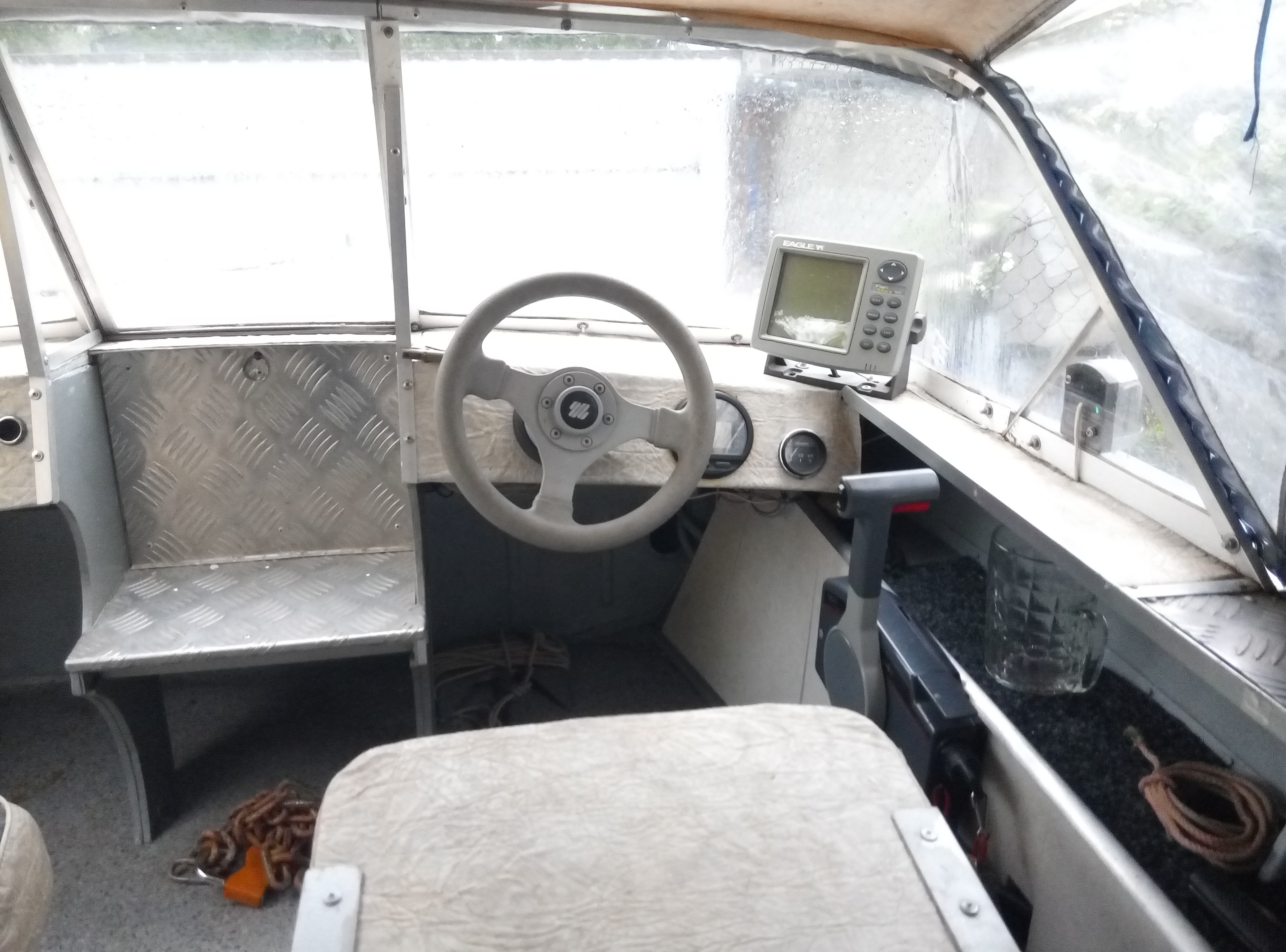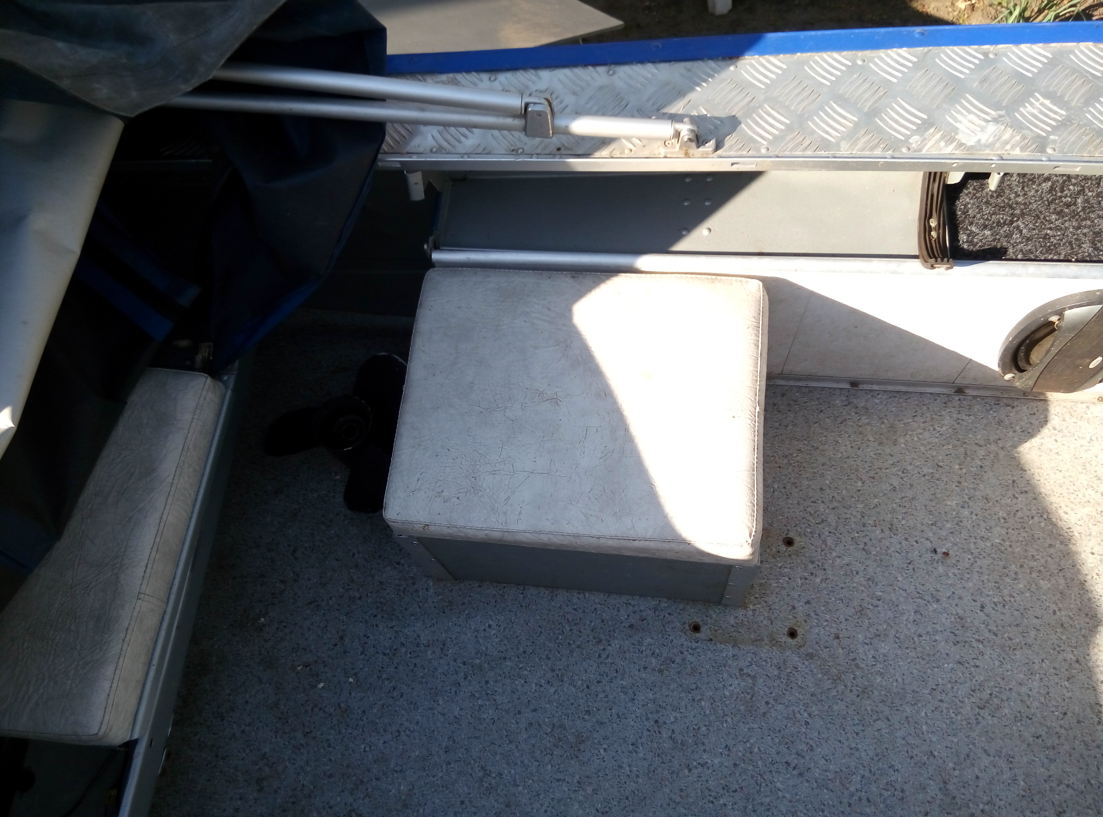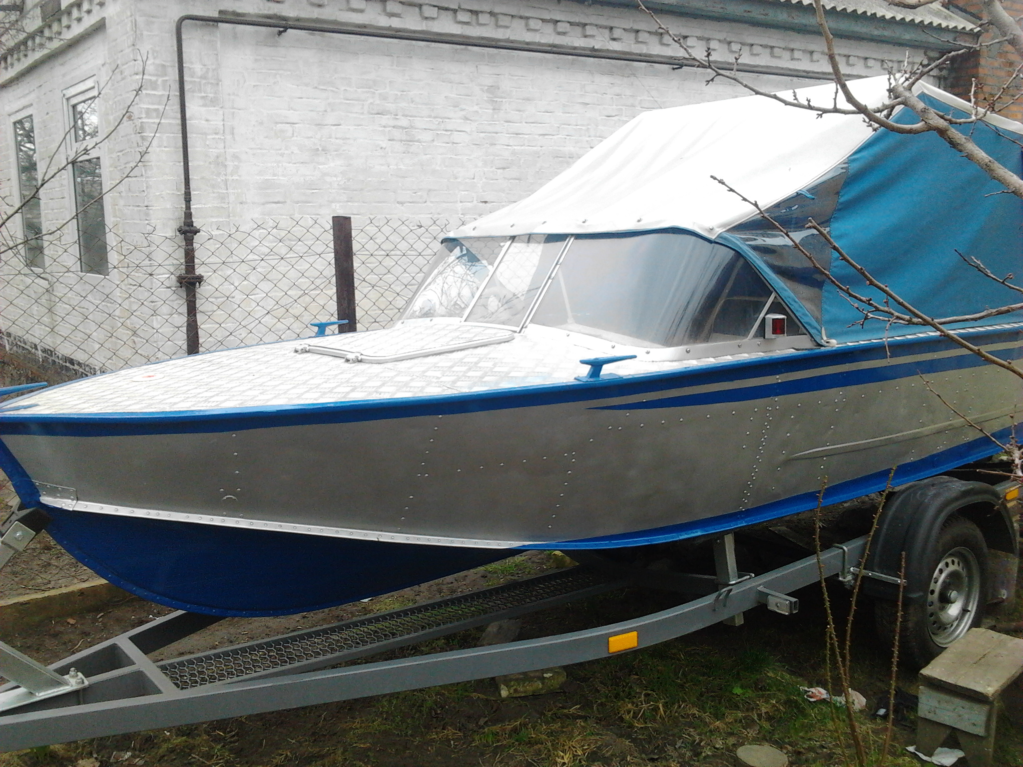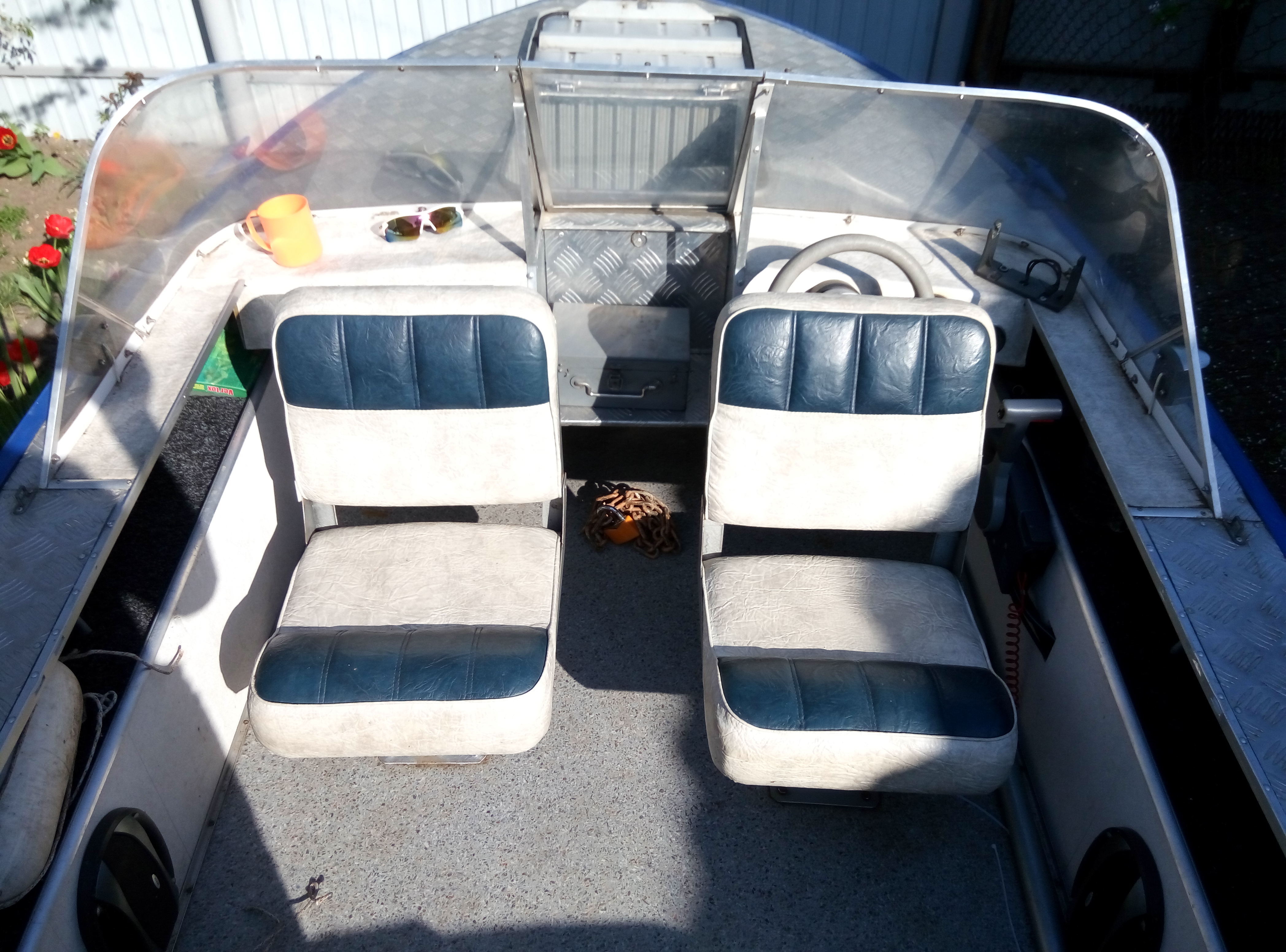 Лодка Прогресс4. Полность переделана осенью 2013 года. Поднят усилен транец, самоотливной рецесс,палуба рифленый алюминий, корпус погрунтован и правильно покрашен автоэмалью с лаком. Ветровое стекло поликарбонат 5мм. с форточкой, комбинированный тент с высокими дугами. Встроен новый бак 40 л. в носовой части. Правильная электропроводка, выключатель массы. Магнитола, двухполосные динамики, прикуриватель, помпа откачки воды. Снимающиеся, складные сидушки. Пол влагостойкая фанера+ линолеум. Рулевой редуктор+ трос до 100л.с.