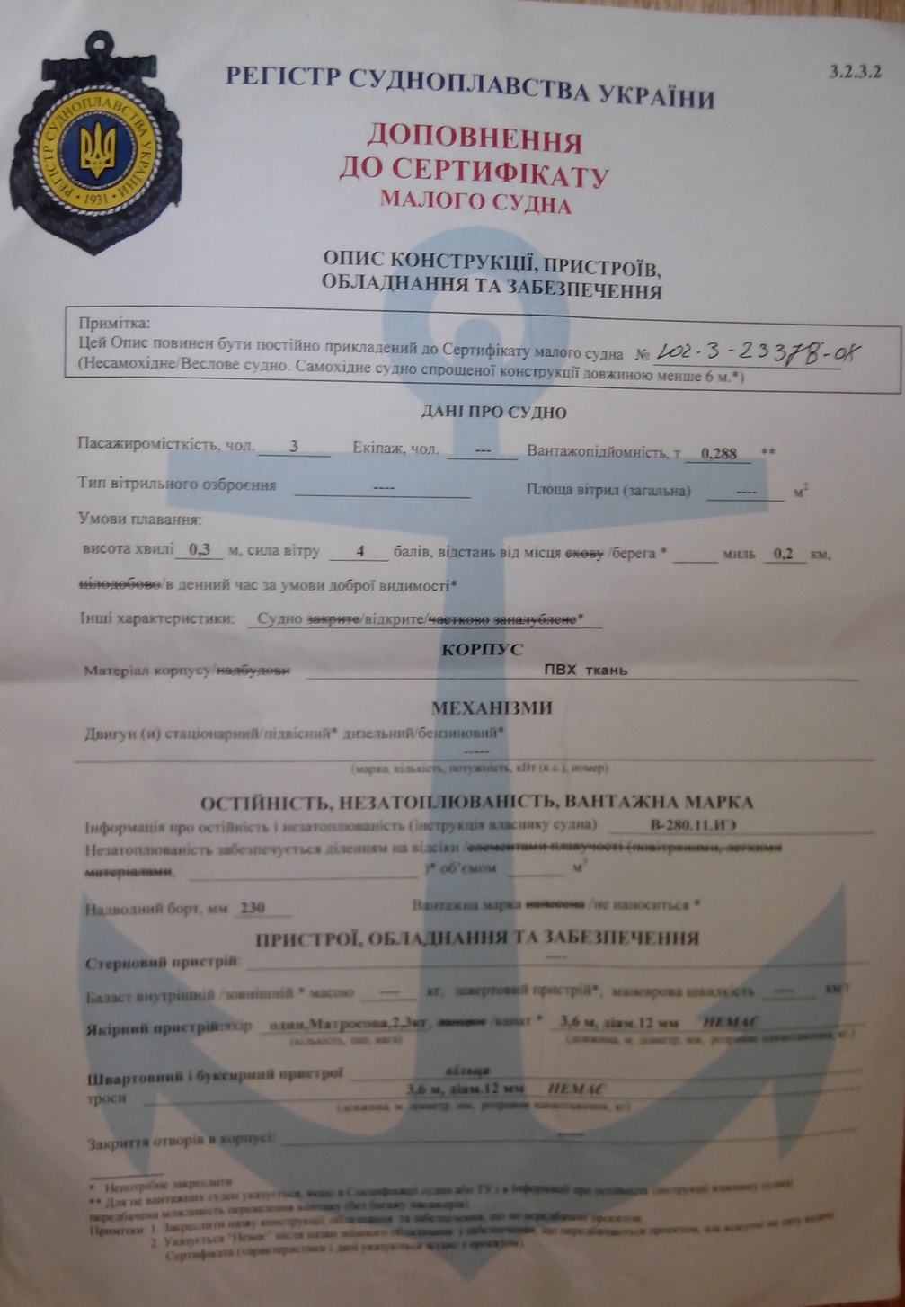 Лодка BARK B-280N - изготовлена из высококачественных лодочных ПВХ материалов, оборудована навесным транцем, днищевыми сланями, уключинами карданного типа, двумя гермоотсеками, леерами. Размеры лодки позволяют разместить все необходимые вещи, снасти и экипаж до трех человек. Для увеличения плавучести и устойчивости модель оснащена баллонами увеличенного диаметра (36 см.), слани позволяют уверенно стоять в лодке. Для установки подвесного лодочного мотора мощностью до 2.5 л.с. предусмотрен съемный транец. Идеально подходит для рыбалки на средних и больших водоемах, охоты и туризма. Характеристики Длина, см 280 Ширина, см 135 Диаметр борта, см 36 Количество гермоотсеков 2 Пассажировместимость 3 Грузоподъемность, кг 287 Тип днища реечный настил Плотность материала лодки, гр/м2 850 Плотность материала днища лодки, гр/м2 1100 Производство материала лодки Германия, Корея Цвет основной зеленый Леер спасательный есть Тип весел Комбинированные (пластик+алюминий), разборные, с положительной плавучестью Тип уключин Поворотные, комбинированные (пластик и металл) Длина весел, см 140 Транец навесной Привальный брус нет Комплектация Лодка надувная 1 Насос 1 Сиденья 2 Слань днищевая 3 Весла 2 Ремкомплект 1 Сумка для транспортировки 1 Сертификат малого судна с приложением 1 Параметры упаковки лодки Длина, см 100 Ширина, см 40 Высота, см 35 Вес комплекта, кг 23 Цена; 2000 грн. Тел. 066 592 52 09, 097 79 08 244