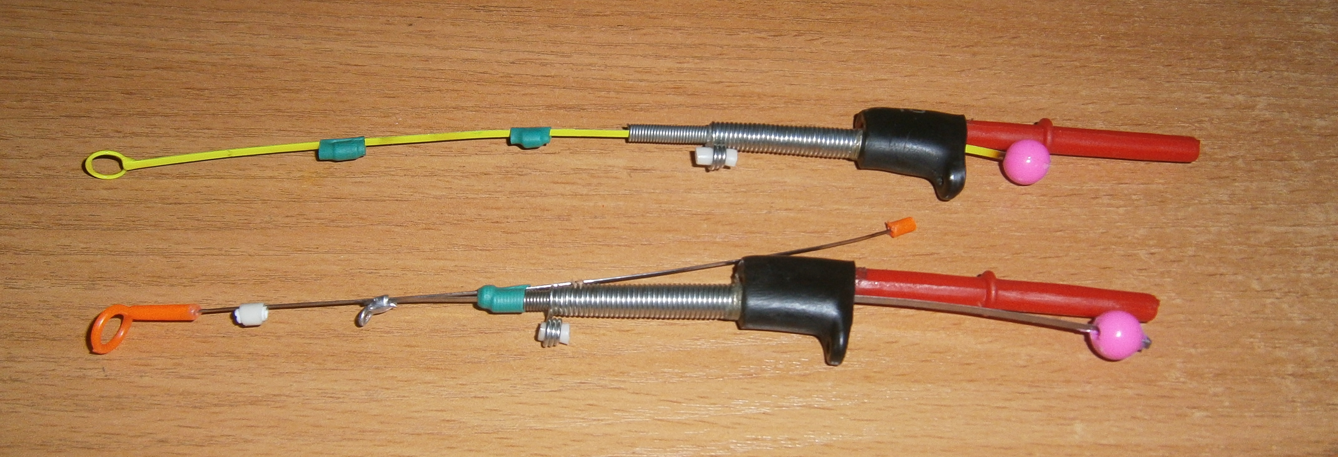 добавлю две удочки ручной работы с пружиной- аммортизатором. регулируемым пластинчатым кивком , один крашеная часовая пластина, второй рессорного типа, оба регулируються по длине , что позволяет подбирать нужную частоту и амплитуду игры