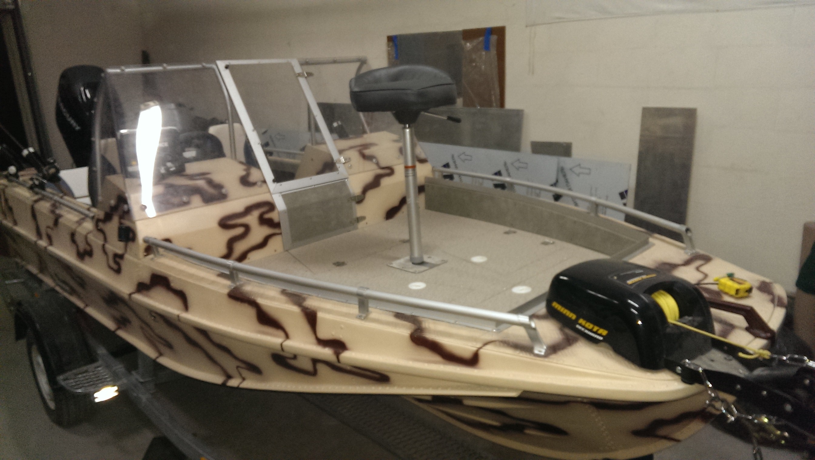 В этой лодке мы подняли - усилили транец(как видно на фото). По борту, рифленкой скрывали неровности, трещины, ненужные отверстия... Зашитый нос - Это уже пожелание клиента!!!! |