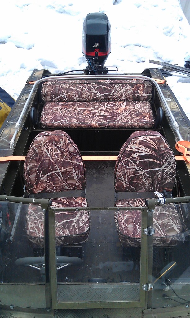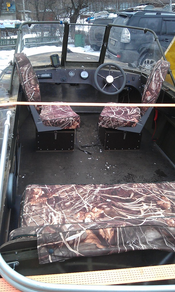 Заказывались рундуки, передние сидухи с поворотными механизмами и на все шились чехлы под камыш и заказывались мягкие части на задний диван.
