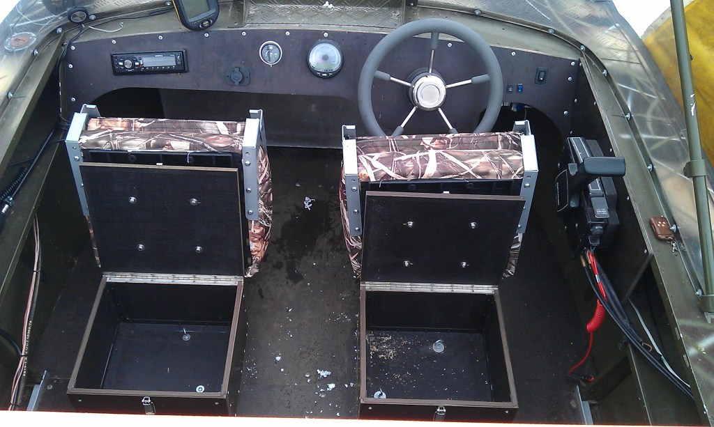 Установлен стационарный бак на 60 литров, разведена вся электрика, установлены ходовые огни, помпа, ящик для аккумулятора, магнитола, колонки, эхолот, матюхальник, подставки под спиннинги.