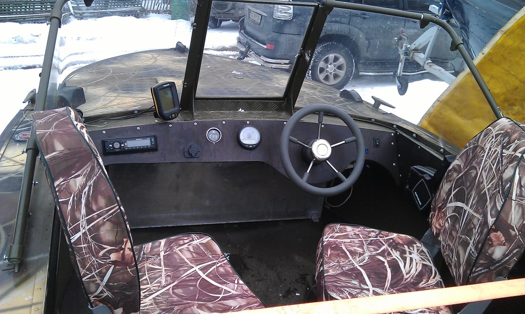 Корпус брался полностью в заводской краске, без единой латочки и подозрения на коррозию. Дальше усиливался транец, менялось лобовое стекло, зашивался нос рефленкой, все это красилось у профессионалов под камыш, переделывался задний рундук и пайола и все это обшивалось бакелитовой фанерой.