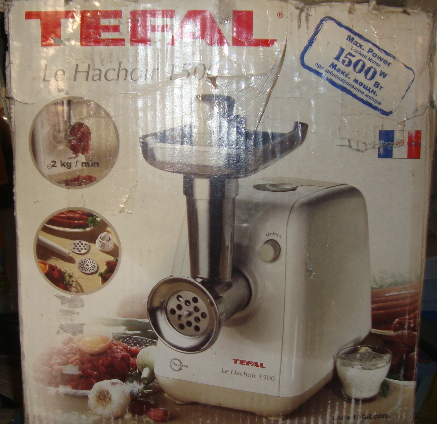 №7 мулинекс - нет ножа, тарелки и отломан кусок направляющей шнека. Зато ..ля, есть насадка для колбасы!
