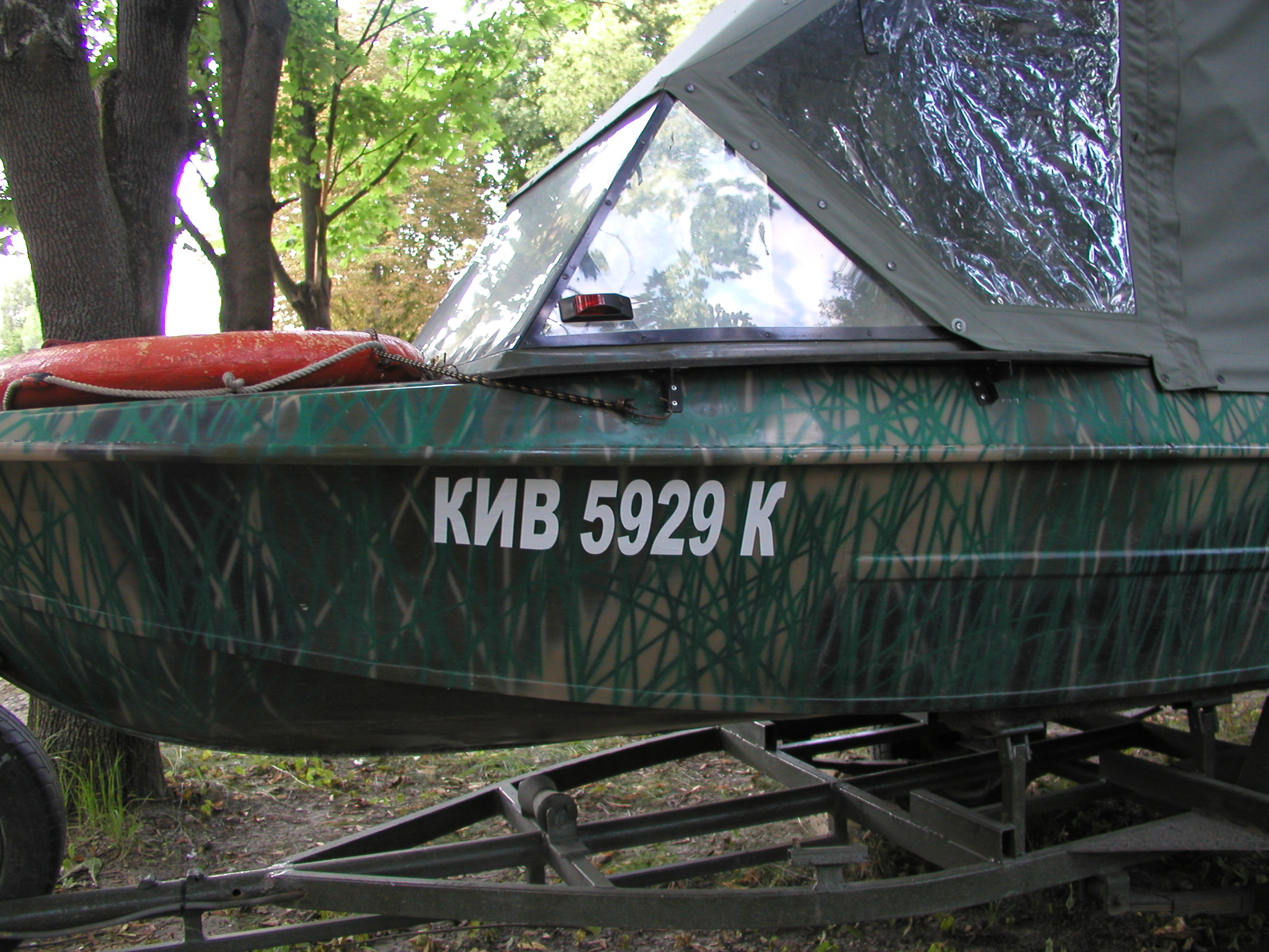 Лодка модернизирована в 2008г. Продольные реданы, корпус запенен – повышенной плавучести, камуфляжная окраска, вращающиеся передние сидения, задний диван с рундуком, бакелитовые пайолы, лобовое стекло, тент ходовой, электропомпа, панель приборов, навигационные огни, прожектор, сирена, розетка 12 В, контейнер с аккумулятором, выключатель массы, якорь Холла, круг, весла, эхолот.