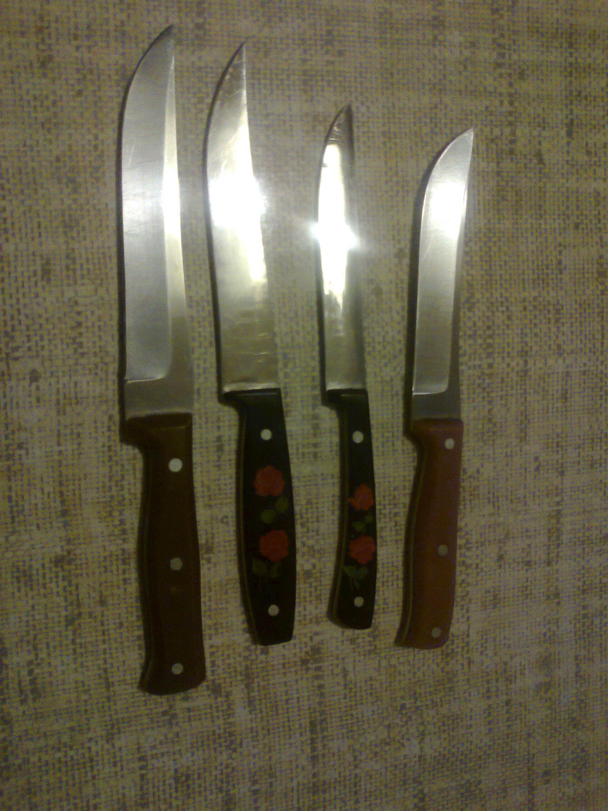 Добавлено через 38 минут Вот мои домашние,так от нечего делать слепил,но получилось-для жены-неплохо.А самому нижнему-узенькому под 20 лет,делал перед свадьбой-новой хозяйке,ножи на кухне висят,некоторые в деревянной подставке.Ножи нужно хранить так-чтоб они не касались друг-друга\держать на кухне\как некоторые ХОЗЯЙКИ в банке или чашке,а потом ходит просит-заточите-пожалста..... |