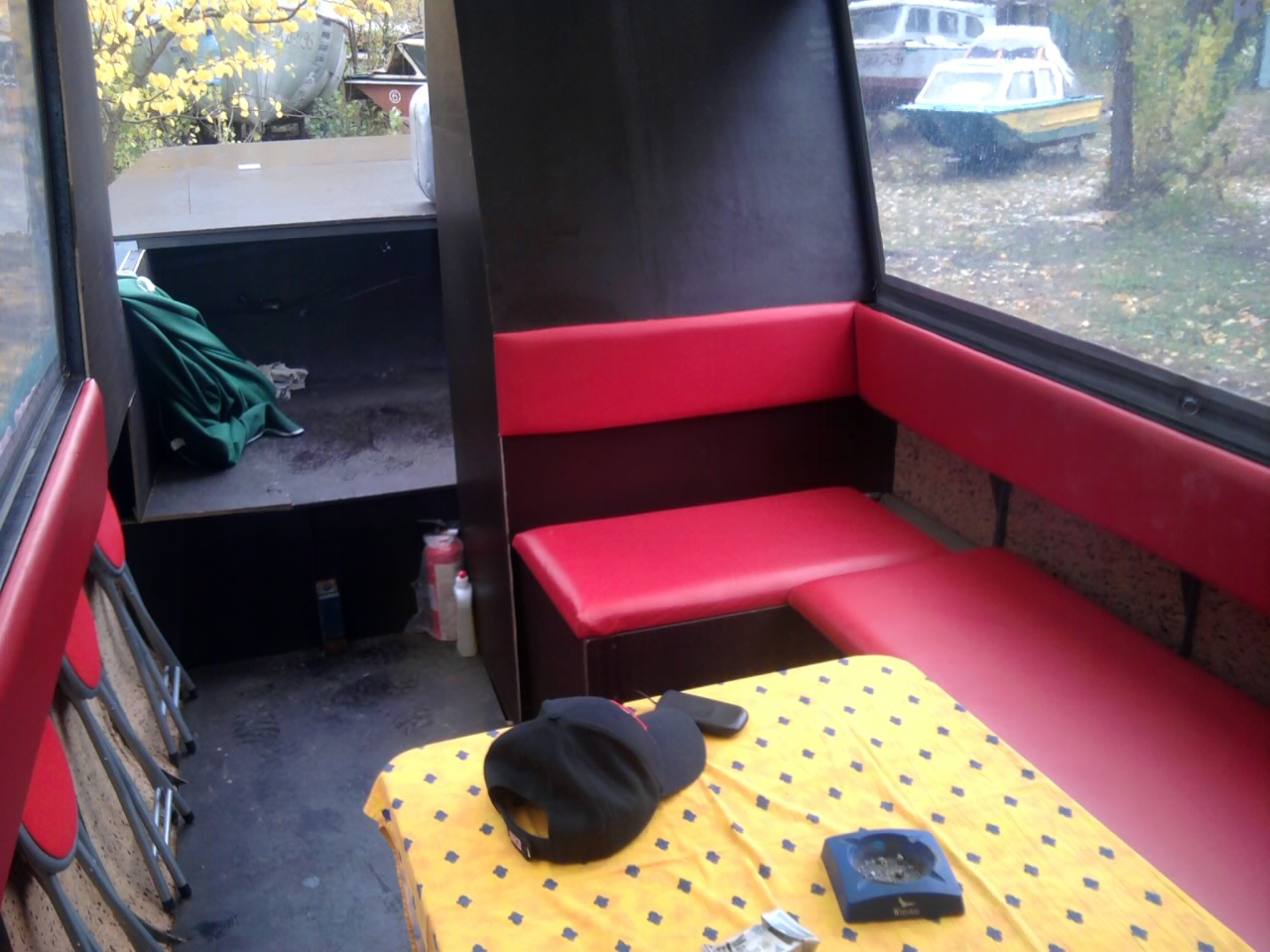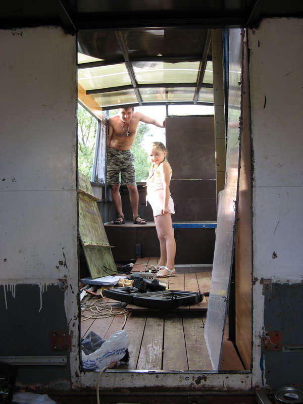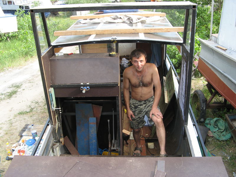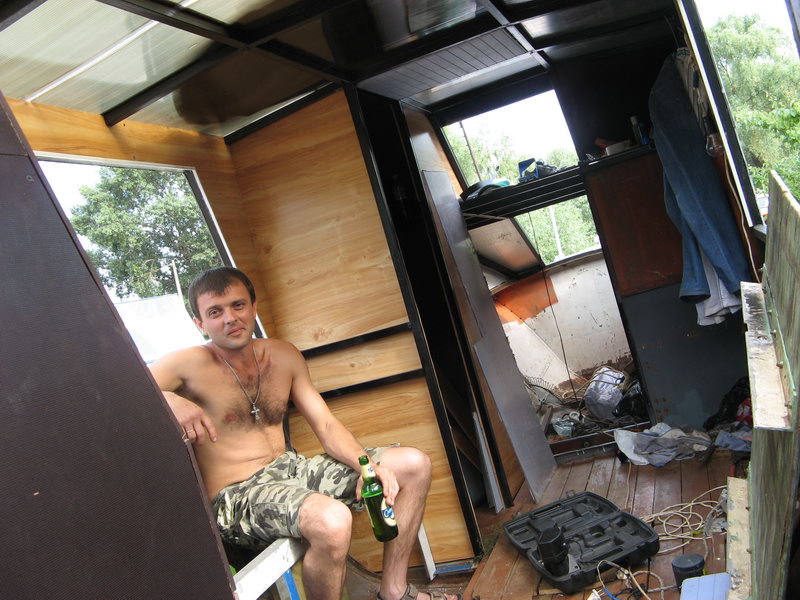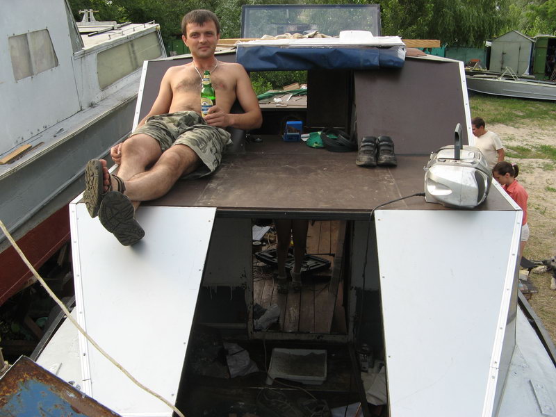 2. Семейная преемственность - корабль уже заселен молодежью. Вид из будущей каюты-спальни в сторону кормы. 3. В будущем это будет самое козырное место - площадка для загара с видом по ходу лодки. В роли девочки-модели с автосалона позирует Андрей, для большей эротичности поглаживая бутылочку с пивом