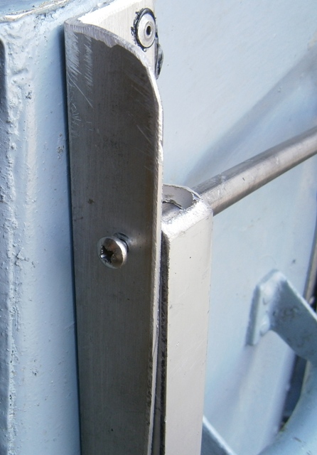 Фиксация лесенки в верхнем положениии и крепление шарнира, на этом я работы по лестнице заканчиваю,сегодня покрашена и ждем переворота лодки и изготовления поручней.Удачи всем в творчестве.