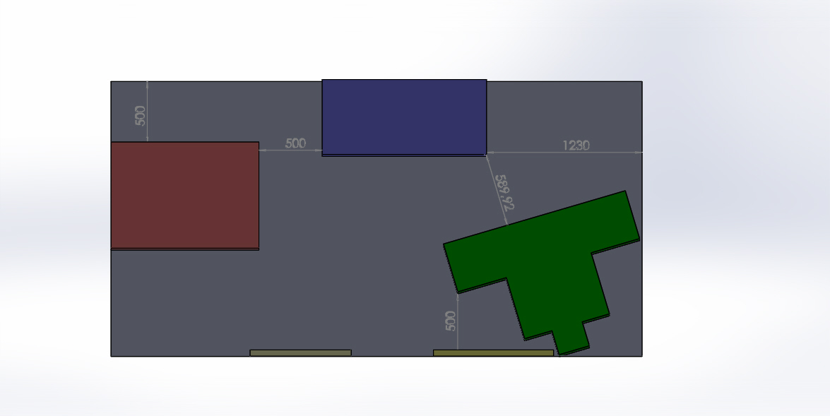 Накидал несколько вариантов размещения оборудования, два из них понравились. Фрезерный станок - зеленый, токарный станок - фиолетовый, ЧПУ фрезер красный/синий.