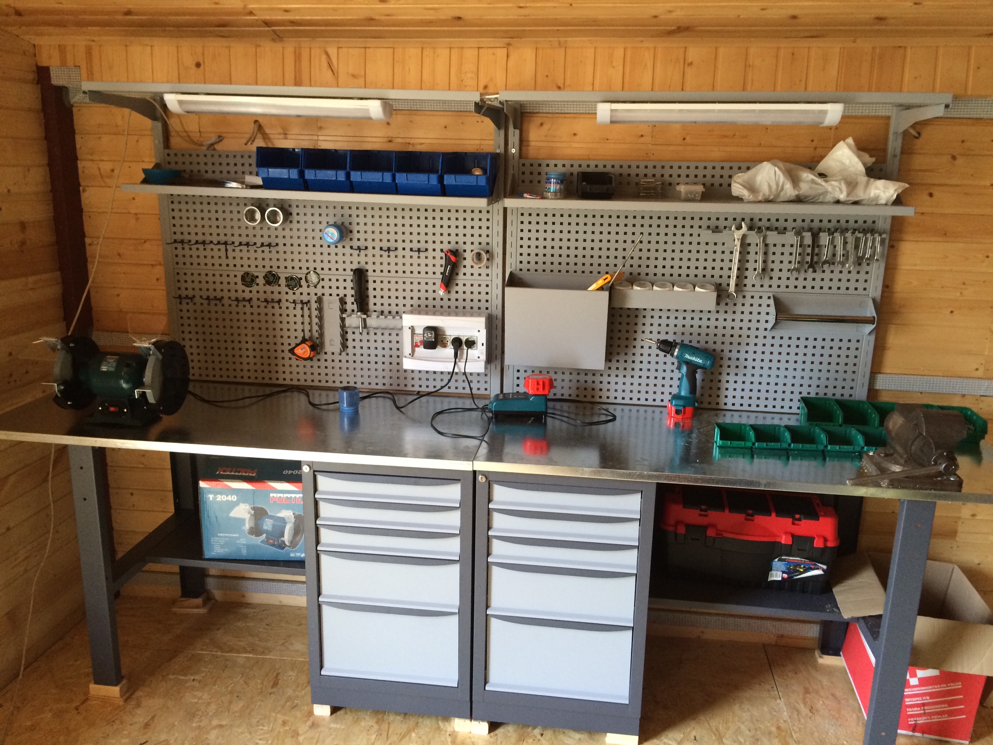 Установил 2 верстака + навеску + тиски + точило