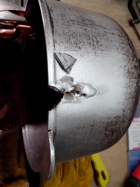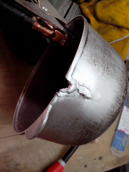 Как и что я бокопорил видно в хронологии фоток, вначале допустил ошибку, не прихватил концы трещены, начал идти от средины казана к концам и фрагмент отвалился... второй бок решил добавить при наплавке побольше тока, и когда уже оставалось наплавить 3-5мм наплавил шишак, пришлось срезать и наплавлять заново