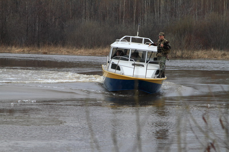Немного о самом катере. Корпус сварной, из морских сплавов АМг, полнонаборный, с тремя водонепроницаемыми переборками, мощными стрингерами и шпангоутами. По сравнению с лодками, построенными по технологии с заполнением межбортового пространства пенопластом или пенополиуретаном, такая конструкция не намного тяжелее, но значительно прочнее, надежнее и долговечнее. Сварные швы выполнены настолько аккуратно, что позавидуют многие импортные аналоги. Угловатые, рубленые формы, ломаные линии, обратный наклон лобовых стекол, общая брутальность – внешность настоящего искателя приключений в самых сложных и тяжелых условиях эксплуатации! Обстройка и отделка КС-701 соответствует его внешности: интерьер довольно простой, аккуратный и эстетичный. Рубка просторная и светлая, высота 1,95 м позволяет стоять в ней в полный рост. Дополнительное свободное пространство над головой предполагает размещение сеток и карманов для мелочи. В ненастную погоду здесь чувствуешь уют и комфорт. Обратный наклон стекол в ясную погоду снижает бликование от воды и солнца, а во время дождя капли воды не растекаются, и можно не включать стеклоочистители. Стол-трансформер по левому борту опускается, образуя с сиденьем дополнительное спальное место. А по правому борту, за креслом капитана - компактный камбуз со всем необходимым, чтобы приготовить горячий обед в длительном путешествии. Об эргономике пространства рубки можно говорить бесконечно, как и о количестве вариантов обстройки, которые можно сделать по собственному вкусу. Выходим на кормовой кокпит. Как и носовой, он выполнен самоотливным, двигатель закрыт съемным прямоугольным капотом, лючок в кормовой платформе позволяет чистить водомет прямо на плаву. Пространства столько, что с комфортом разместится несколько человек, как для отдыха, так и для активной рыбалки. А при необходимости можно уложить габаритный груз и другие вещи для путешествий. Проход по боковым потопчинам вполне удобный: поручни на рубке оказываются под рукой. Удачно выбраны высота и расположение носовых релингов. При любом маневре катера, находясь на кокпите и держась за поручни, чувствуешь уверенность. Не возникает ощущения опасности и при заходе катера в крутой вираж, когда центробежная сила пытается тебя выбросить за борт. Посадка на катер с носа, кормы или бортов вопросов не вызывает. С необорудованного берега делать это просто и удобно, с учетом того, что на российских реках практически нет специальных причалов для малых судов. Подытожив описание, скажу - под функциональными скупыми формами скрывается надежность и незаурядные ходовые качества! Нам осталось это проверить! Путь до места охоты неблизкий, и времени на испытания достаточно. Дизельный Steyr (250 л.с.) тихо рокочет на холостых, добавляем газ, водомет - собственной разработки костромского судомеханического завода - выбрасывая мощный поток воды, дает тягу. На 20 км/ч выходим на глиссирование, не задирая нос. Повторили разгон еще раз - убеждились: дифферент при выходе на глиссирование практически отсутствует. Потребовалось не более 25 секунд, чтобы с места набрать скорость 60 км/ч (4200 об. / мин.), при этом на борту катера находилось 9 человек. Интересная особенность в поведении катера: при увеличении нагрузки скорость падает незначительно - это заслуга идеально рассчитанных обво