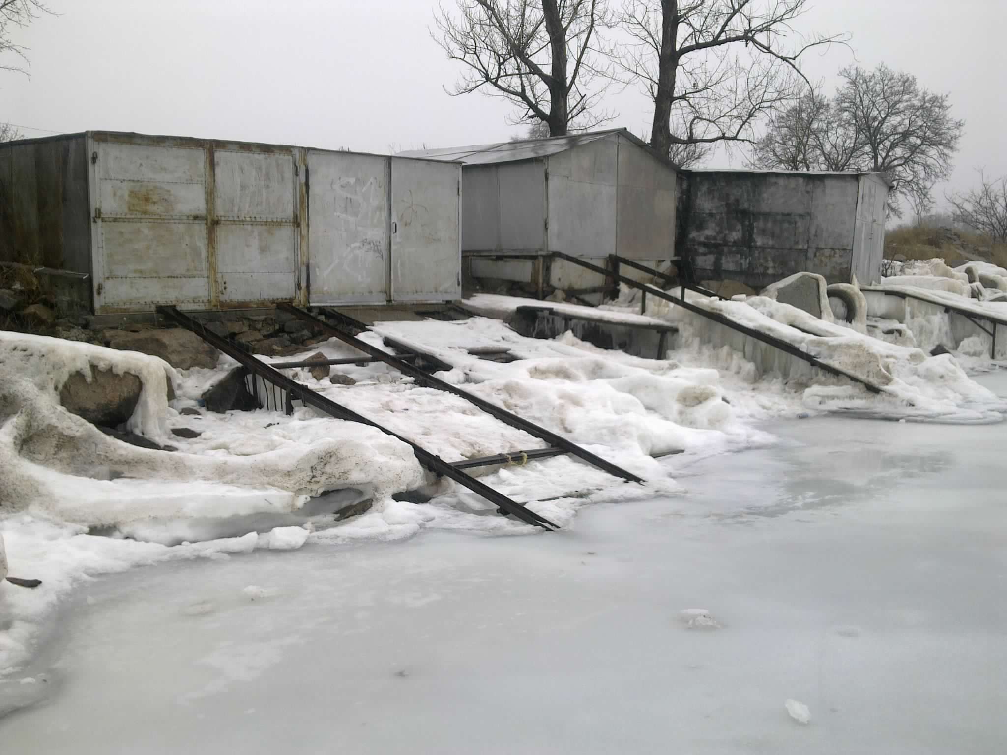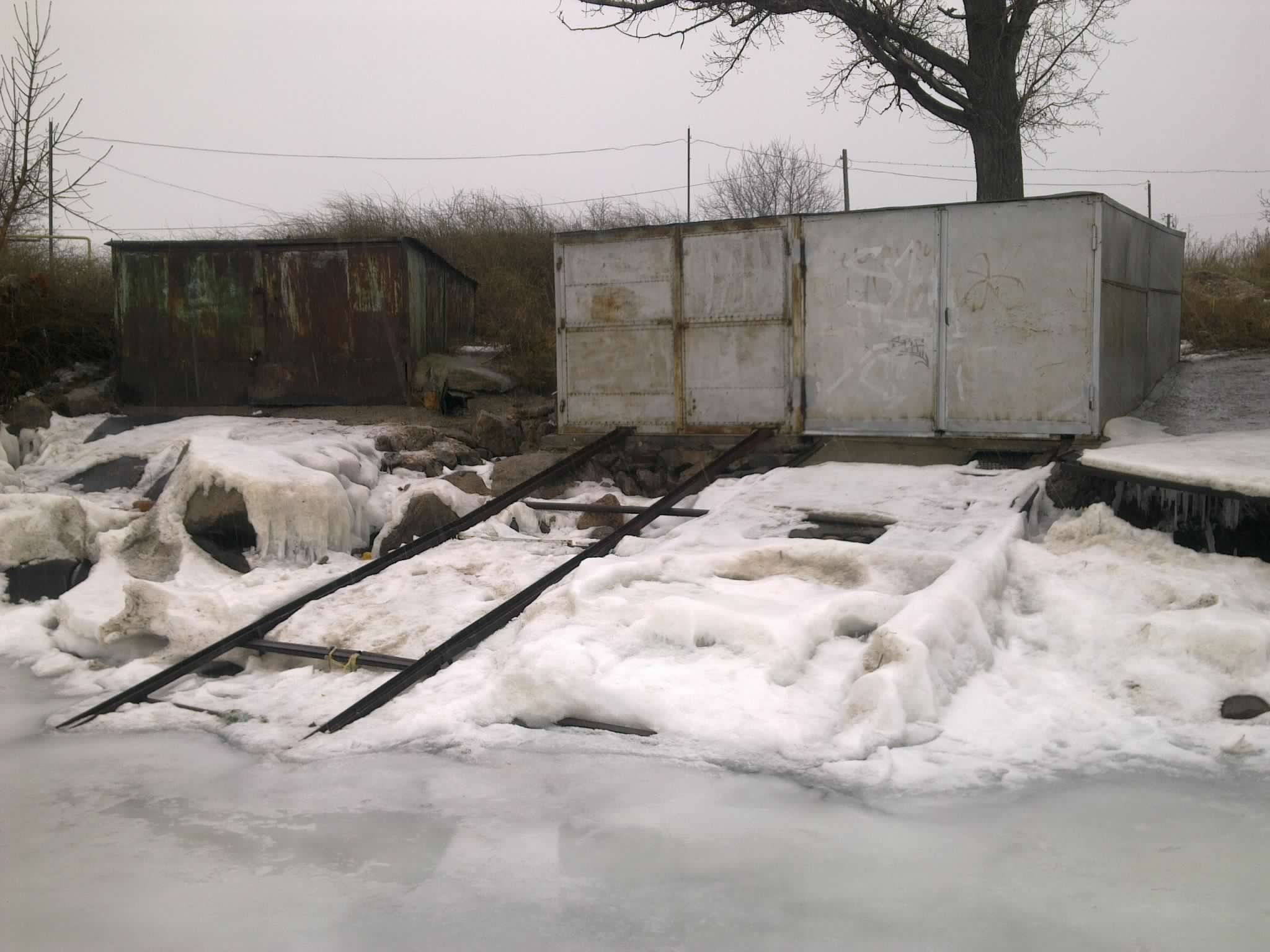 склоняюсь к гаражу на берегу с рельсами и тележкой в воду