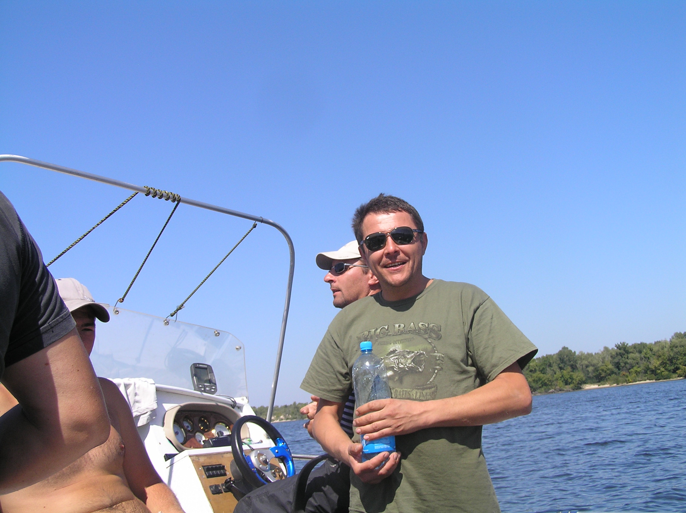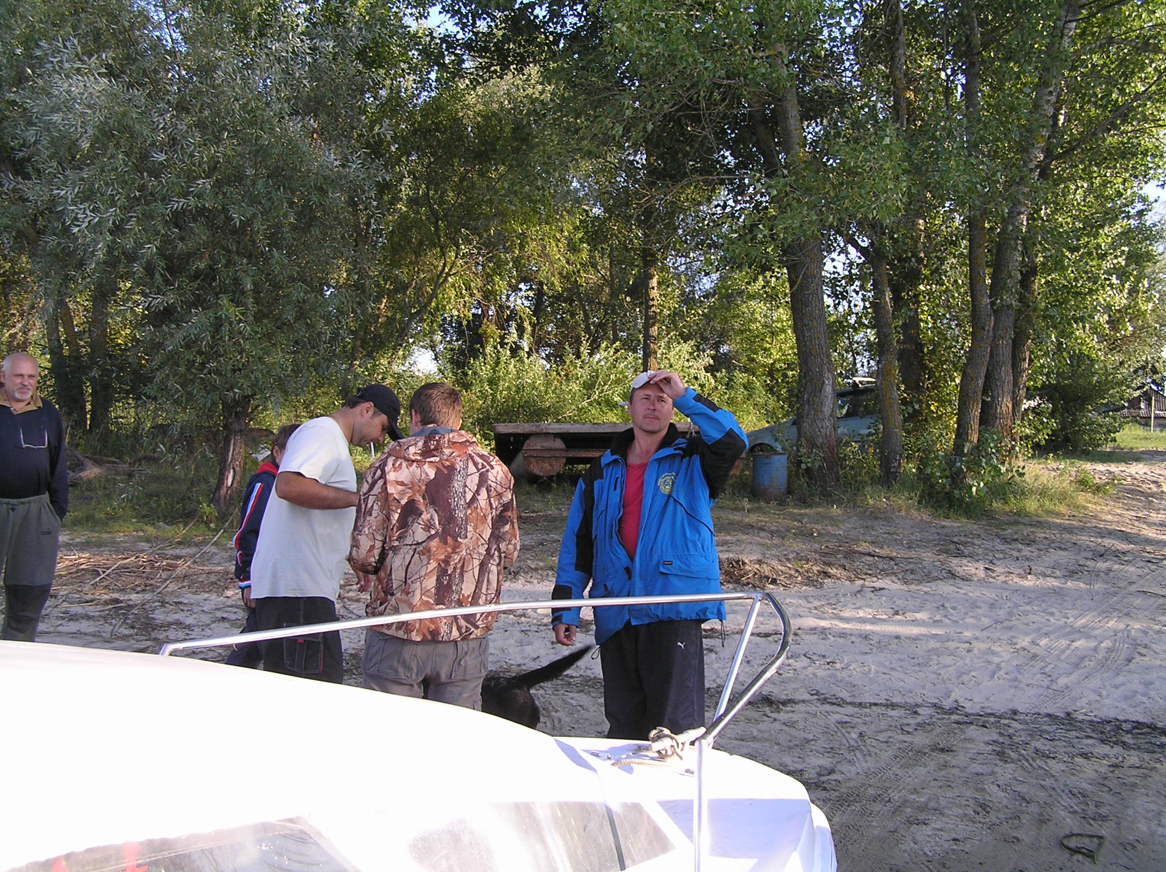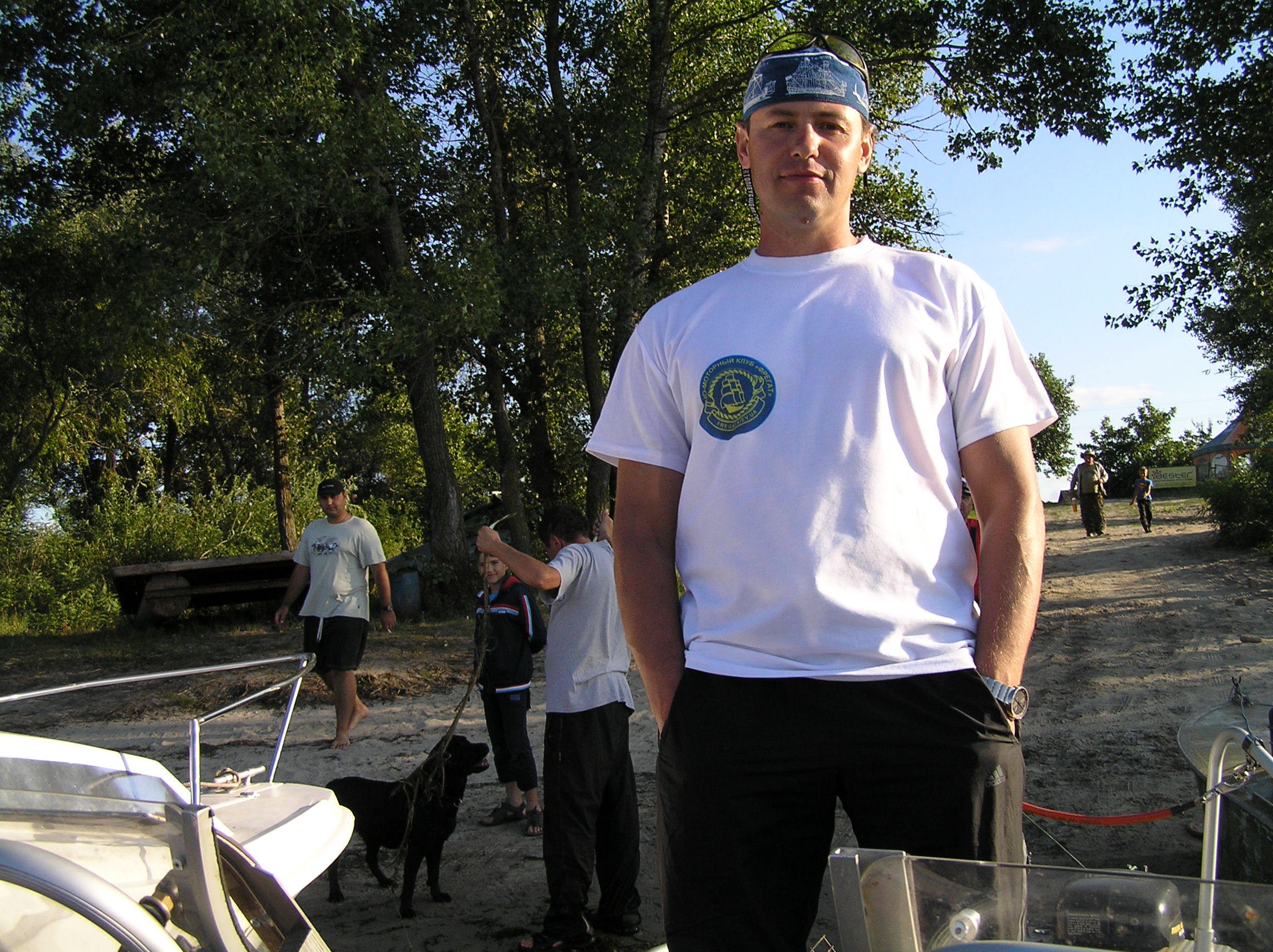 ……………………….Отчалив от берега с базы на р. Рось в р-не с. Хрещатик, двинулись в сторону русла р. Днепр, те кому доводилось проходить этот коротенький и не слишком сложный участок пути, хорошо представляют себе о чём я говорю, скажу лишь что в некоторых крутых поворотах глубина русла не превышала 40 см и вот уже практически преодолев все виражи и отмели, в 50 м от основного русла Днепра, происходит не слишком приятное, хоть и достаточно обыденное, происшествие, достаточно ощутимый удар по днищу лодки, а за ним второй, ещё более сильный удар винтом по, как в последствии выяснилось банальному бревну, полностью притопленному под водой . Напоролись на топляк, как обычные дилетанты и это при том, что контролировали акваторию в четыре глаза , два достаточно опытных капитана. Ну что же, как говорится «бывают в жизни огорчения» , да в общем то и не такие уж сильные огорчения, по скольку в запасе было ещё пару винтов . Тут же причалив к берегу, мгновенно меняем разбитый (к счастью не смертельно) винт и отправляемся дальше по маршруту следования до 90 бакена, где нас уже ожидал радушный хозяин, практически стационарно сооружённого лагеря для отдыха на острове – Леонид . Дальше всё как обычно в таких походах, быстрое планирование будущего расположения палаток на территории и их установка, короткое приготовление ужина и вечерние посиделки, но к сожалению обо всём что происходило в этот вечер, я наврятли смогу рассказать, по-скольку спать ушёл достаточно рано , как и добрая половина коллектива, сказался длительный переход и естественно определённая накопившаяся усталость. Утро следующего дня, а это был четверг 25.08 началось достаточно рано, что то около 7-00 час. Выйдя из каюты, обнаружил, что в такую рань не одному мне не спится, Валера (Бывалый) уже разминался в руках со спиннингом, пытаясь что то словить на завтрак . Как обычно в нашем коллективе, хозяйственные вопросы решались сообща и ни кто не искал отговорок, почему бы это ему не мыть посуду, не чистить картошку или ненарезать овощи, колбасу и т.д. Совместными усилиями был наведён порядок на столе и оперативно приготовлен вкуснющий завтрак, с которого и начался наш полноценный отдых на замечательном острове неподалеку от г. Черкасы, где всё что нас окружало просто благоухало теплотой, чистотой и уютом, пробыв там всего одни сутки мы чувствовали себя полноправными хозяевами положения без какого бы то ни было дискомфорта или зажатости и всё это конечно же благодаря нескольким составляющим, одна из которых это само удивительное место и его аура и второе – это конечно же та атмосфера доброжелательности и дружбы, которая всегда царит в нашем коллективе при подобного рода походах, рыбалках, встречах . Завтрак , посиделки, купание, отдых, разговоры и т.д., растянулись практически до самого вечера , когда как раз наши ряды и начали пополняться полноправными членами коллектива прибывающими из стольного града Киева на машинах в близлежащий населённый пункт. Не большой конфуз с непослушным ПЛМчиком Сани СТП , но стараниями всем нам известного форумчанина, всё было устранено и моторчик весело зажужжал неся к базовому лагерю очередную группу экспедиционеров . Вечером наш лагерь увеличился практически вдвое, прибыли Саня СТП с сыном Санькой (в простонародье – Шурёныч), Серёга (Сэр) на свеже-приобретённом по слу