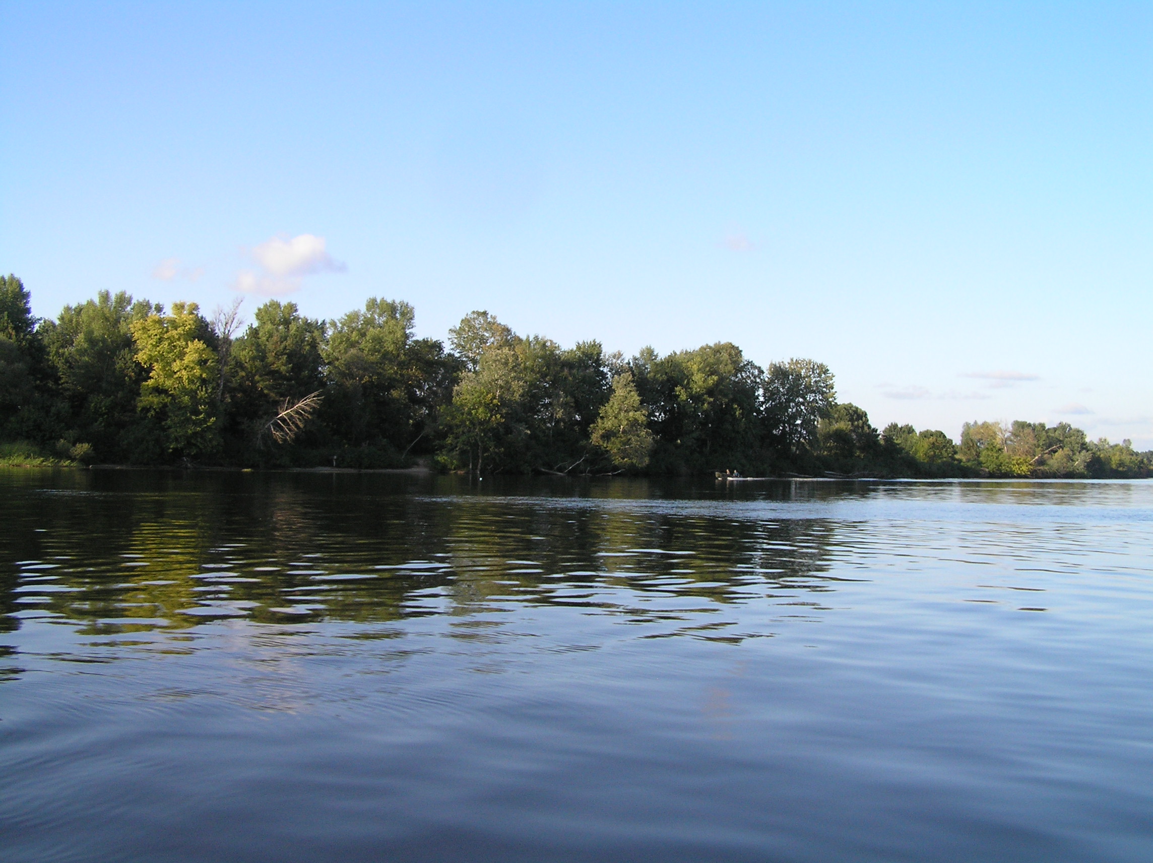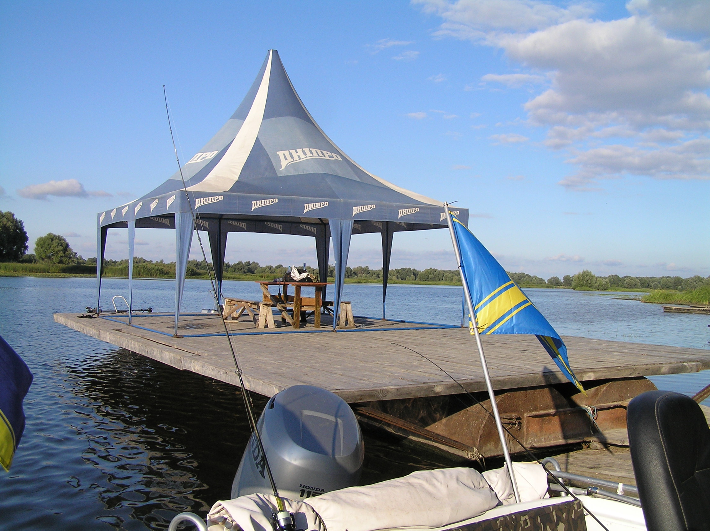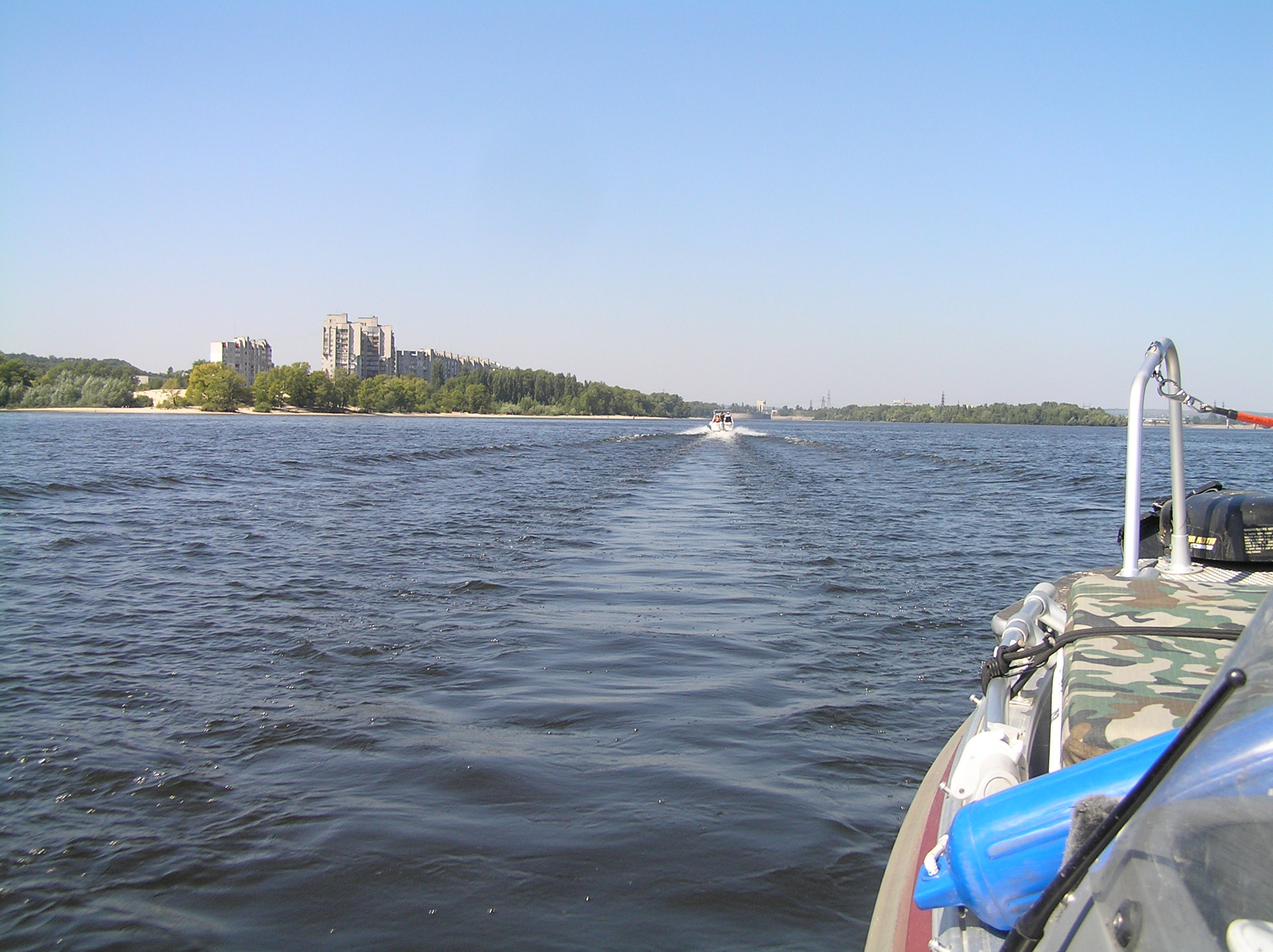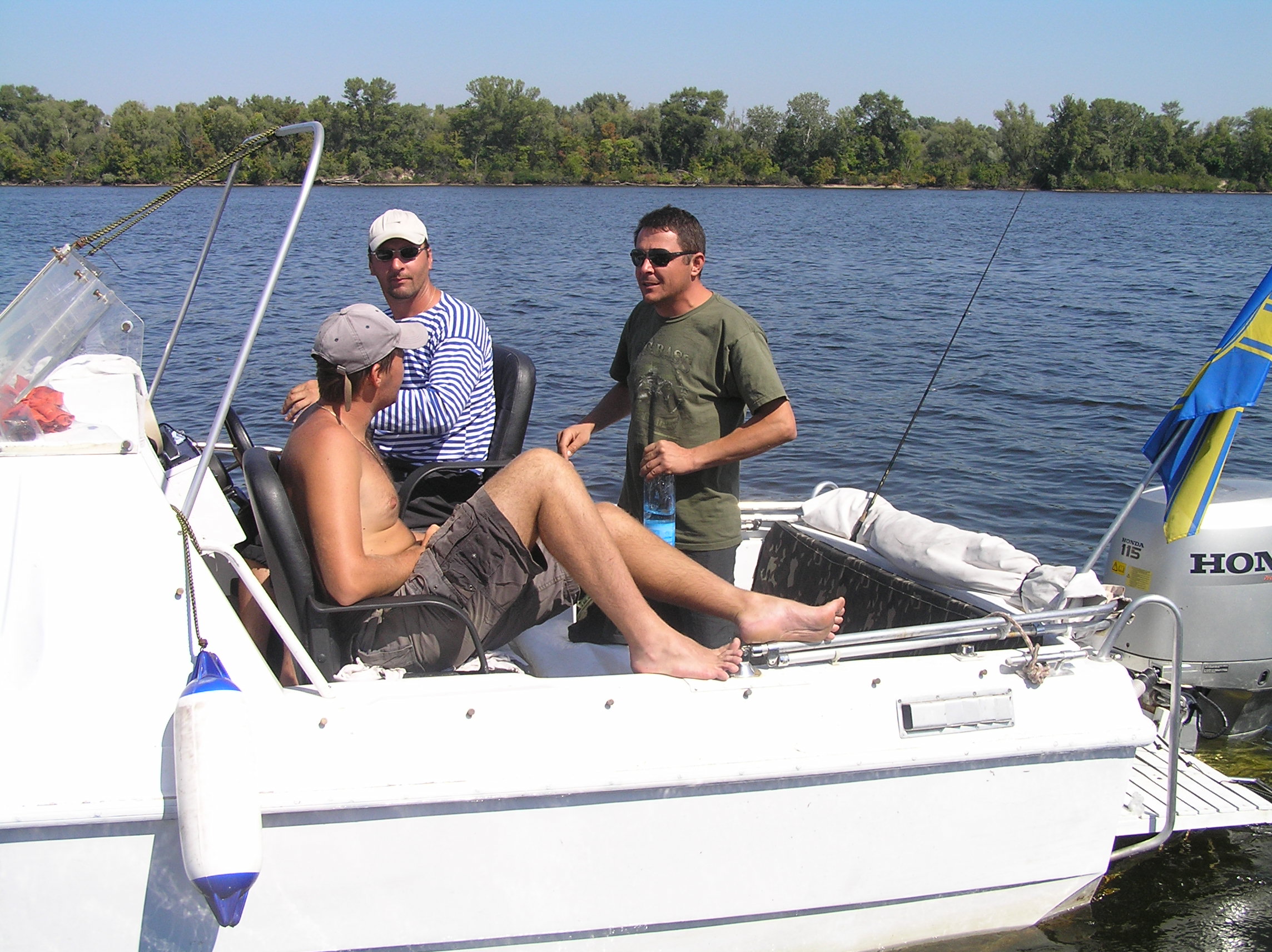 ……………………….Отчалив от берега с базы на р. Рось в р-не с. Хрещатик, двинулись в сторону русла р. Днепр, те кому доводилось проходить этот коротенький и не слишком сложный участок пути, хорошо представляют себе о чём я говорю, скажу лишь что в некоторых крутых поворотах глубина русла не превышала 40 см и вот уже практически преодолев все виражи и отмели, в 50 м от основного русла Днепра, происходит не слишком приятное, хоть и достаточно обыденное, происшествие, достаточно ощутимый удар по днищу лодки, а за ним второй, ещё более сильный удар винтом по, как в последствии выяснилось банальному бревну, полностью притопленному под водой . Напоролись на топляк, как обычные дилетанты и это при том, что контролировали акваторию в четыре глаза , два достаточно опытных капитана. Ну что же, как говорится «бывают в жизни огорчения» , да в общем то и не такие уж сильные огорчения, по скольку в запасе было ещё пару винтов . Тут же причалив к берегу, мгновенно меняем разбитый (к счастью не смертельно) винт и отправляемся дальше по маршруту следования до 90 бакена, где нас уже ожидал радушный хозяин, практически стационарно сооружённого лагеря для отдыха на острове – Леонид . Дальше всё как обычно в таких походах, быстрое планирование будущего расположения палаток на территории и их установка, короткое приготовление ужина и вечерние посиделки, но к сожалению обо всём что происходило в этот вечер, я наврятли смогу рассказать, по-скольку спать ушёл достаточно рано , как и добрая половина коллектива, сказался длительный переход и естественно определённая накопившаяся усталость. Утро следующего дня, а это был четверг 25.08 началось достаточно рано, что то около 7-00 час. Выйдя из каюты, обнаружил, что в такую рань не одному мне не спится, Валера (Бывалый) уже разминался в руках со спиннингом, пытаясь что то словить на завтрак . Как обычно в нашем коллективе, хозяйственные вопросы решались сообща и ни кто не искал отговорок, почему бы это ему не мыть посуду, не чистить картошку или ненарезать овощи, колбасу и т.д. Совместными усилиями был наведён порядок на столе и оперативно приготовлен вкуснющий завтрак, с которого и начался наш полноценный отдых на замечательном острове неподалеку от г. Черкасы, где всё что нас окружало просто благоухало теплотой, чистотой и уютом, пробыв там всего одни сутки мы чувствовали себя полноправными хозяевами положения без какого бы то ни было дискомфорта или зажатости и всё это конечно же благодаря нескольким составляющим, одна из которых это само удивительное место и его аура и второе – это конечно же та атмосфера доброжелательности и дружбы, которая всегда царит в нашем коллективе при подобного рода походах, рыбалках, встречах . Завтрак , посиделки, купание, отдых, разговоры и т.д., растянулись практически до самого вечера , когда как раз наши ряды и начали пополняться полноправными членами коллектива прибывающими из стольного града Киева на машинах в близлежащий населённый пункт. Не большой конфуз с непослушным ПЛМчиком Сани СТП , но стараниями всем нам известного форумчанина, всё было устранено и моторчик весело зажужжал неся к базовому лагерю очередную группу экспедиционеров . Вечером наш лагерь увеличился практически вдвое, прибыли Саня СТП с сыном Санькой (в простонародье – Шурёныч), Серёга (Сэр) на свеже-приобретённом по слу