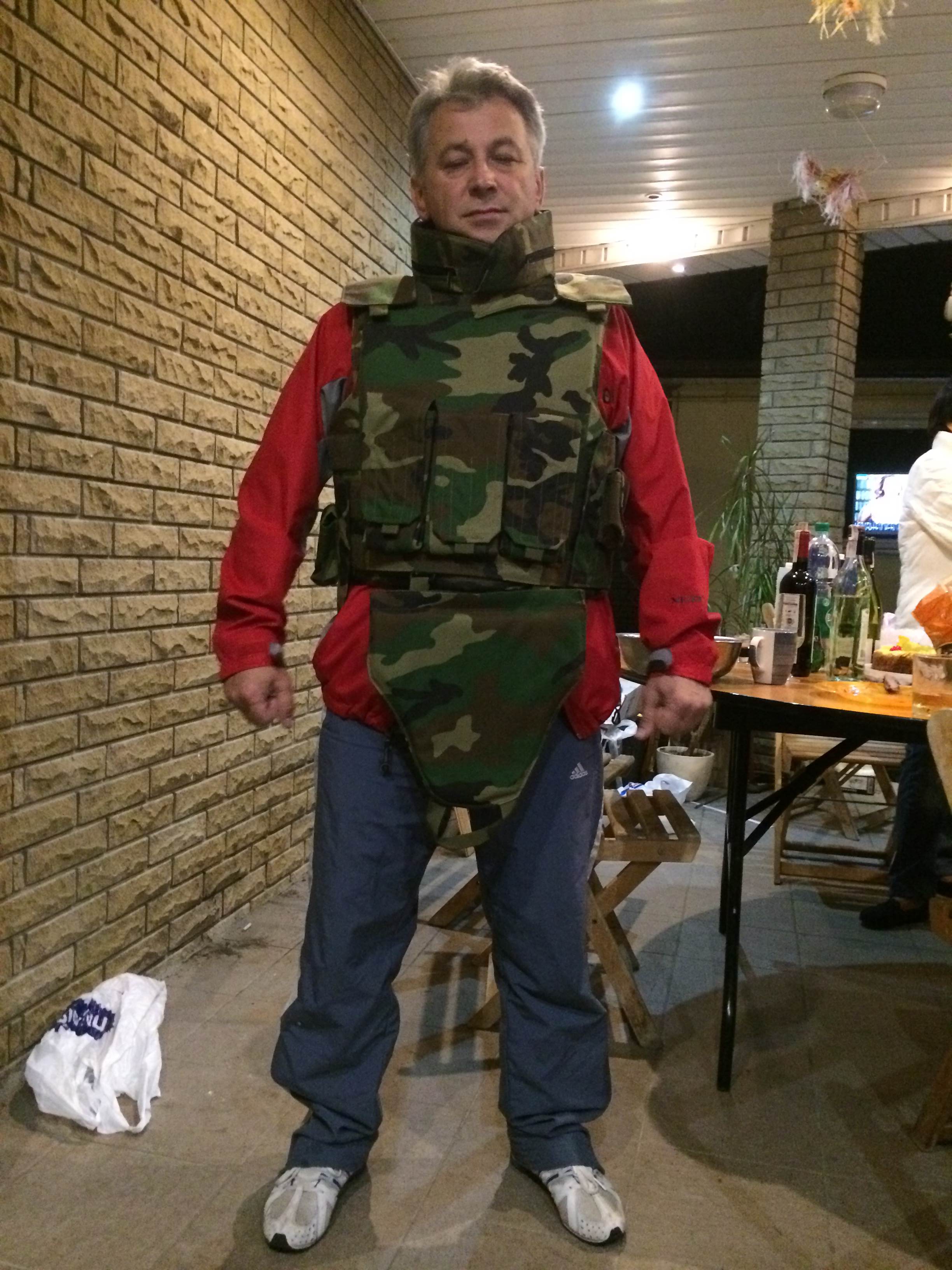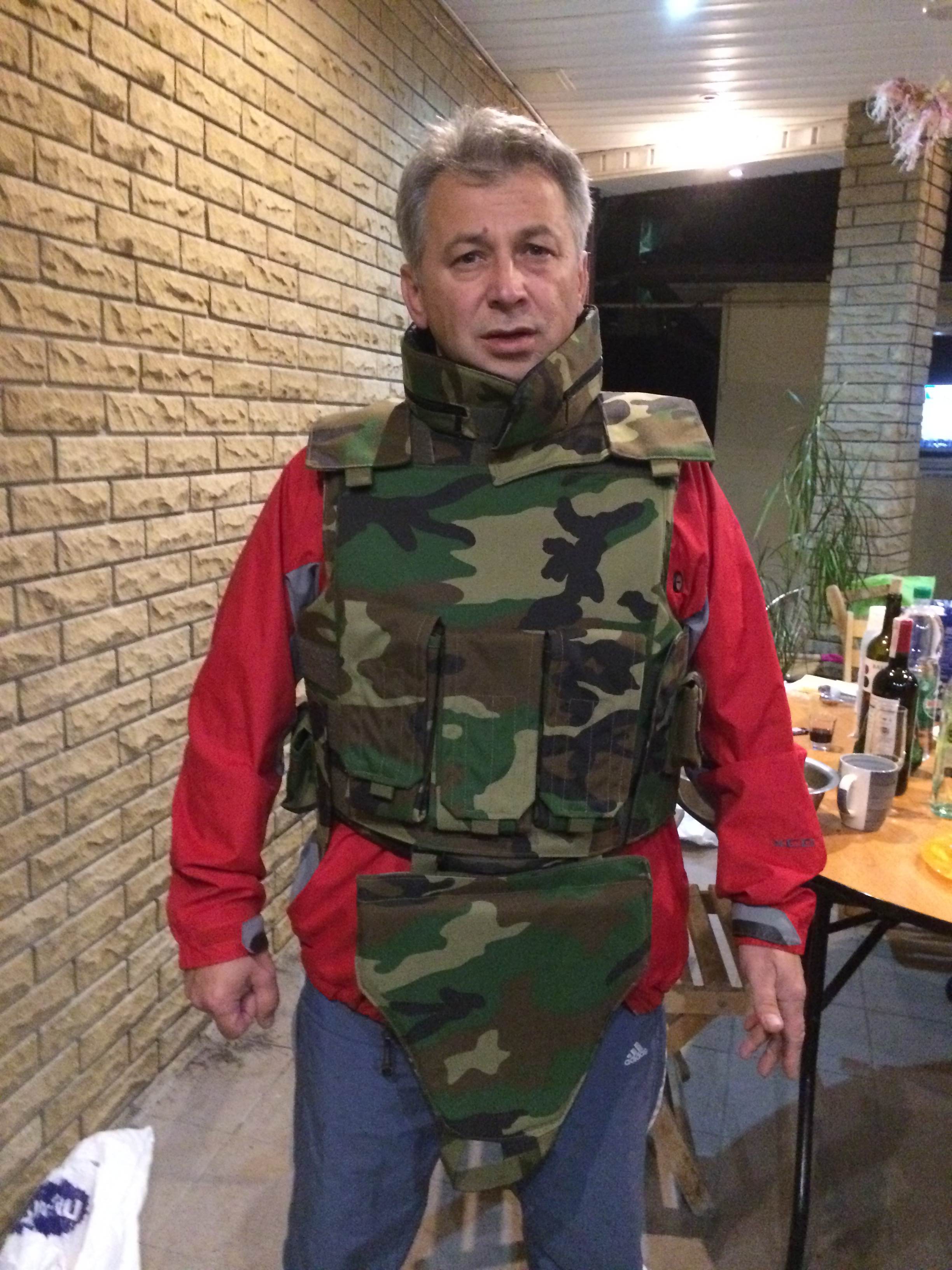 Шлем кевларовый, выдерживает выстрел с 5-ти метров из ПМ и какого-то Люгера (есть видео). Стоимость - 175$. Поставили мы ещё броники 4-го класса, вес 5,5кг., стоимость - 750$.