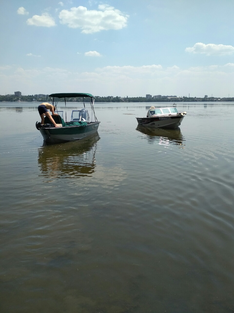15.07.2017, я (75 кг), тесть (110 кг), кум (110 кг), вещи (60 кг), бензин (!00 литров) в 7-00 отправились в путь. Путешествие началось с того, что предварительно заправленные 60 литров топлива в кормовые баки вкупе с 110 килограмовым мотором. дали перевес и лодка сделав кобру гепнулась на корму, слава богу мотор был поднят. Затащили лодку на тележку с помощью лебедки, а потом спустили с тестем и кумом на носу как противовес.