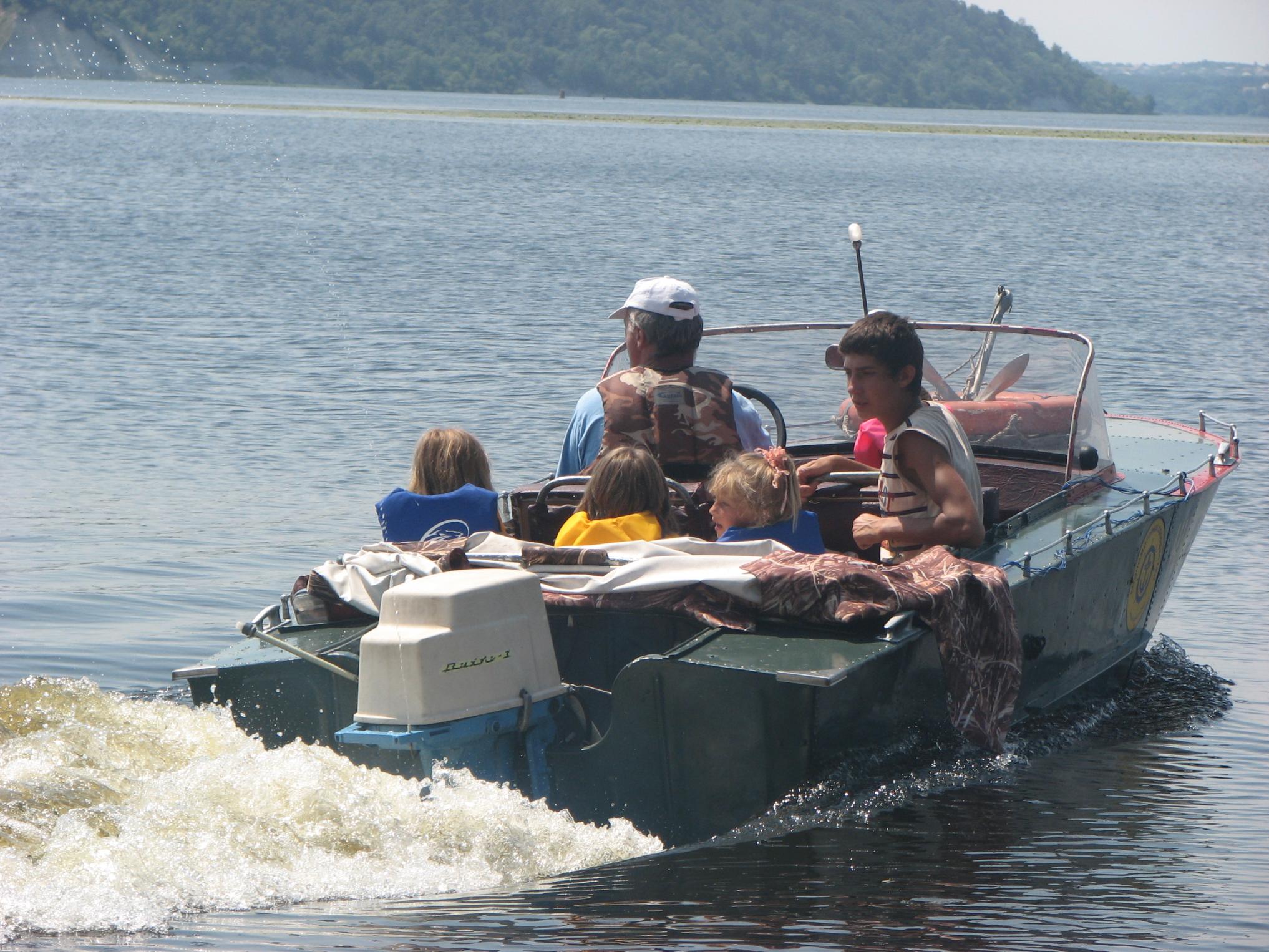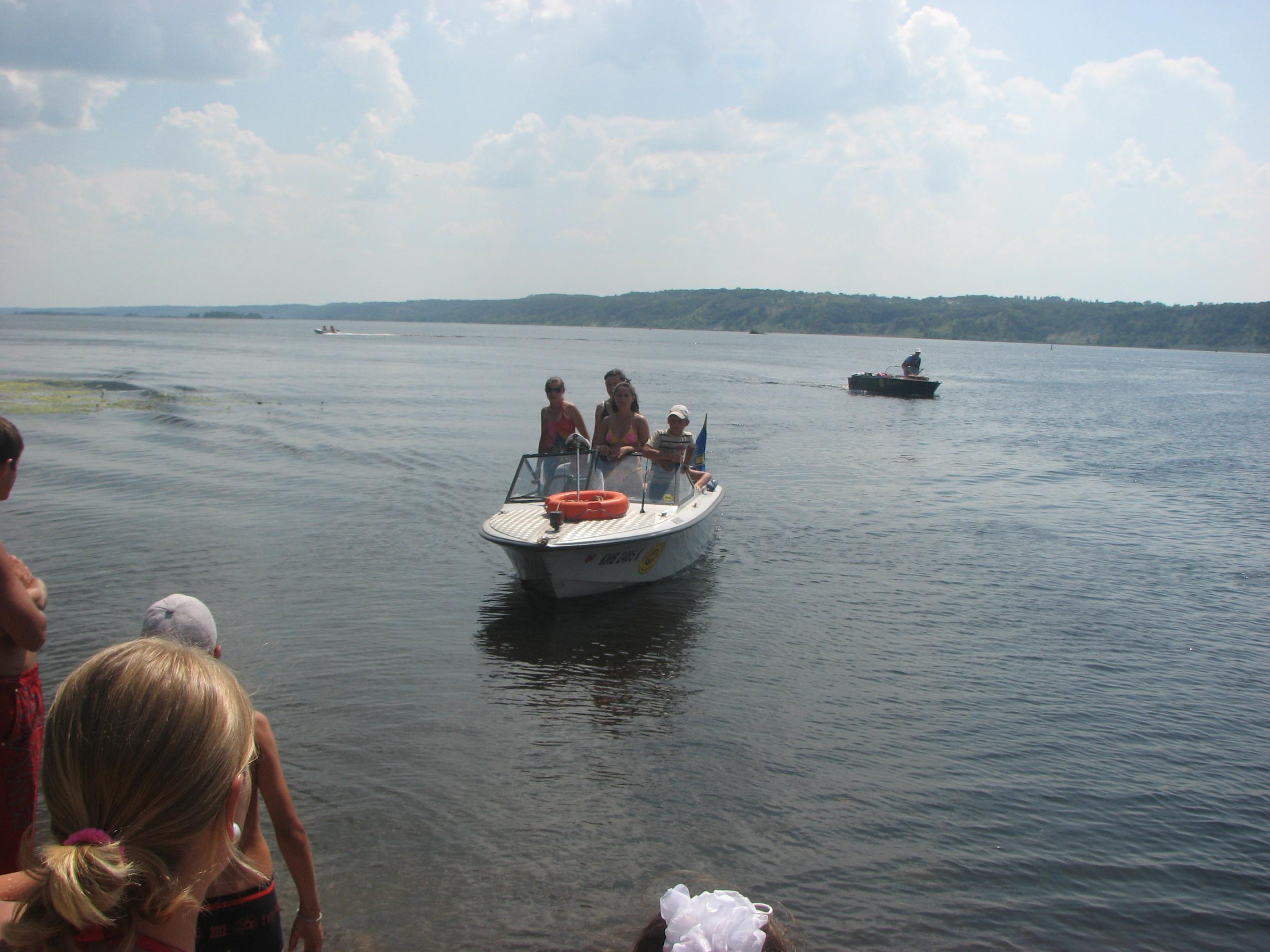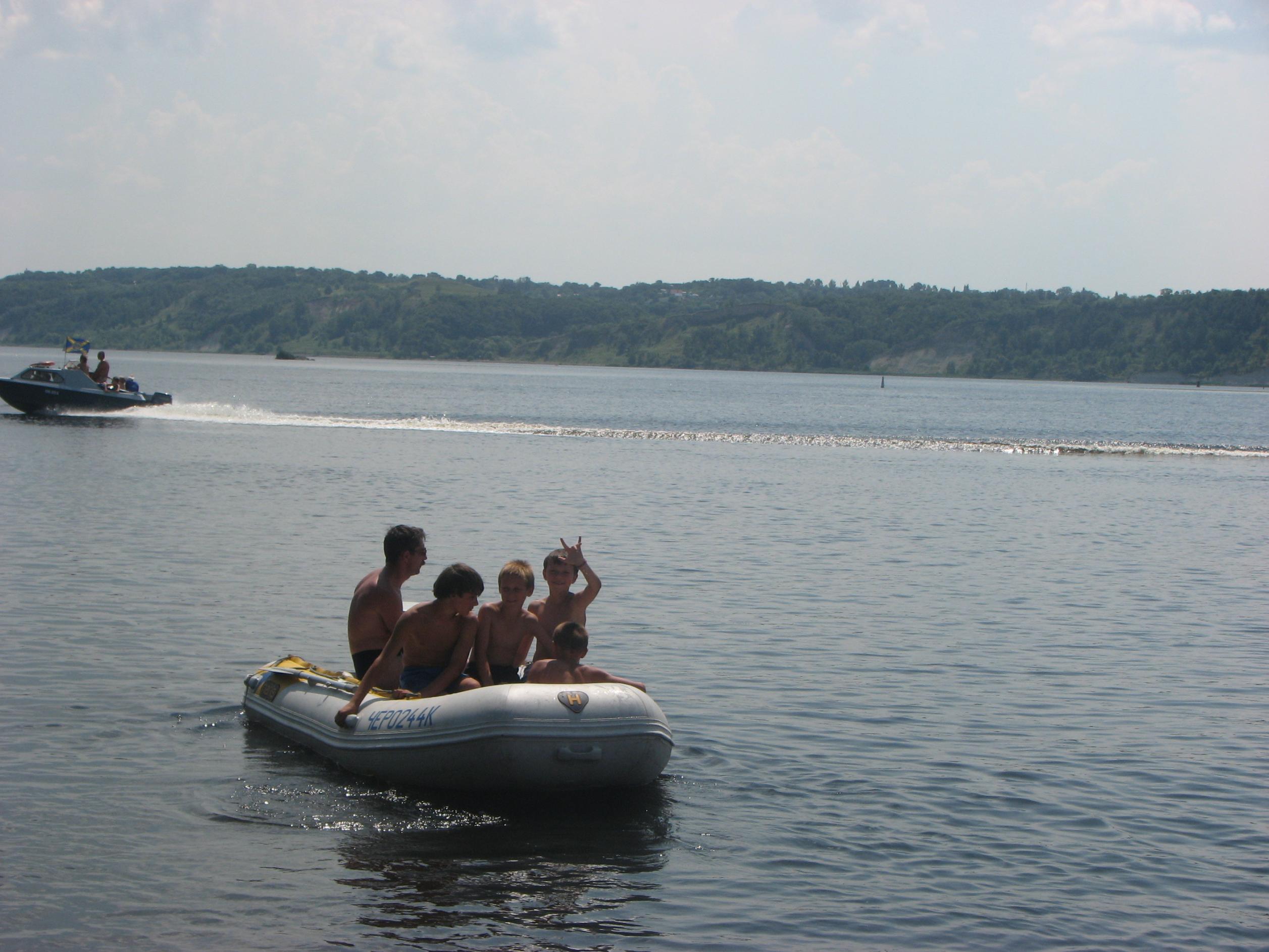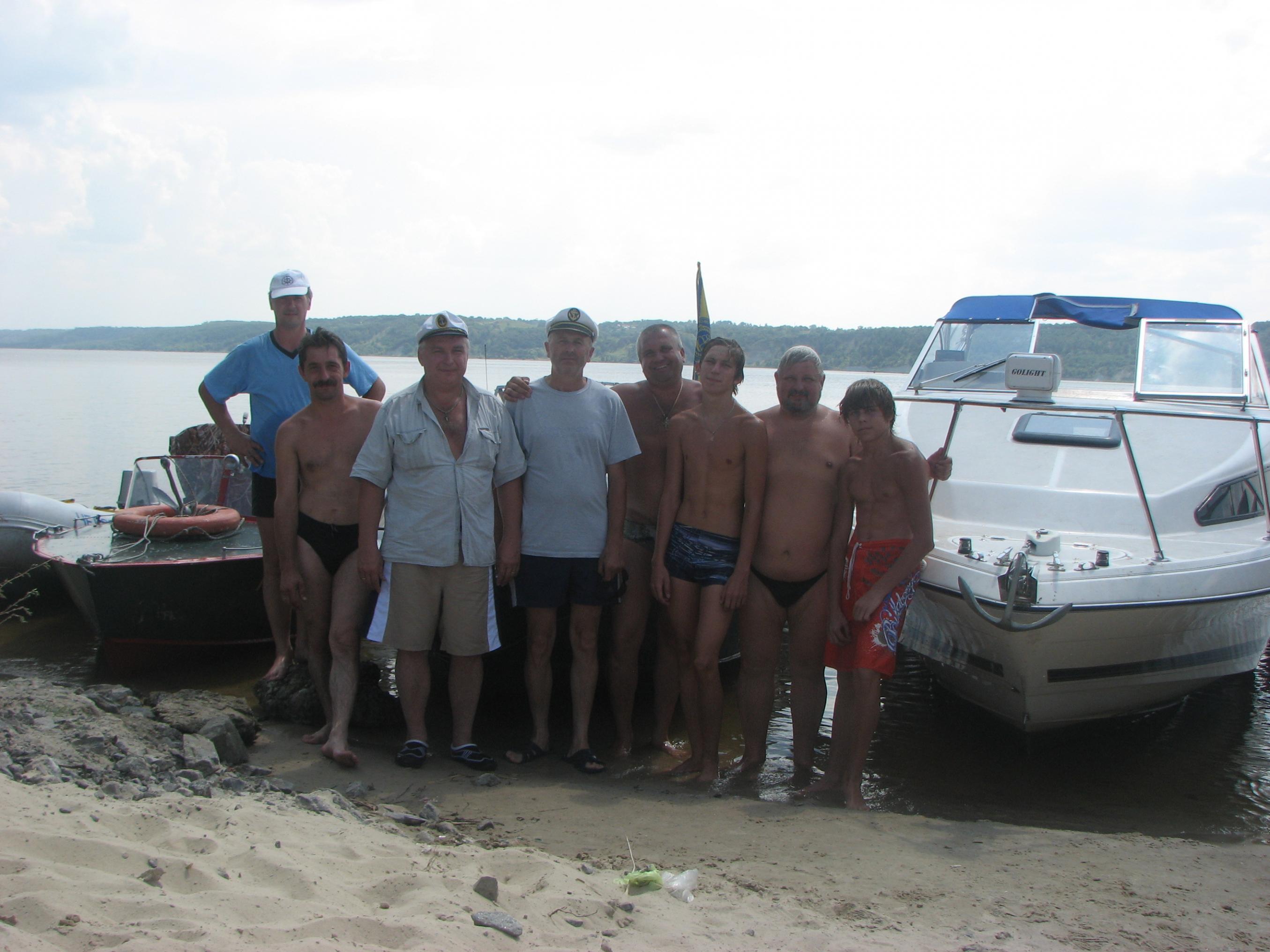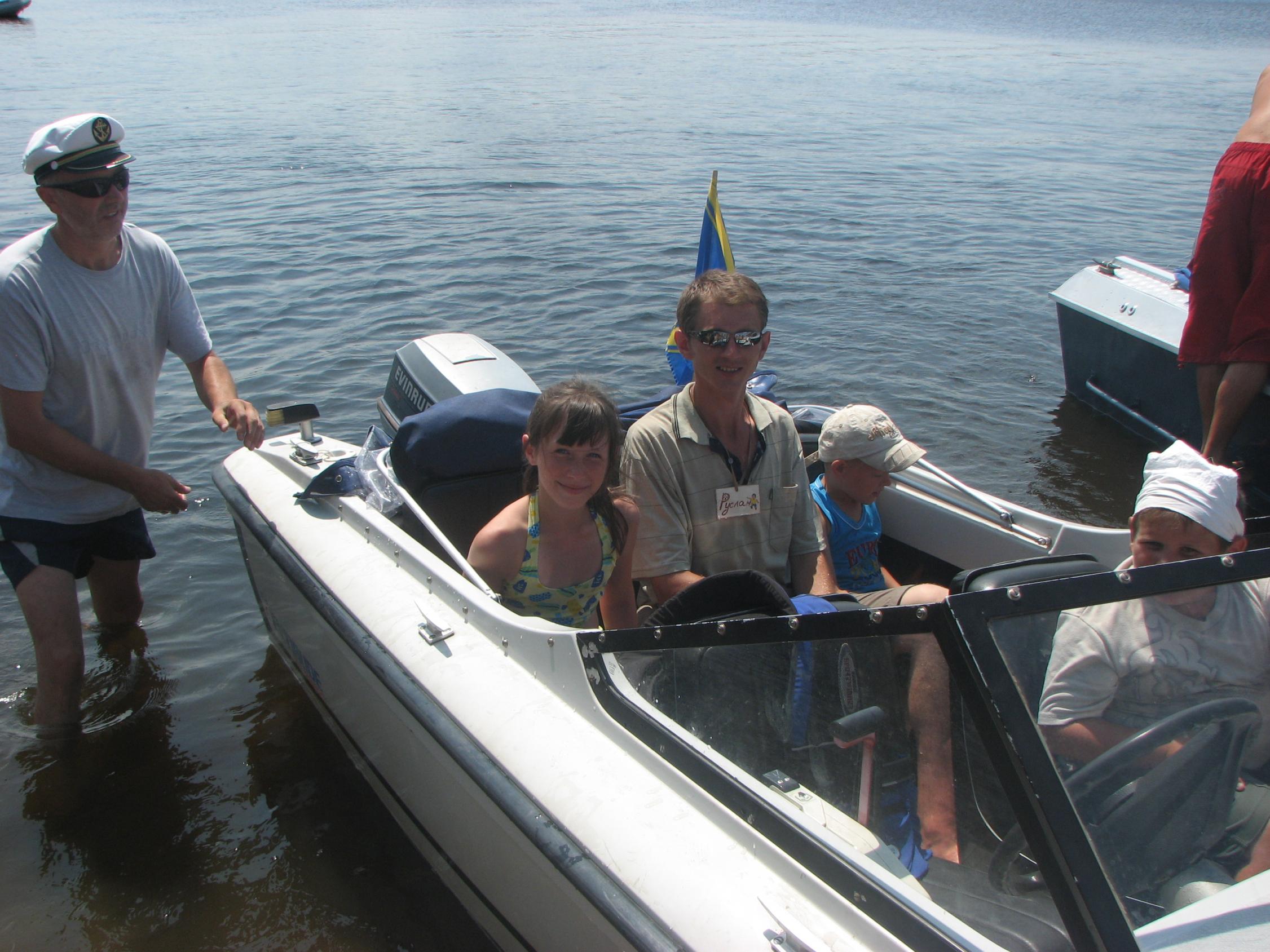 На Ривьере никого! Звоню:" Ты где?". -Я напротив нашего острова! Вобщем, догнали мы Вовчика ещё км. через пять! Стали ему в кильватер и так шли до Украинки! Скорость у Вовчика была 35.5 км. Пройдя Украинку, обнаруживаем несоответствие номеров бакенов на карте и на воде, поэтому немного блуканули! По карте мы должны уйти на левый берег на 81 буе, а на самом деле ушли на 75. Ну, да ладно! Дорога заняла 1.5 часа, и получилось ровно 60км.Прийдя на пристань, увидели , что нас уже ждут. Поговорив с директором лагеря, и сказав ему что остальные на подходе, он ответил что привезут детей к 13.00, и уехал в лагерь. Буквально через 15минут пришли и остальные! Витя Мерлин уже перечислил экипажи! ![]() В начале второго привезли детей. И когда все были на берегу, подошёл Саня СТП, чем вызвал у детей невиданый восторг от своего корабля! Забегая наперёд скажу, что все дети захотели хоть раз прокатиться на Святой Наталии! Что в дальнейшем и было сделано!Начались покатухи! Решили катать на правый берег и обратно! Получился целый конвеер, одни выгружаются, другие загружаются! У меня получилось прим.6-7 ходок. Накатавшись, нас поблагодарили от всей души, сказав, что ничего подобного в своей жизни они не видели! Приглашали нас на ужин, но мы культурно отказались, надо было тулить домой. Мы заправились, накупались, и узнали, что к нам идёт Игорь Рино. Он заказал столик в ресторанчике в Украинке на берегу, и будет нас там ждать! Мы прыгнули в корабли и погнали в Украинку! Встретились с Игорем, душевно посидели часик, пообщались. В 18.30 мы с Вовчиком погнали на Киев, а ребята ещё остались. На РОПе были в 20.15.В общей сложности за день вышло 135км., и спалил примерно 50-55 литров бенза!