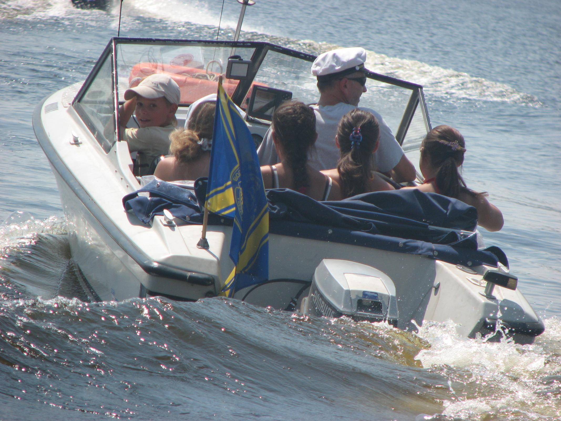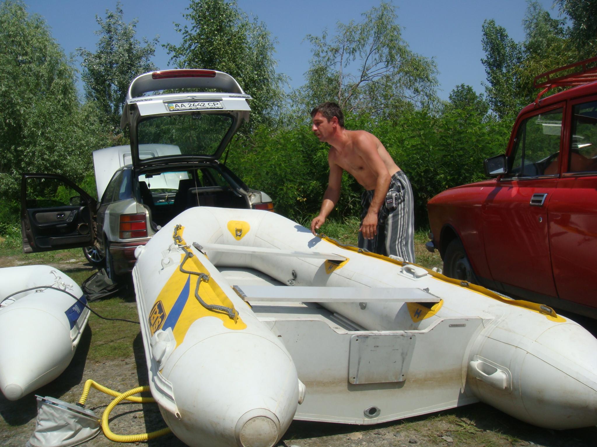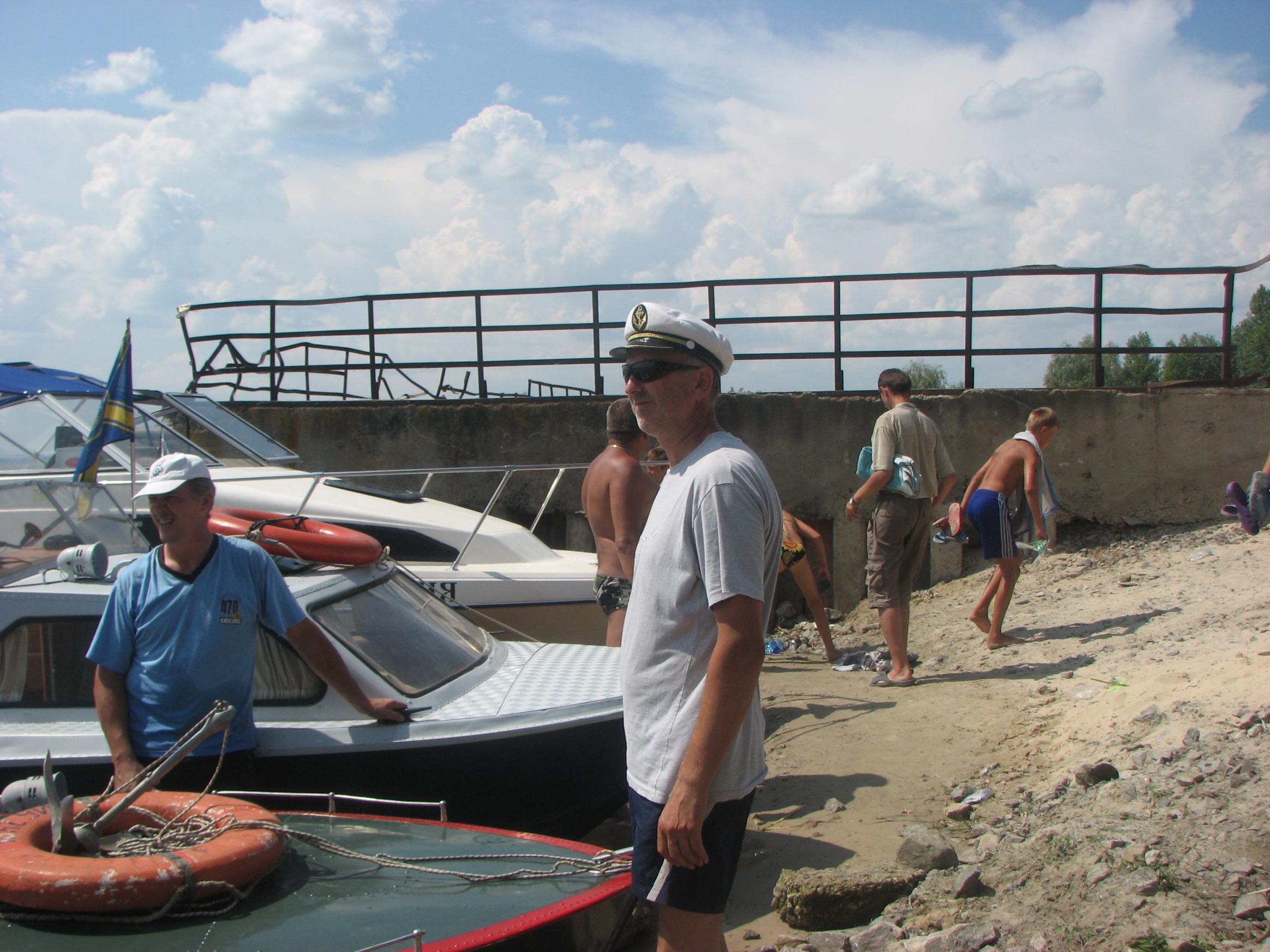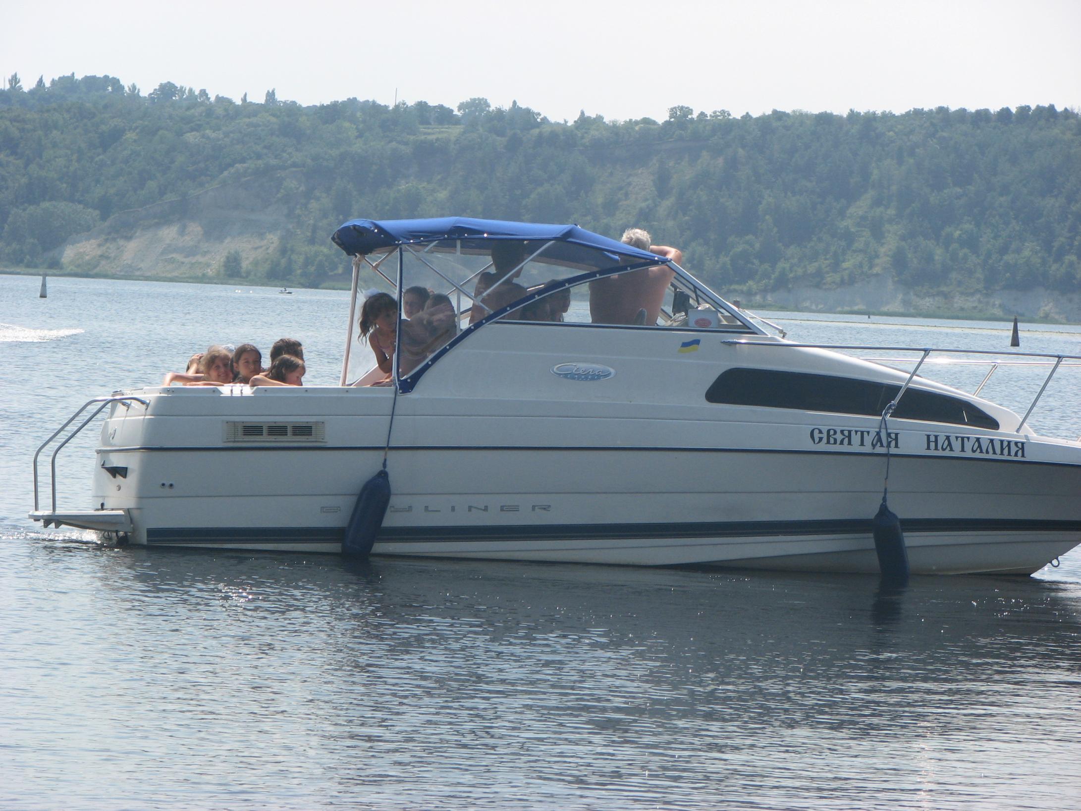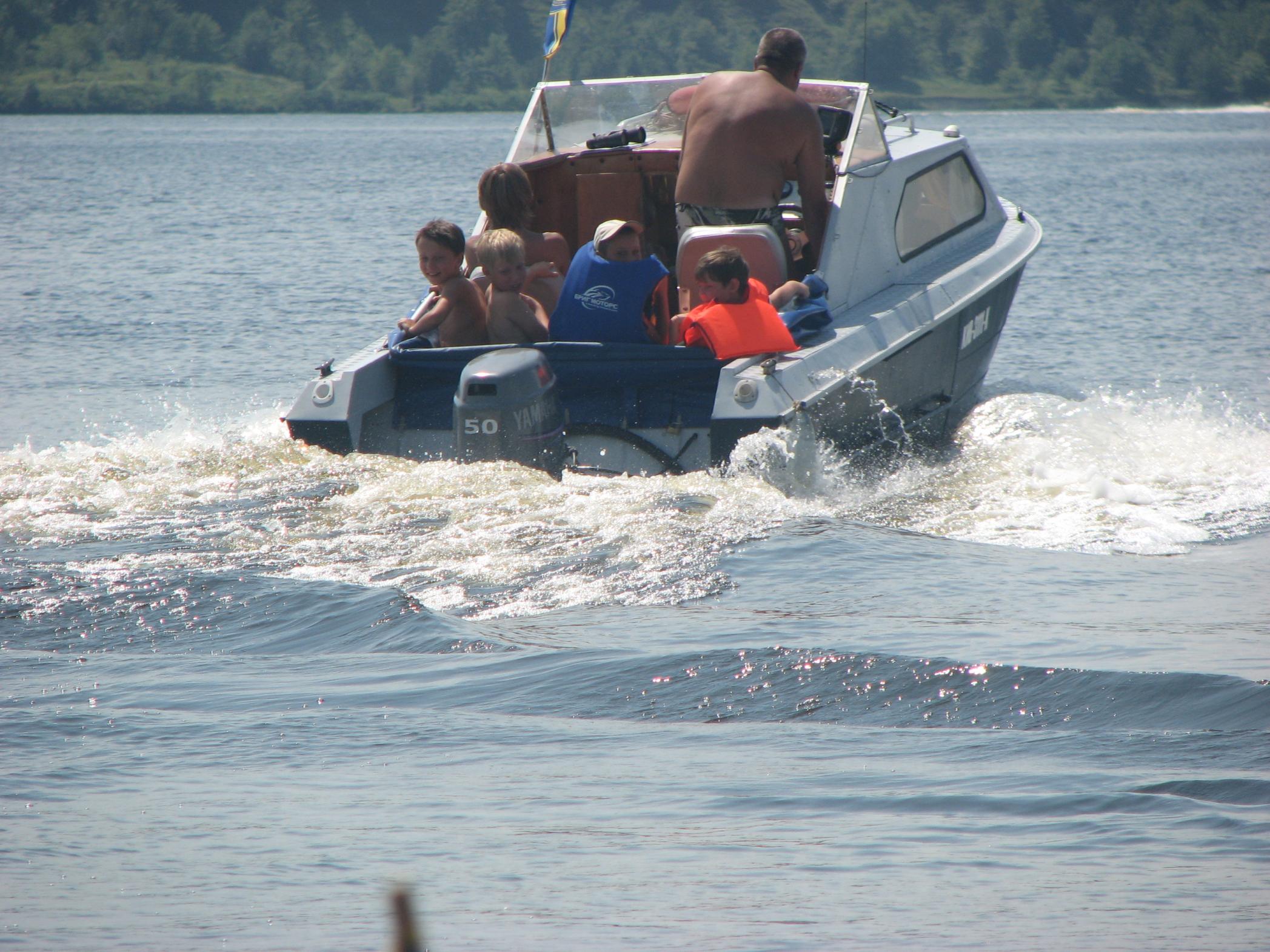 На Ривьере никого! Звоню:" Ты где?". -Я напротив нашего острова! Вобщем, догнали мы Вовчика ещё км. через пять! Стали ему в кильватер и так шли до Украинки! Скорость у Вовчика была 35.5 км. Пройдя Украинку, обнаруживаем несоответствие номеров бакенов на карте и на воде, поэтому немного блуканули! По карте мы должны уйти на левый берег на 81 буе, а на самом деле ушли на 75. Ну, да ладно! Дорога заняла 1.5 часа, и получилось ровно 60км.Прийдя на пристань, увидели , что нас уже ждут. Поговорив с директором лагеря, и сказав ему что остальные на подходе, он ответил что привезут детей к 13.00, и уехал в лагерь. Буквально через 15минут пришли и остальные! Витя Мерлин уже перечислил экипажи! ![]() В начале второго привезли детей. И когда все были на берегу, подошёл Саня СТП, чем вызвал у детей невиданый восторг от своего корабля! Забегая наперёд скажу, что все дети захотели хоть раз прокатиться на Святой Наталии! Что в дальнейшем и было сделано!Начались покатухи! Решили катать на правый берег и обратно! Получился целый конвеер, одни выгружаются, другие загружаются! У меня получилось прим.6-7 ходок. Накатавшись, нас поблагодарили от всей души, сказав, что ничего подобного в своей жизни они не видели! Приглашали нас на ужин, но мы культурно отказались, надо было тулить домой. Мы заправились, накупались, и узнали, что к нам идёт Игорь Рино. Он заказал столик в ресторанчике в Украинке на берегу, и будет нас там ждать! Мы прыгнули в корабли и погнали в Украинку! Встретились с Игорем, душевно посидели часик, пообщались. В 18.30 мы с Вовчиком погнали на Киев, а ребята ещё остались. На РОПе были в 20.15.В общей сложности за день вышло 135км., и спалил примерно 50-55 литров бенза!
