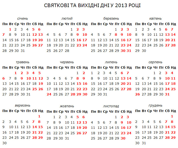 Пасха в 2013 году приходится на 5 мая (воскресенье). Согласно статье 67 КЗоТ, если праздничный или нерабочий день совпадает с субботой или воскресеньем, выходной день переносится на следующий после праздничного или нерабочего.