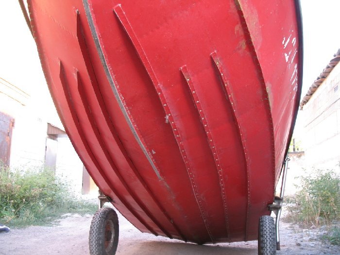 Из особых примет:1.Днище покрашено черным,верх-красный.2.По бокам катера наложены крепежи для транспортировачных колес.