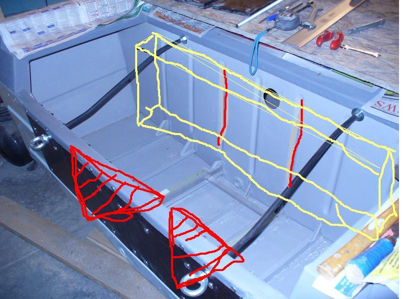 основная нагрузка идет не вверху транца на что цепляется мотор, а ниже, там где двигатель упирается при движении. Если внизу у двигателя есть не большое движение (играет когда даешь газ и когда сбрасываешь) он начинает рвать верхнюю часть транца. Если снять родную бакелитовую наружную доску транца, увидите большую вмятину на АМГ, т.к. с внутренней стороны транца приварен "швеллер" ( П ) пустотой во внутрь. Мне его вырезали так что бы остался уголок и закладывали дубовую доску. После ставили две косынки как на рисунке в том месте где крепится двигатель. (на рисунке показано двумя красными линиями, где родные вертикальные вмятины. На против них уголки) Желтым у меня стоит бак от ЗАЗ на 40 л п.с. как на Вашей фото не годиться, имхо
