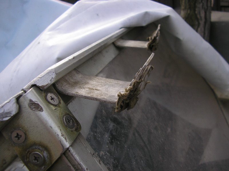 Скорей всего из тентового ПВХ. Как черновой вариант без проблем могу попробовать на имеющемся куске банерного ПВХ (хотя из него как раз получается отличных стояночный тент. Какие будут мнения и советы по поводу положения задней дуги, как будет практичней и удобней повыше и ближе к носу или пониже и ближе к корме? Вот прикинул в среднем положении По поводу фурнитуры, чем практичней (удобней в эксплуатации) крепить люверсами или кнопками? Под люверсы в принципе 6ть бронзовых и 4ре алюминиевых грибочка есть, в свое время токарь за банку кофе и пачку сигарет выточил. Кто что думает и знает по поводу родных креплений тента к рамке стекла? Есть у меня 4шт. Если нужно будет еще то они легко самостоятельно изготавливаются. Жду Ваших советов, предложений, критики