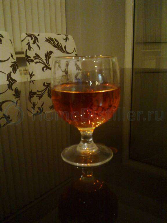 После перегона дистиллята доводим его до 45-47 градусов. Добавляем на 3 литра дистиллята пол чайной ложки пищевой соды (для ликвидации уксуса возникающего при соприкосновении дистиллята с воздухом) и размешиваем. Через 1 час добавляем немного марганцовки (цвет красный) и тщательно размешиваем. Через сутки фильтруем через вату 1-2 раза. Дальше фильтруем через угольный фильтр для очистки воды. Всё, дистиллят готов. Теперь орешки. Целый орех использовать не надо. Нужны только скорлупки. Ставим на огонь старенькую кастрюльку с 1-2 литрами воды и высыпаем скорлупки - 1 стакан. Доводим до кипения и кипятим 2-3 минуты. Сливаем жижу темно коричневого цвета, а скорлупки рассыпаем и высушивам. Дальше в 3 литра дистиллята высыпаем пол стакана скорлупок и ждем 10-15 часов. Вообще нужно периодически подходить и смотреть, как будет цвет хорошего коньяка то достаточно. Принимать можно сразу. Вкусно, напоминает виски. Идеальный цвет - янтарный. На фото моя продукция. Востаннє редагував c.sheep: 08.04.2014 о 21:29. Причина: читабельность |
