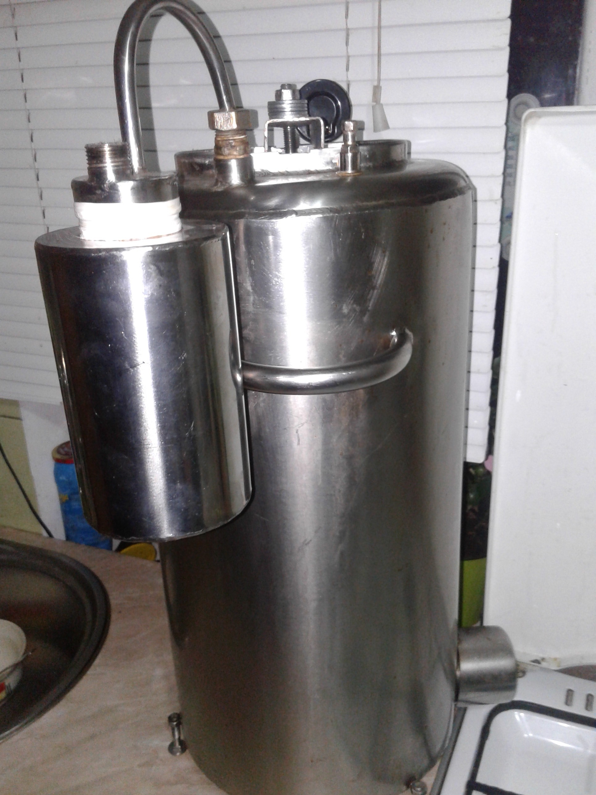 место для установки сбросного клапана становится выходом для пара,установив сухопарник,(барбадёр)кто как называет,предварительно насыпав туда зёрен кофе!!!для насыщения и получения аромата скажем так онлайн!проверив герметичность устанавливаем обычный проточный холодильник,у меня всё полностью из пищевой нержавейки)собираем все трубки и ждём температуру,начинаю где то около 88-89 градусов в "кубе"первые грамм сто на выбросить... дальше классика,выходим на 90- и выше по температуре и получаем продукт ![]() уже насыщенный кофейным вкусом и на вид с окраской...это не настоянный на чём то а тупо такой цвет на выходе сразу,чем больше зёрен в сухопарнике тем темнее получается продукт! вот фотоотчёт процесса) ![]() ![]() ![]() вот такой аппарат для маленькой кухни очень удобен!места мало производительность очень даже приличная,и выше правильно было сказано,неважно каков "куб",нагрели тоже как угодно,у меня электро,а можно и на газу,главное куда пошёл пар!!!сухопарники,холодильник,вот что главное...ну а что кому лучше,один или несколько сухопарников,колонны,ёмкости для насыщения...то всё опытным путём для удовлетворения индивидуального хотения