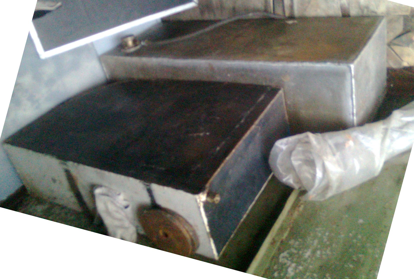 Расхламляю контейнер на РОПе, есть два бака. Первый, нержавейка, стоячий литров на 40. Второй алюминий, литров на 60.
