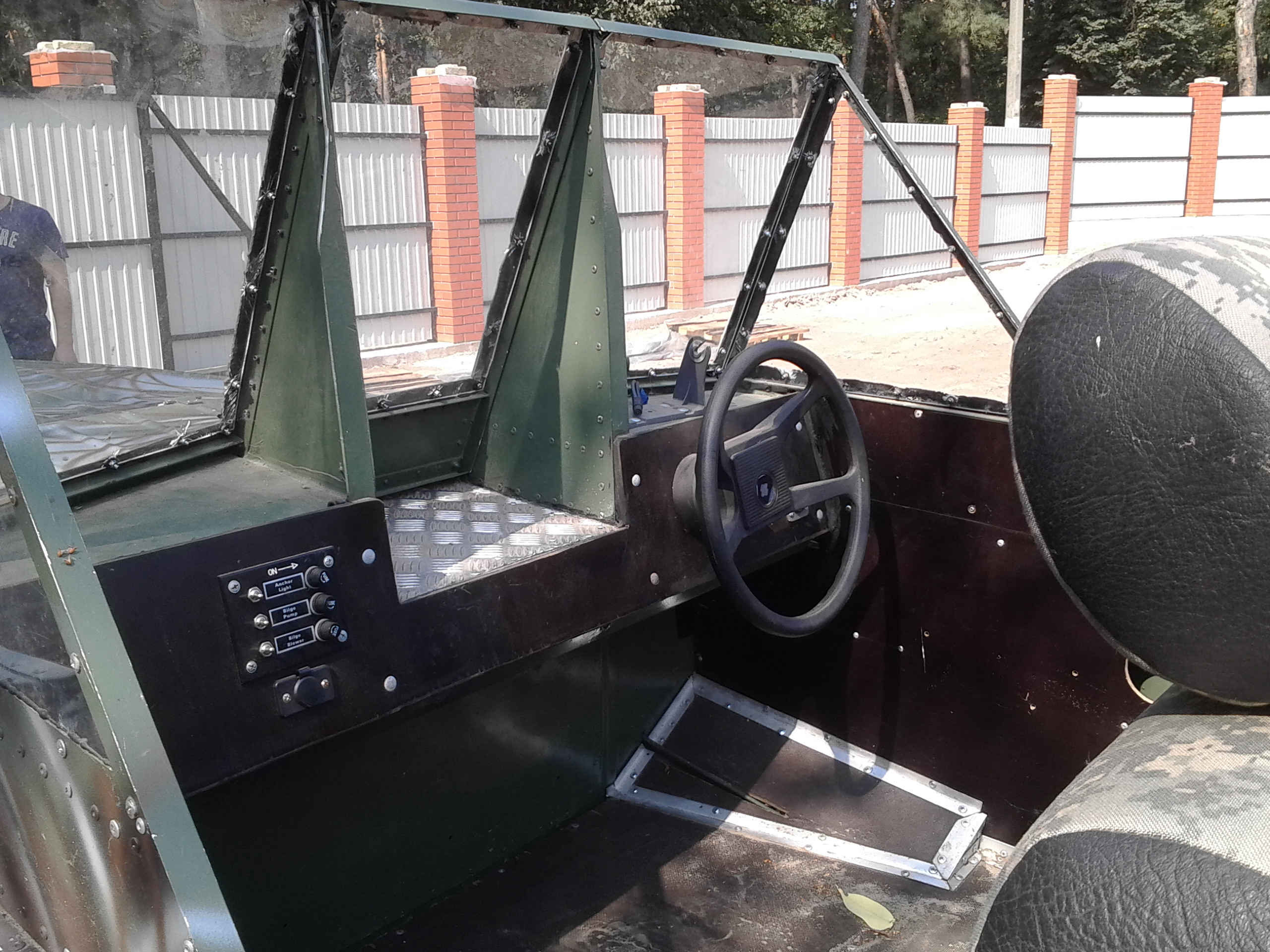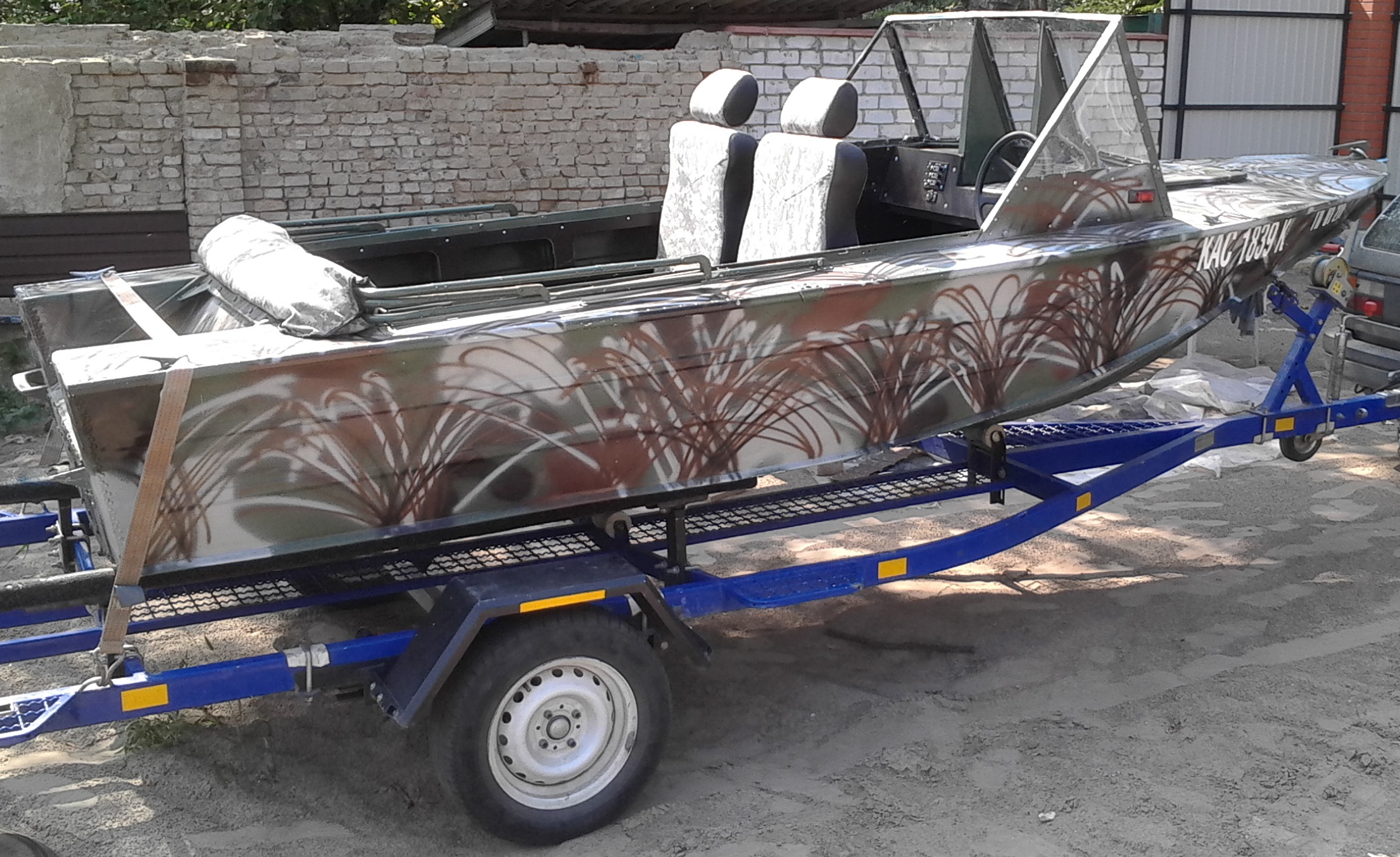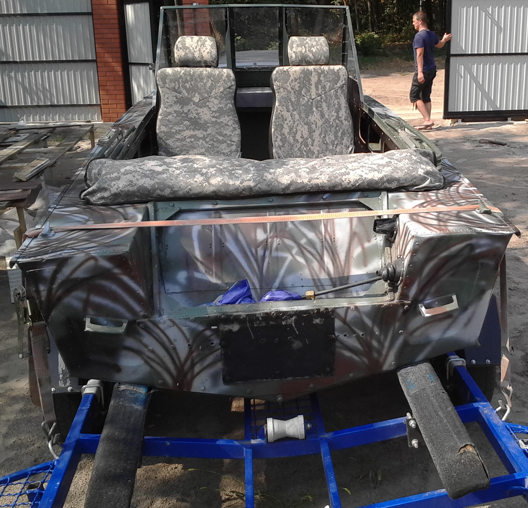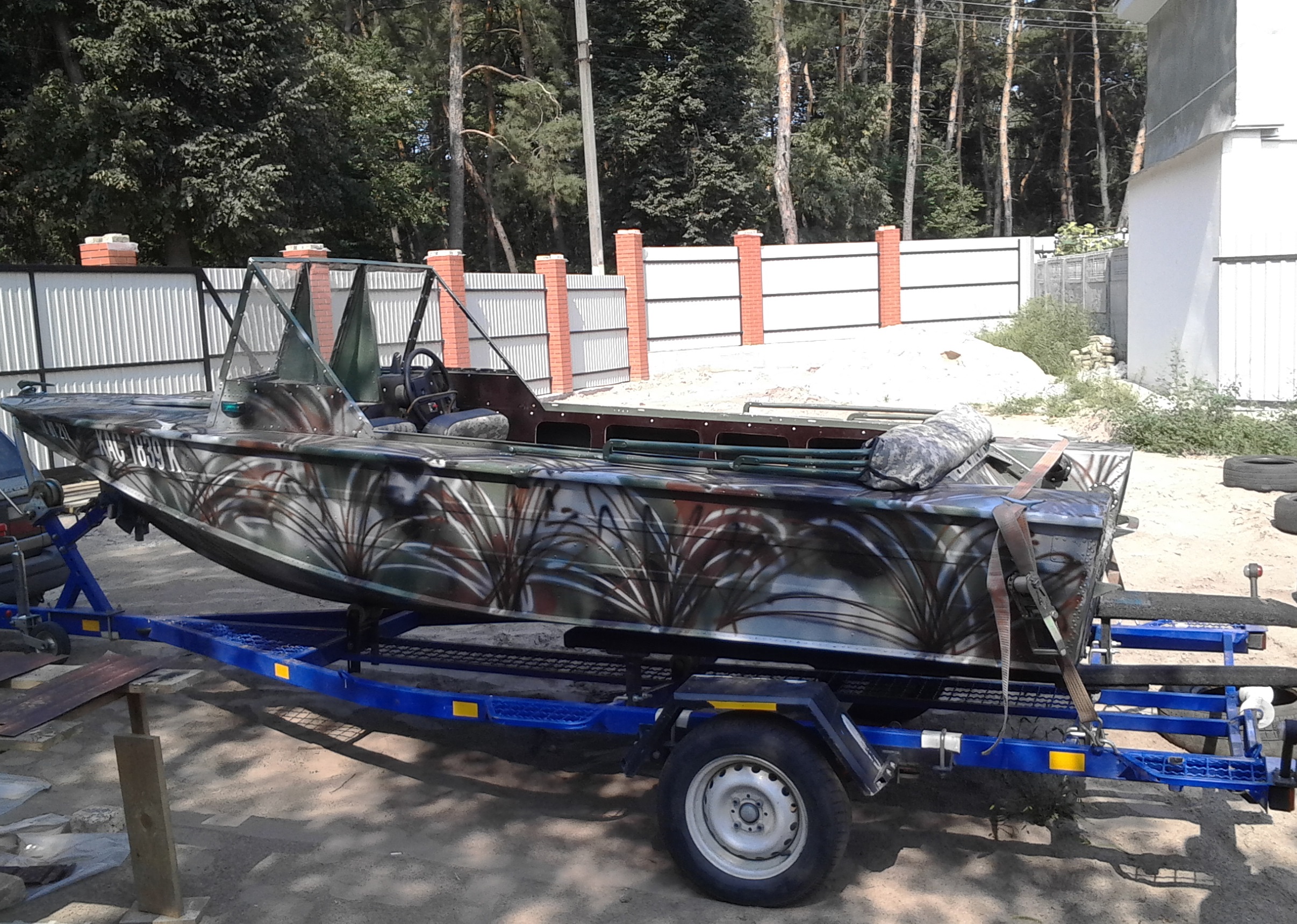 Цвет - камыш, хороший и ровный корпус, без вмятин и латок, в салоне обшита влагостойкой фанерой, рундуки, мягкие сидения, усилен транец под мотор до 60 л.с., хорошее стекло с форточкой, врезан люк, помпа для откачки воды, навигационные огни, переделана торпеда, панель приборов, тент.