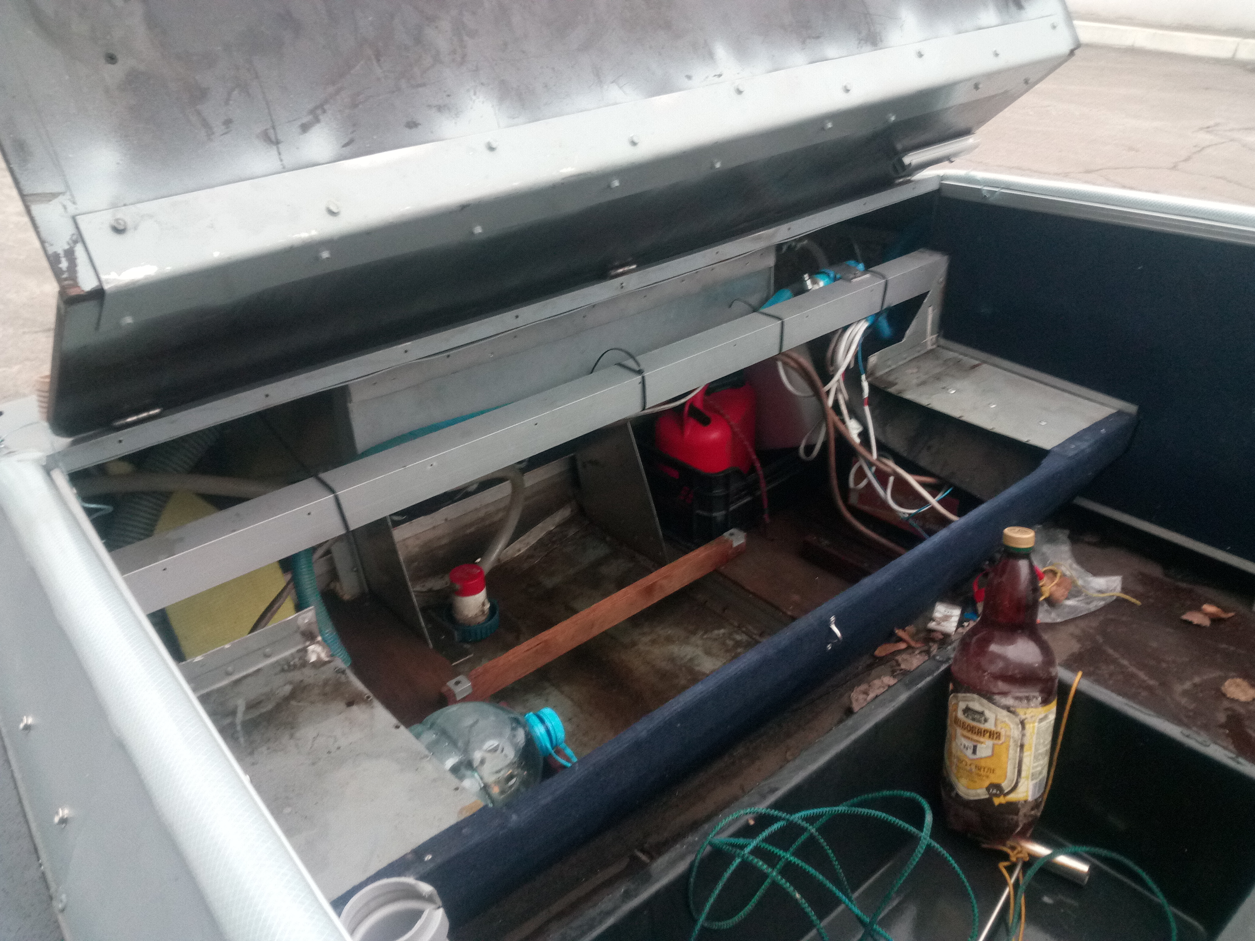 Встроенный бензобак на 60 л, помпа, "спрятанная" лебедка Str.35, новый ходовой тент, плавучесть-непотопляйка, эхолот Lowrance Elit-5HDI, ну и естественно стекло с форточкой.