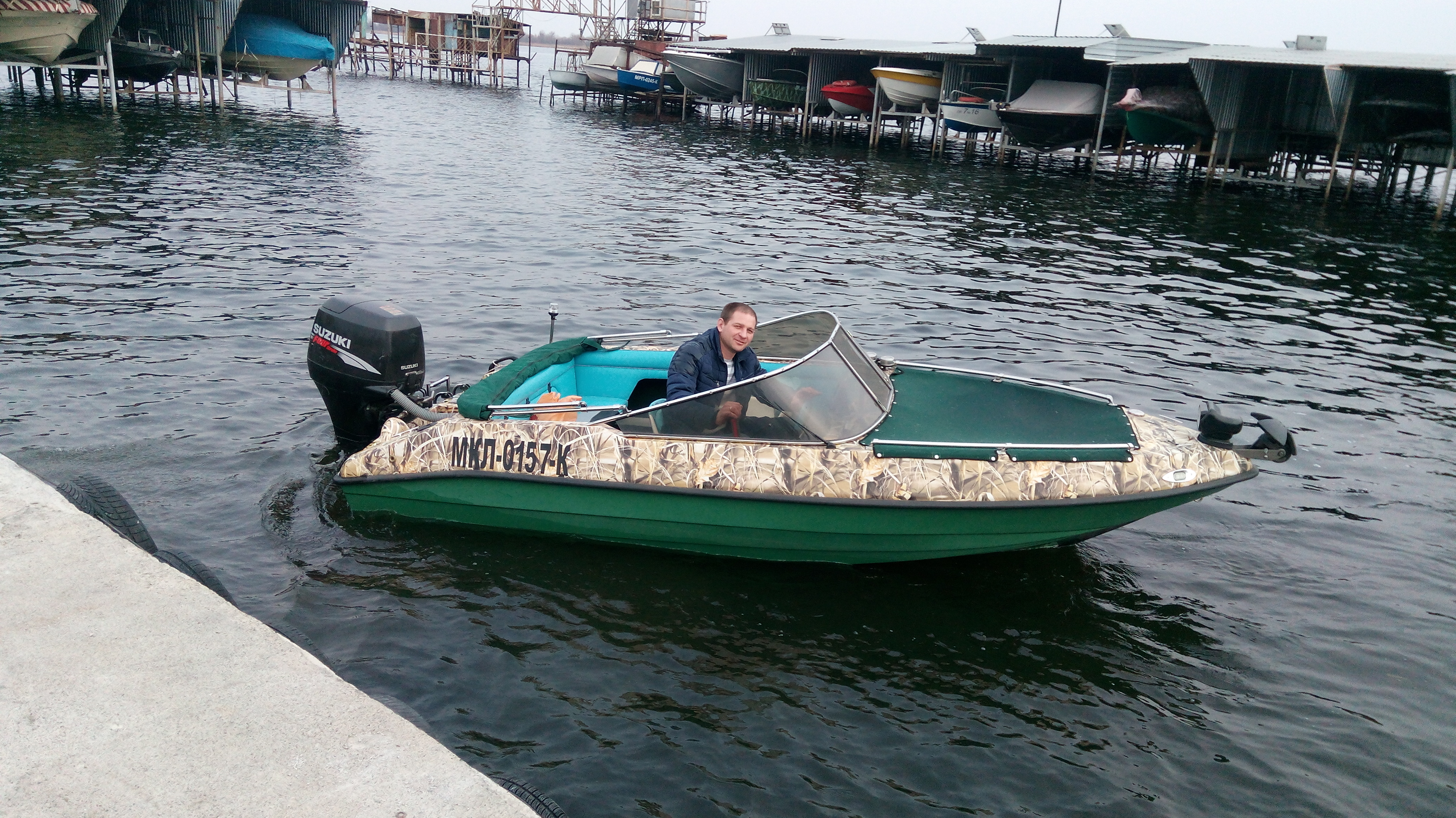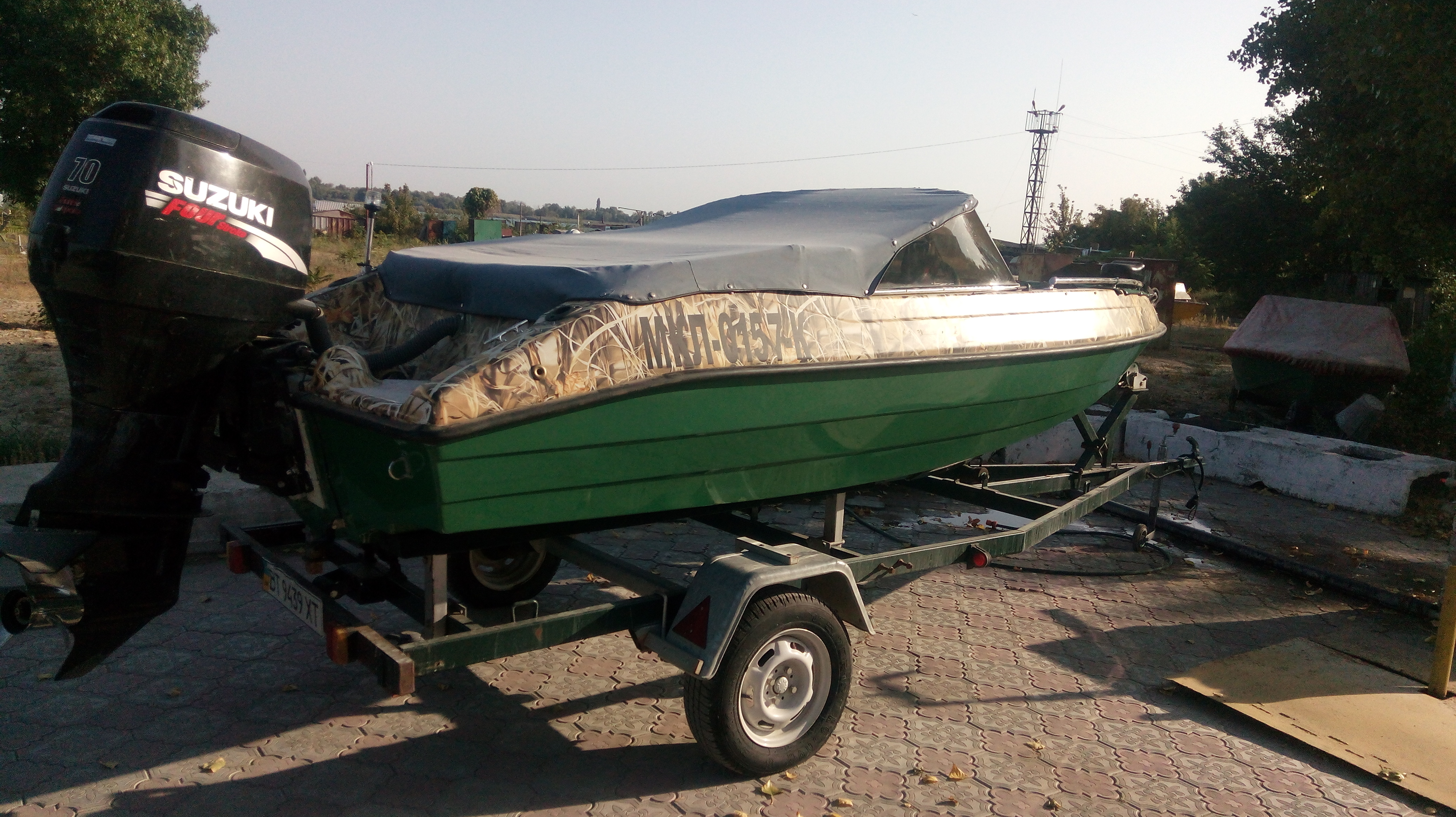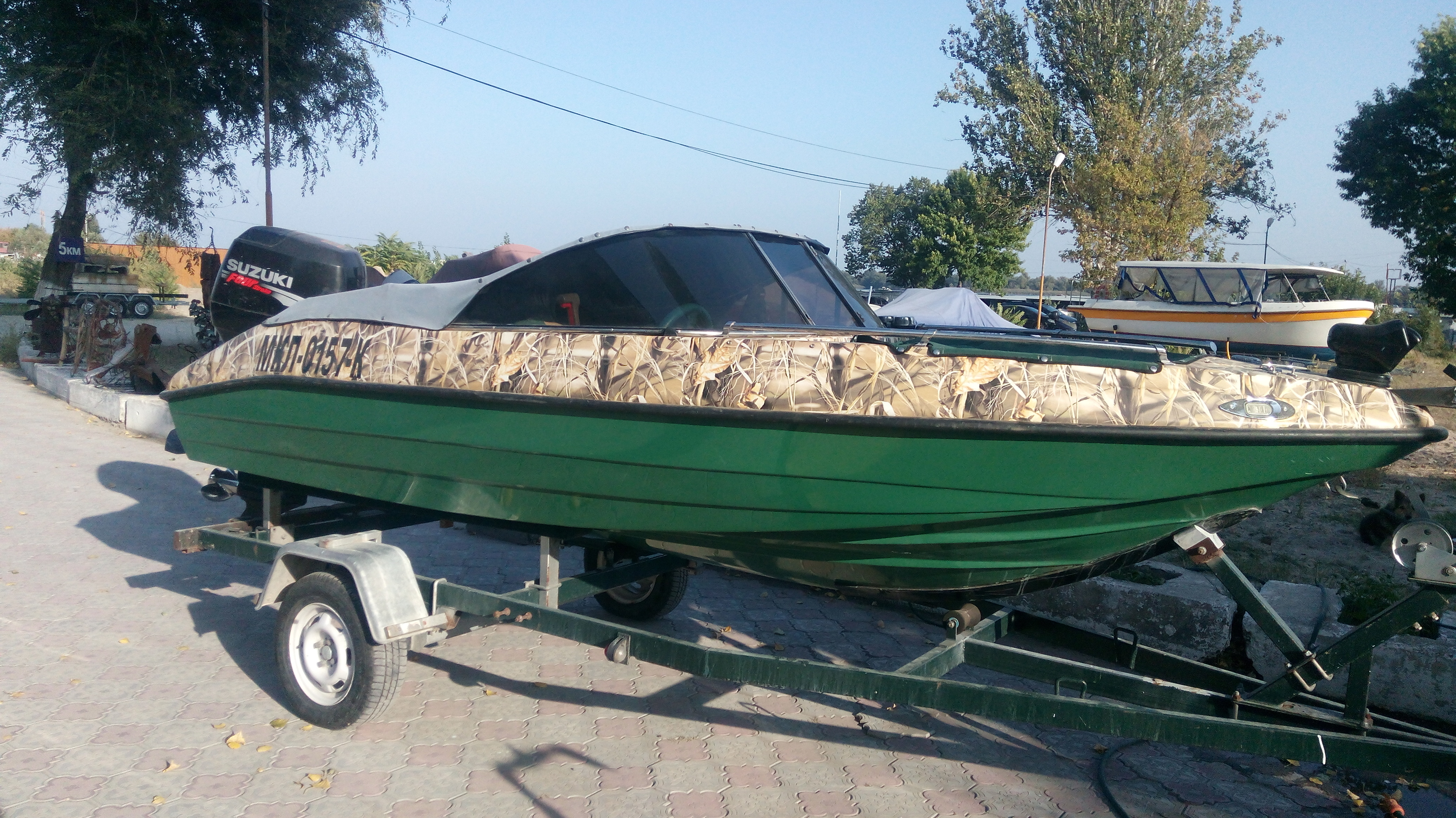 Классик 450, БЕЗ ЛАФЕТА Лодка зеленый пластик, верх оклеен пленкой под камыш. Двигатель Suzuki DF 70, голова 1500 кубиков. Дополнительно установлено гидрокрыло и полированый винт нержавейка. За задним съемным сиденьем ниша, в ней помпа и аккумулятор, и еще есть свободное место. В кокпите - передние сидения поворотные и съемные. Установлен командер и приборы( тахометр, уровень трима, уровень топлива), магнитофон в защитном коробе, 4 динамика. Стояночный Тент носовой части и отдельно кокпита, на нержавеющих кнопках. Ходовой тент - дуги и фурнитура нержавейка полированая, материал тента не пропускающий воду. Носовая часть имеет 2 подиума для сидения и сделана самоотливной. На носу установлен поворотный прожектор с пультом радио управления. Якорная лебёдка с функцией свободного падения, управление вынесено справа от руля. Так же есть съёмный задний топовый огонь и и передние габаритные огни. Есть 2 розетки 12В. Слева и справа ниши для вещей.