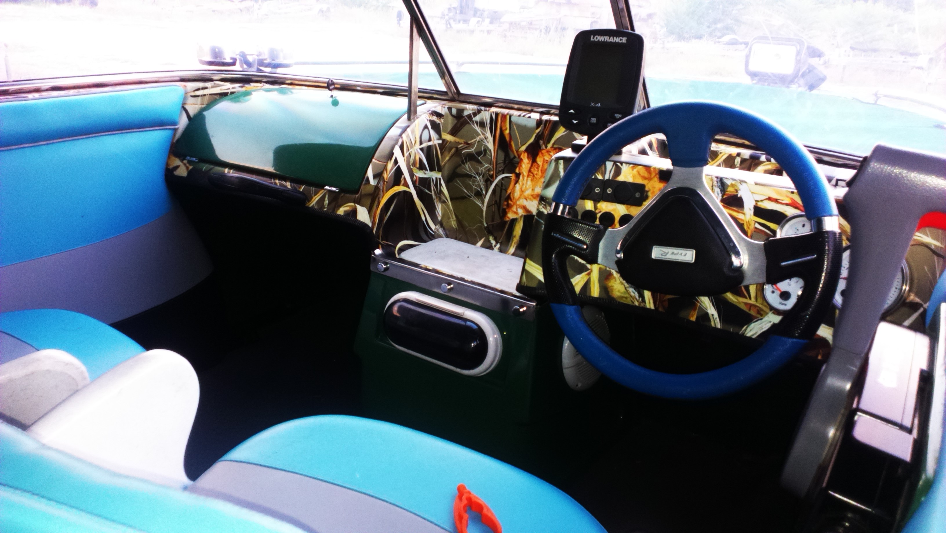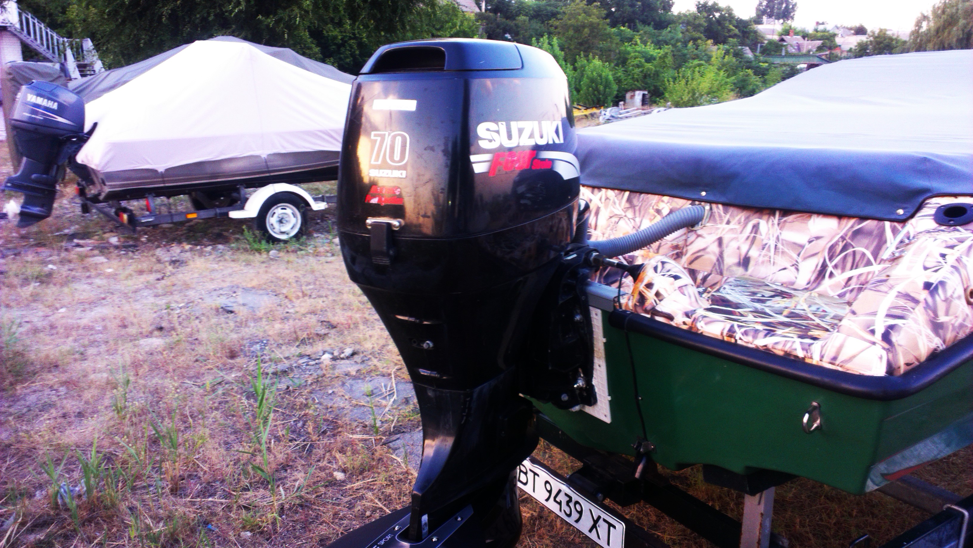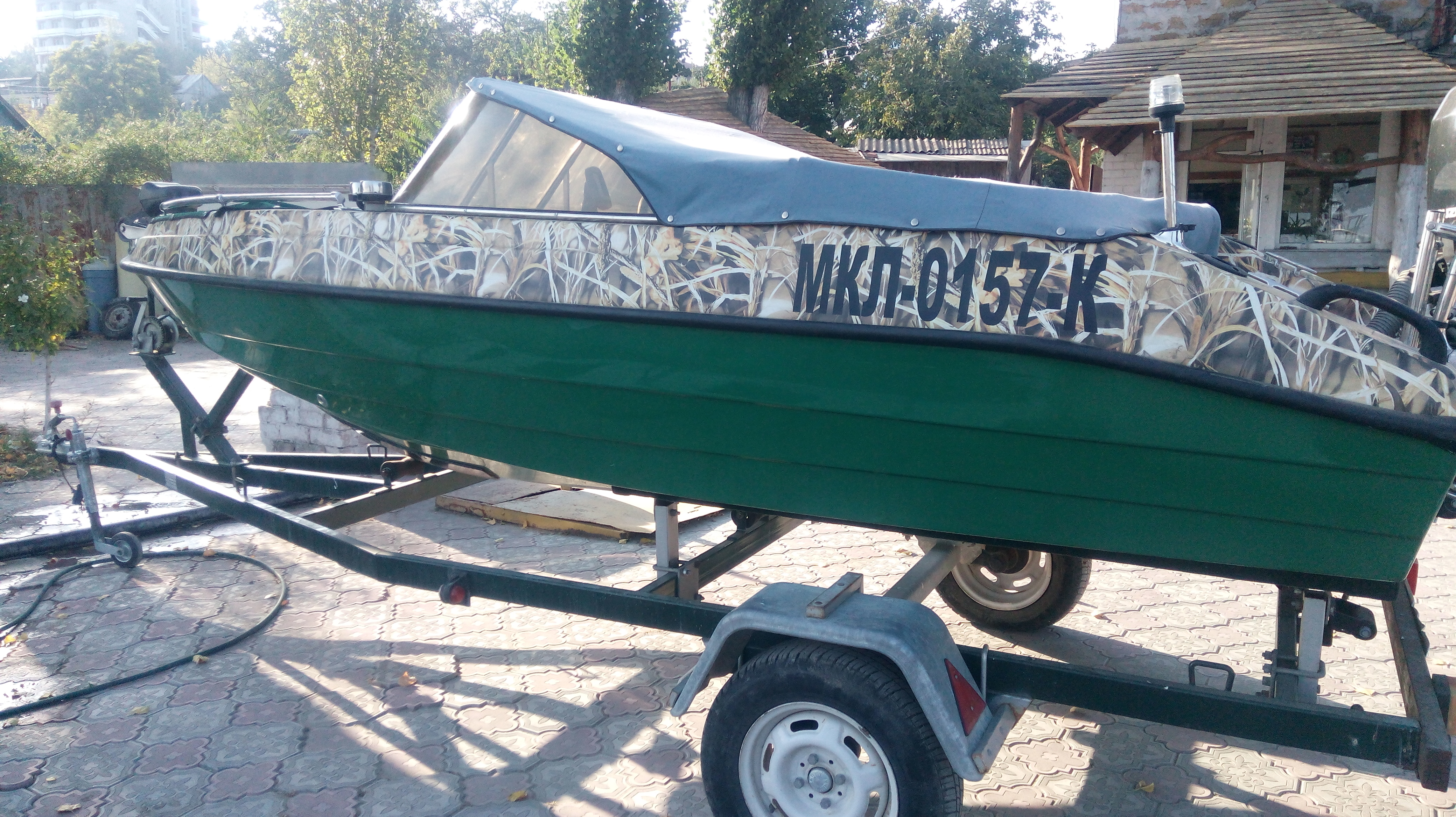Классик 450, БЕЗ ЛАФЕТА Лодка зеленый пластик, верх оклеен пленкой под камыш. Двигатель Suzuki DF 70, голова 1500 кубиков. Дополнительно установлено гидрокрыло и полированый винт нержавейка. За задним съемным сиденьем ниша, в ней помпа и аккумулятор, и еще есть свободное место. В кокпите - передние сидения поворотные и съемные. Установлен командер и приборы( тахометр, уровень трима, уровень топлива), магнитофон в защитном коробе, 4 динамика. Стояночный Тент носовой части и отдельно кокпита, на нержавеющих кнопках. Ходовой тент - дуги и фурнитура нержавейка полированая, материал тента не пропускающий воду. Носовая часть имеет 2 подиума для сидения и сделана самоотливной. На носу установлен поворотный прожектор с пультом радио управления. Якорная лебёдка с функцией свободного падения, управление вынесено справа от руля. Так же есть съёмный задний топовый огонь и и передние габаритные огни. Есть 2 розетки 12В. Слева и справа ниши для вещей.