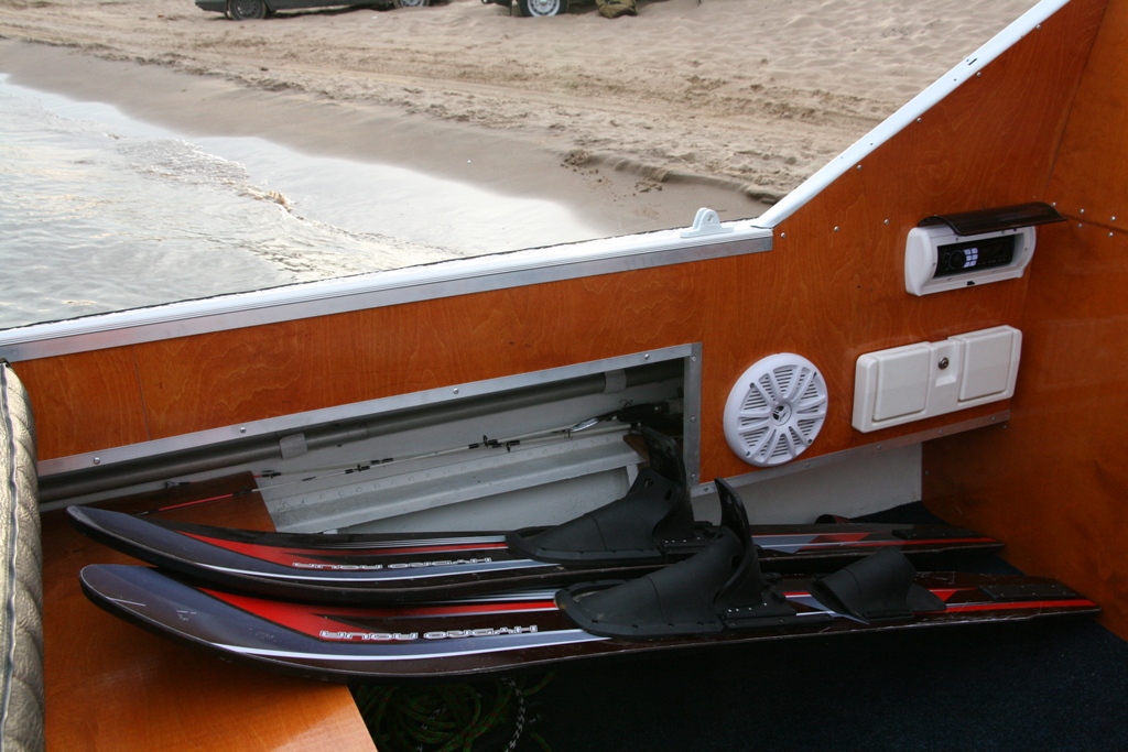У меня два весла, одно проговское укороченное, другое легкое короткое, оба лежат на пайолах по левому борту, под полкой. Собирался сделать для хранения весел крепления в виде паза для лопастей весел и скоб для веретен и ручек, под этой широкой полкой, но так и не сделал. Т.к. весла и так не мешают и главное --быстродоступны.