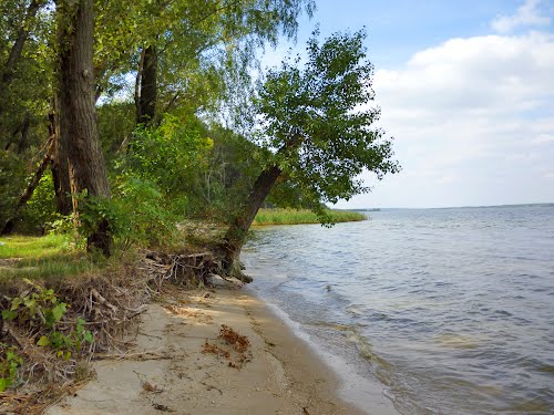Вскоре я въехал в село Радушное! Это моя первая победа - переехал на мопеде в другой населенный пункт. К технике претензий нет, но не думал, что мотор в дороге надо охлаждать. Также показалось, что цепь растянулась. Я на смартфоне увидел в гугл-картах, что уже близок от Южного водохранилища и по грунтовке доехал к нему. По описанию вспомнилось озеро Онтарио у Фенимора Купера в индейских краях. Это живописное водохранилище узкое и вытянутое, состоит из многочисленных заливов со спокойной водой без волн. Камыши.Тишина. Лодок нет - нерест. Рядом отдыхала стайка велотуристов. Ни тебе громыхающих в нашем городе поездов, ни фабрик. На берегу подкрепился тормозком. Вот ради таких минут, видимо, и стоит путешествовать. На воде можно находиться с лодкой только по сезону, зато на мопеде и велосипеде путешествовать можно всегда.