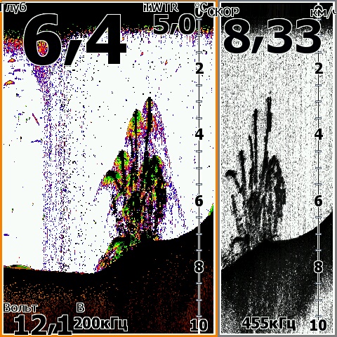 Как раз таки отличаются. Там даже принцип работы другой. С частотой 455 хуже видно, чем с 800. С 800, хоть какое-то подобие на рыбу можно различить. DSI, в цвете, кстати, не показывает. И дугами тоже рыбу не отображает. |