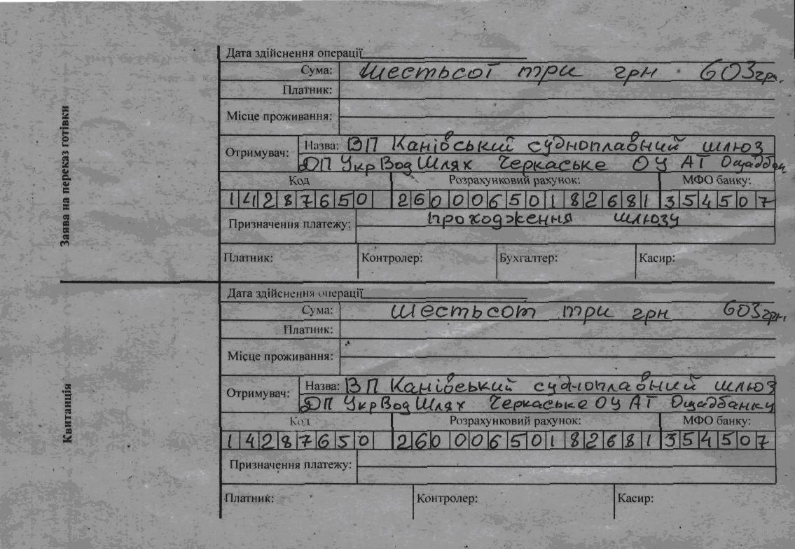 Выпросил у киевлян бумажку с реквизитами, по которым они платили за прохождение каневского шлюза. 603 грн - это плата за шлюзовку в обе стороны.