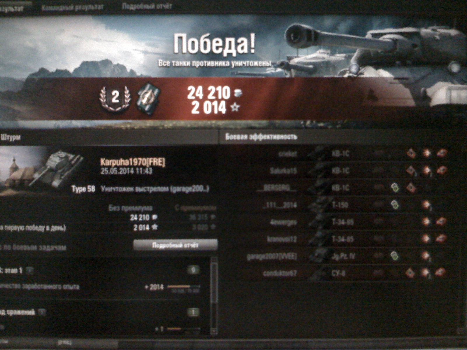 Оказывается можна и КВасы мочить китайсем тип-58.Нужён токо подход правильный.не знаю как скрины делать или как там.Фото сделал.Хотя в конце замочили.Похоже что арта долбонула. Сволочь. Востаннє редагував Вовчик: 26.05.2014 о 13:54. |