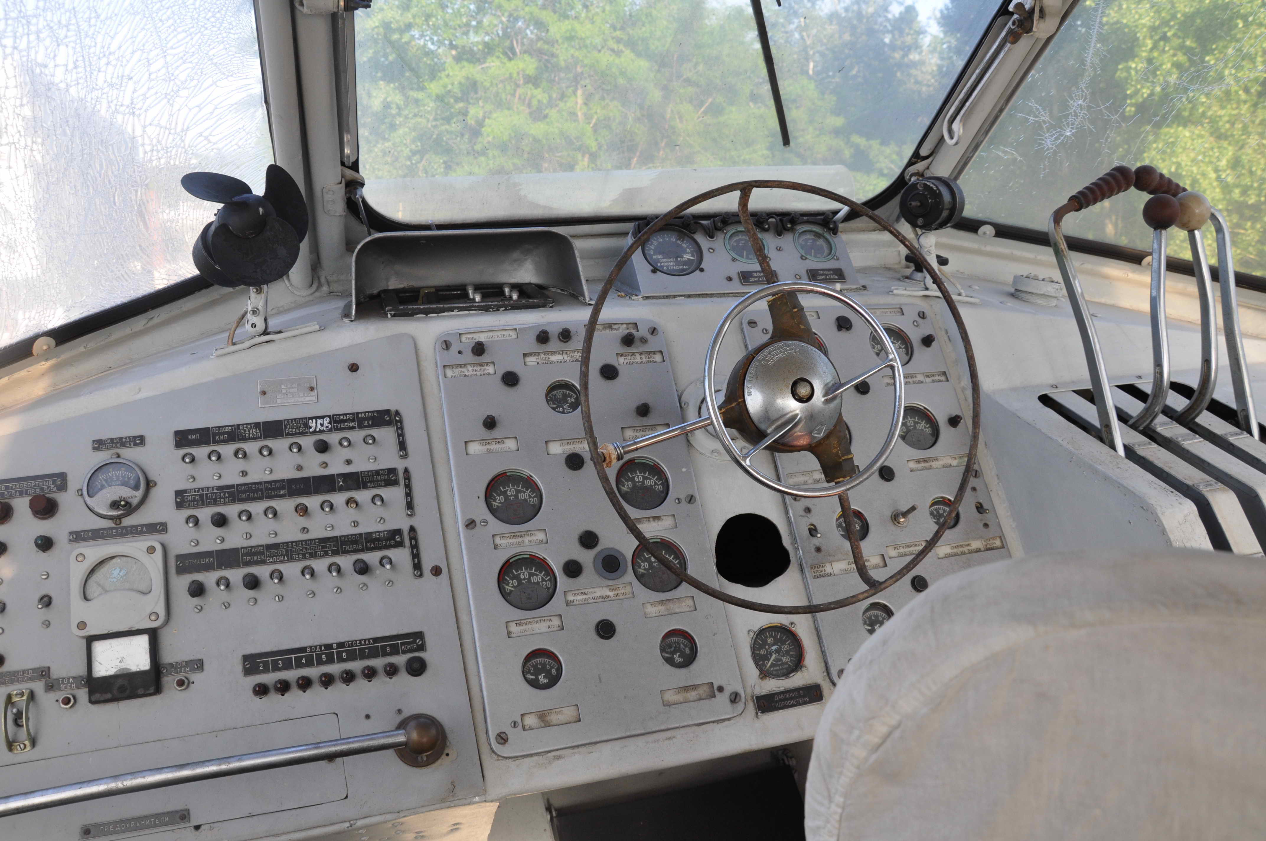 Сегодня съездил на экскурсию вдоль обрывистых берегов Днепра. Ниже — несколько фотографий на ваше обозрение. На обратном пути увидел пришвартованный Метеор на подводных крыльях. Меня провели внутрь: в салон, в машинное отделение и в капитанскуб рубку. Позже постараюсь загрузить снятое мною видео оттуда, а пока фотография штурвала и приборной доски.