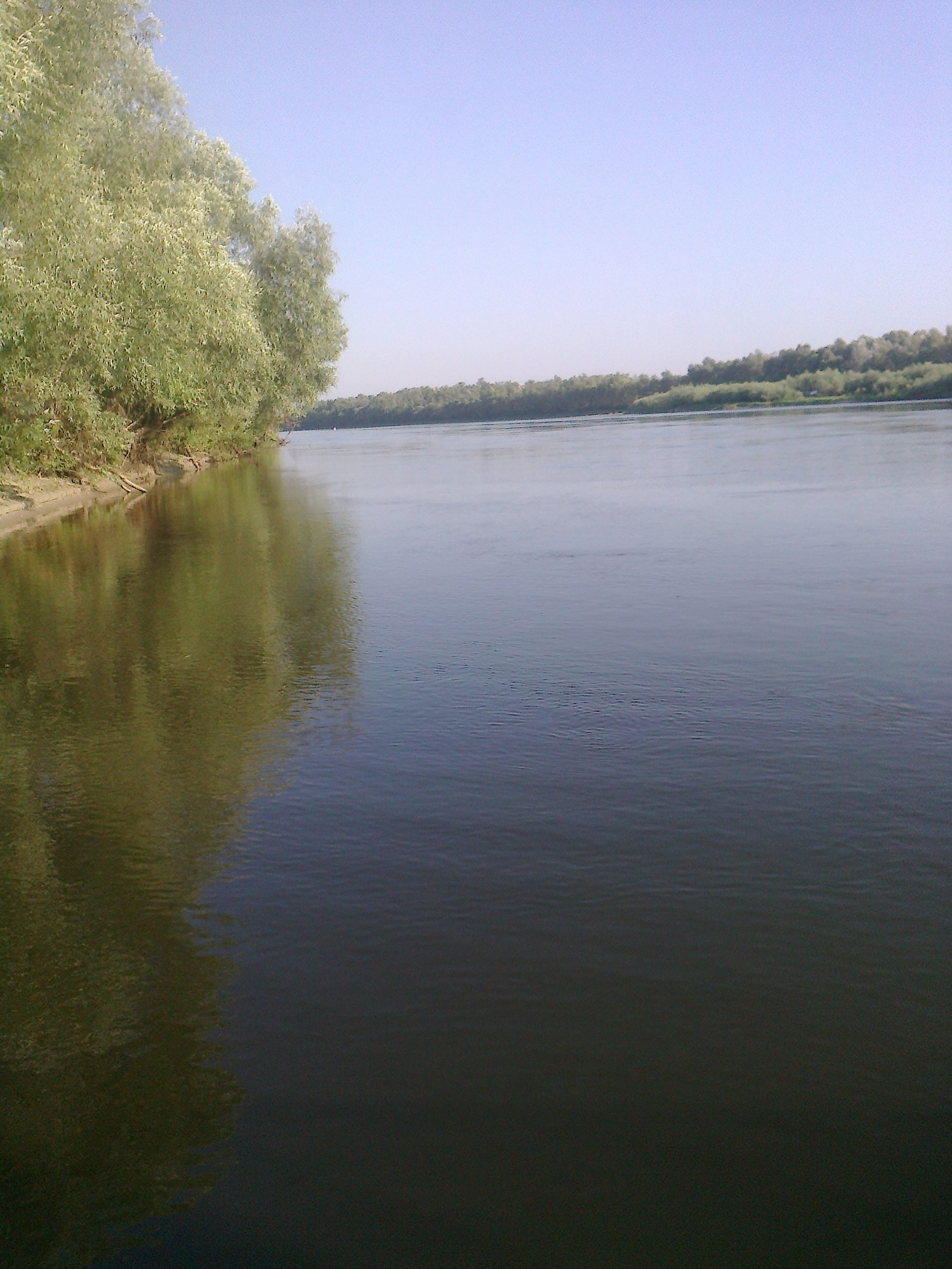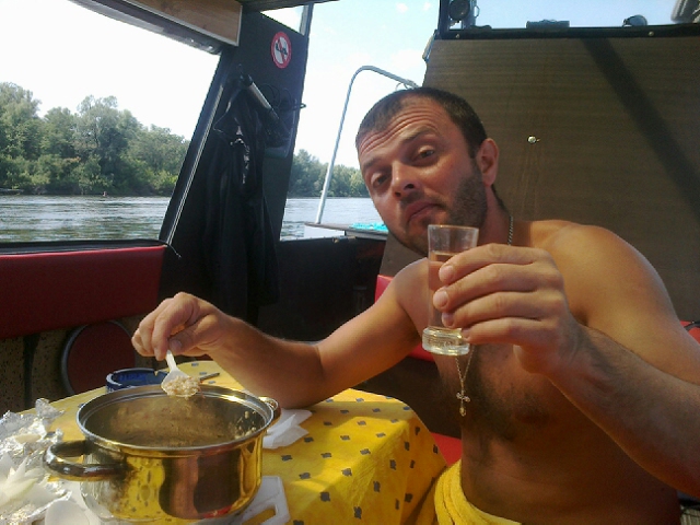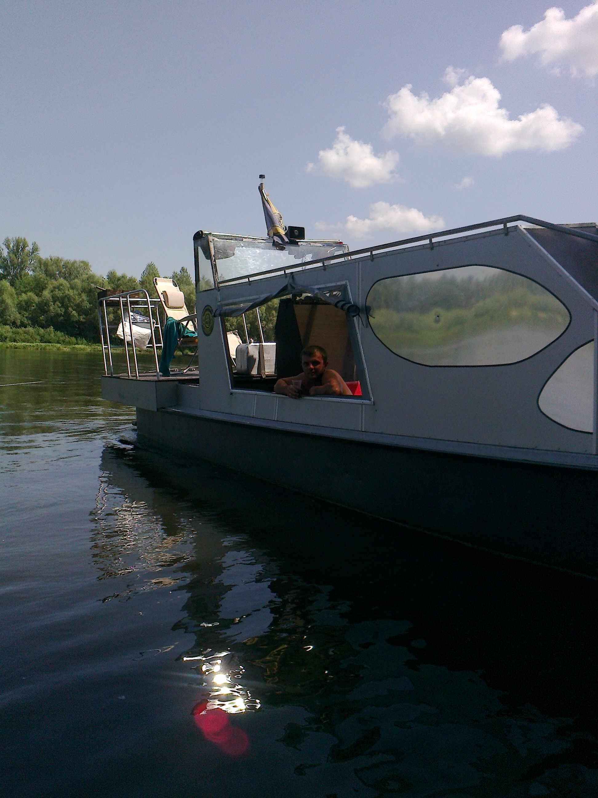 В первый день переночевали напротив Хотяновки, выбрались после обеда, километраж не хотелось накручивать на гребной вал, передвигались всегда в спокойном режиме, наверное поэтому потратил приблизительно 45л бенза на все. Утром кофе-пиво и по ходу движения мангал с атрибутами))). Второй день остановка на нашем, с супругой, любимом острове, перед Рожнами. Подходил Костя Голык с товарищем, посидели потриндели, я попытался быть рыбаком и как обычно оборвал Костика снасть, причем закидывал ее хозяин. Хотя нет на удочку, А ОНА У МЕНЯ ЕСТЬ, поймали с супругой несколько рыб, самая большая не влазила в горлышко пятилитровой баклажки))), выпустили конечно. Постояли там еще два дня. Дров там конечно много, кастрик горел круглосуточно. Обожрались шо дурни с голодного края, пришлось выкинуть часть приготовленного – жарко очень было, а стремно травонутся, перешли на консервацию и овощи. Когда закончилось холодное пиво, двинули на Летки, но пришли после 20-00, магазины закрыты, один там кабак есть «левада» называется, гадюшник еще тот, но взял разливного пиваса и пока не стемнело двинули вверх. Прошли пару км и заякорились на ночевку в самом неприглядном месте – крутой берег, наверху непроходимые заросли ивняка поточенные бобрами. Но оказалось что это самый кайф, с утра солнце бьет в корму, с берега веет прохладой, каюта не греется, спали отлично, как дома с кондиционером. Перекусили и опять на Летки, до магазина топать далековато, еще с дуру набрал как обычно… Решили вернутся на то же место, в хащи. Стояли там три дня. Днем обнаружилось, что место точно, что надо, задняя площадка на солнце, а весь катер в тени, течение конечно офигенное, по грудь в воде не удержишься. И тут расслабившись, вечером, в очередной раз залез на форум, вставая с задней площадки, роняю телефон в воду, на следующий день с женой решили проверить в каком направлении он ушел. Привязали к мидии нитку метра три с пенопластом на конце, она ушла метров на пятнадцать, да и х.. с ним, контактов жалко. Тут же жена развела мидееферму, прикольно они потом расползались. А я придумал аттракцион со спас кругом. Приезжал Макс длинный с женой и друганом на прогрессе с шестого ропа пописятничали. В понедельник решили двигать домой, опять встретили Костика Голык с друганом. Поужинали,.. и решили остаться на ночевку рядом с его ропом . Стали на месте с живностью, семейством бобров, реально мне не давали спать, гады, тягали какие то ветки, бревнышки, шкрябали по катеру.. Утром Костя возвращался с рыбалки, и мы позавтракав омлетом из свежайших домашних яиц привезенных им двинули на шестой роп. Постараюсь завтра рассказать про судоходство в эту пору, на Десне. Вот немного фоток с телефона жены.