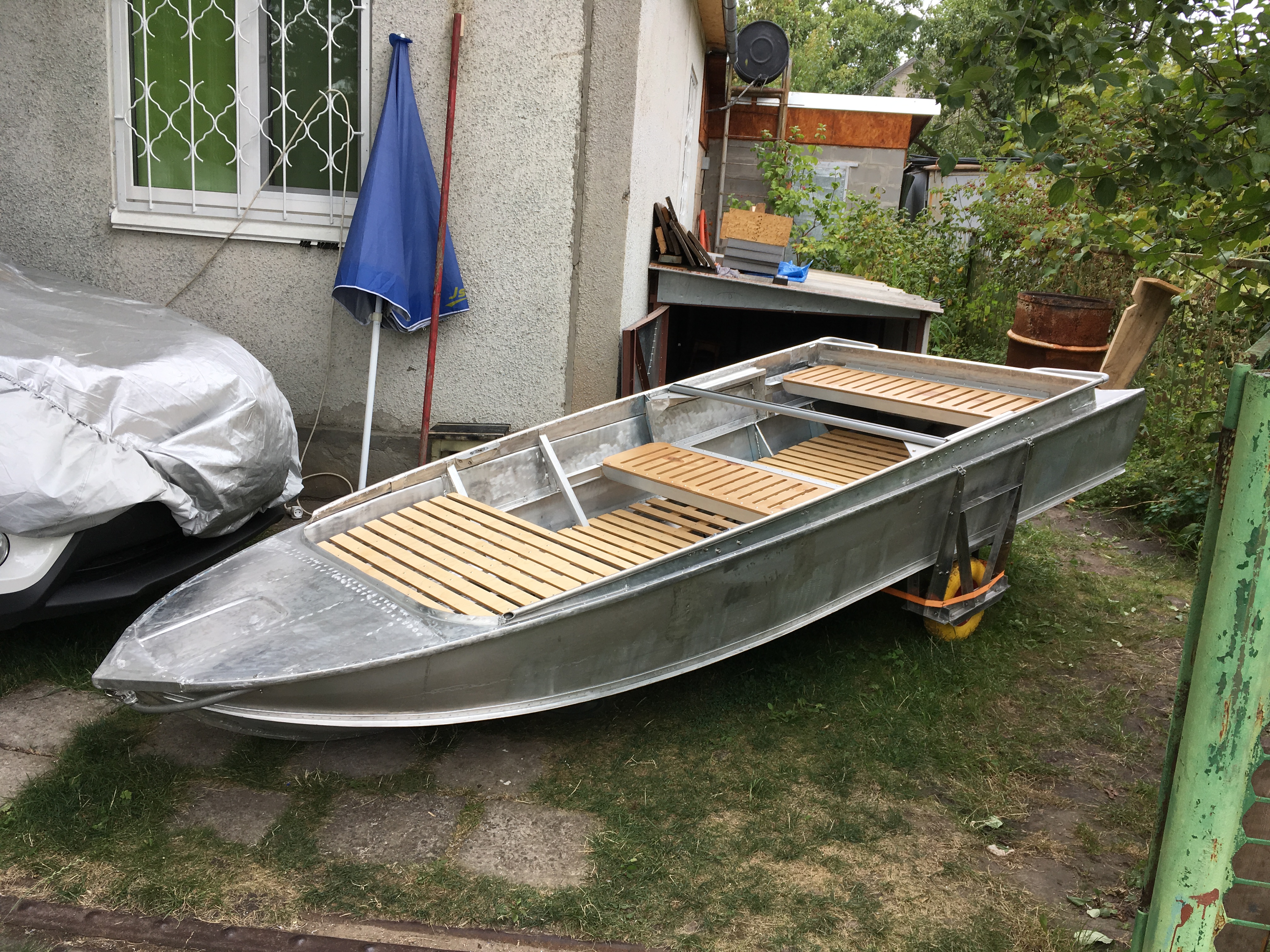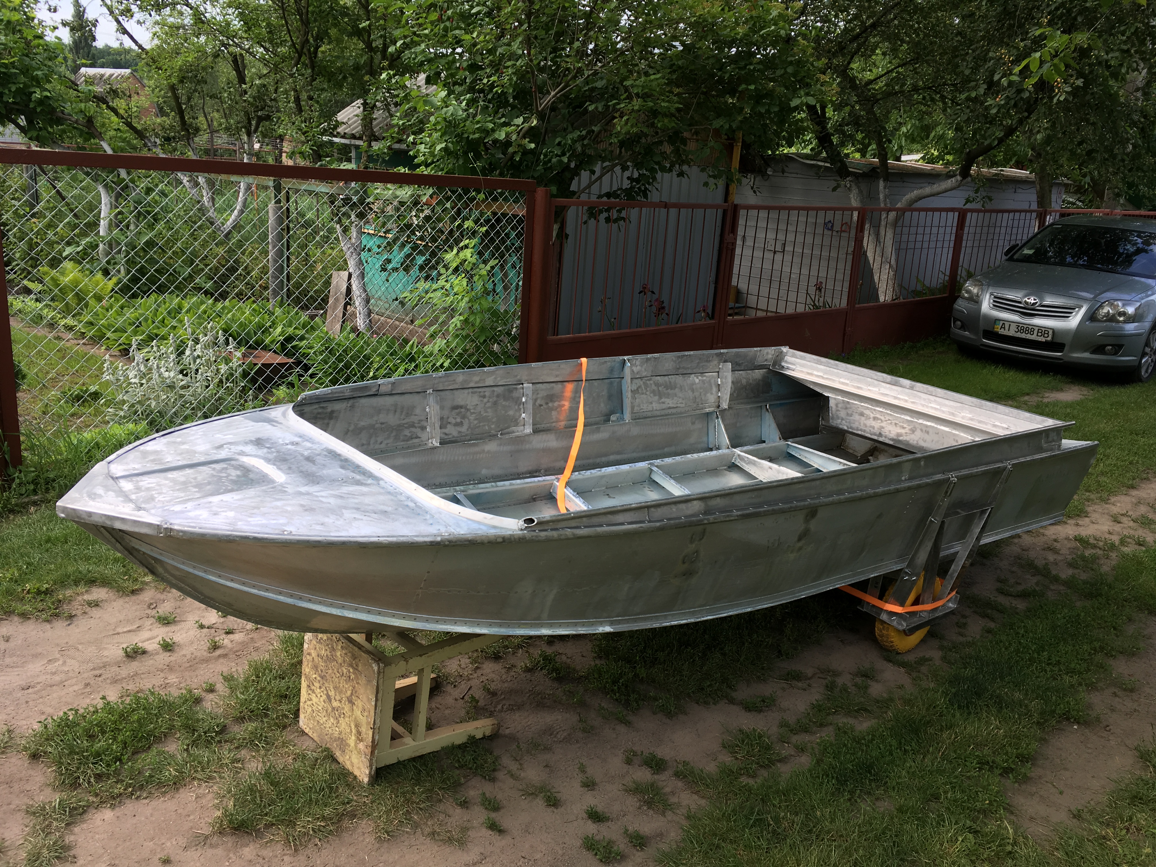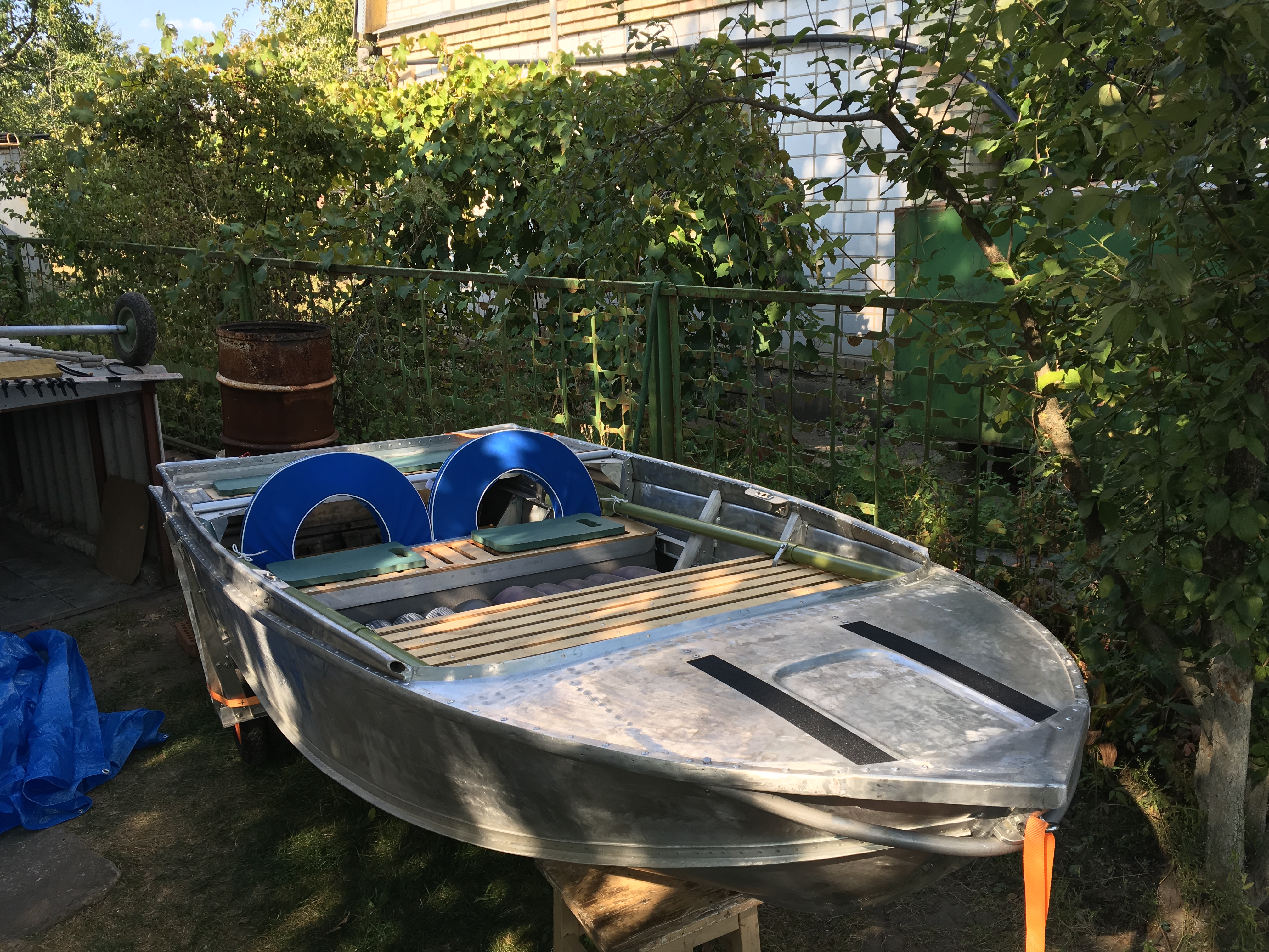 Лодка досталась практически перед утилизацией, днище корпуса без дыр, были вмятины, капот (нос) восстанавливать не было смысла. Так родился облегченный вариант, для транспортировки в пешом порядке 300м до реки.