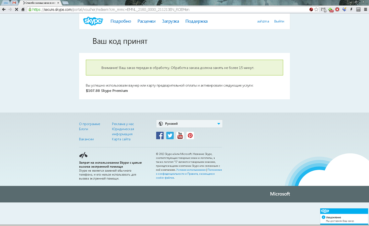 Далее переходим на skype.com/go/voucher, логинимся там, и вводим код подтверждения который пришел нам на почту (может приходить с задержкой).