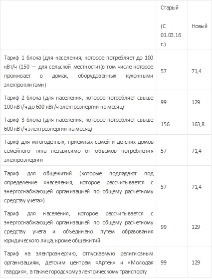 С 01.09.16 г. для населения будут действовать новые тарифы на электроэнергию. Скажем, тариф на электроэнергию для тех, кто потребил до 100 кВт/ч вырос с 57 коп. за кВт до71,4 коп. за кВт/ч. Полная тарифная сетка приведена в таблице.