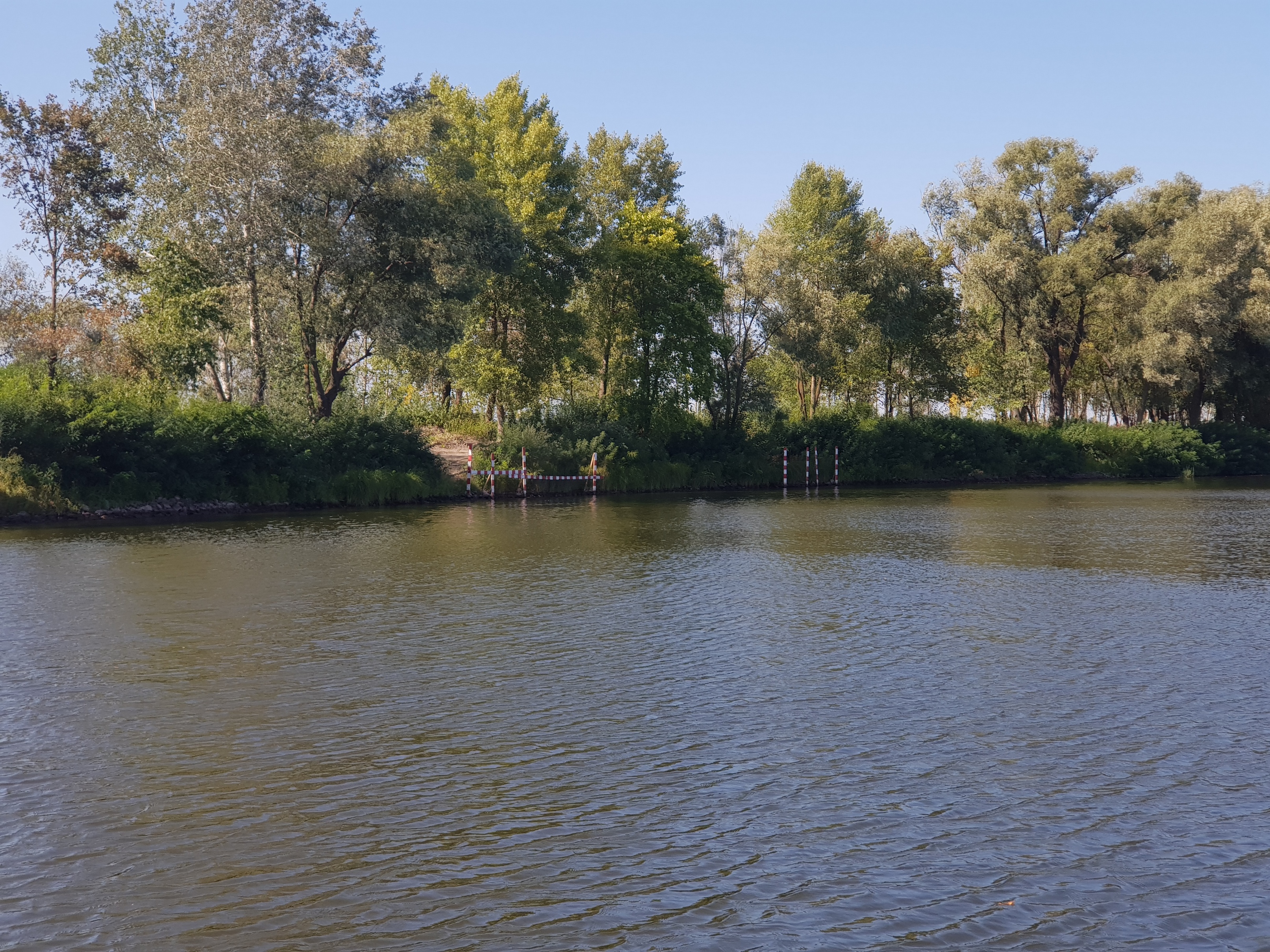 Часть берега перегородили, чуть выше плавучей водокачки, столбы полосатые, и между ними сетка натянута. Явно не хотят, что бы могли причалить. 4-е таких заборчика с небольшими интервалами. Итого метров на 150 растянулись.