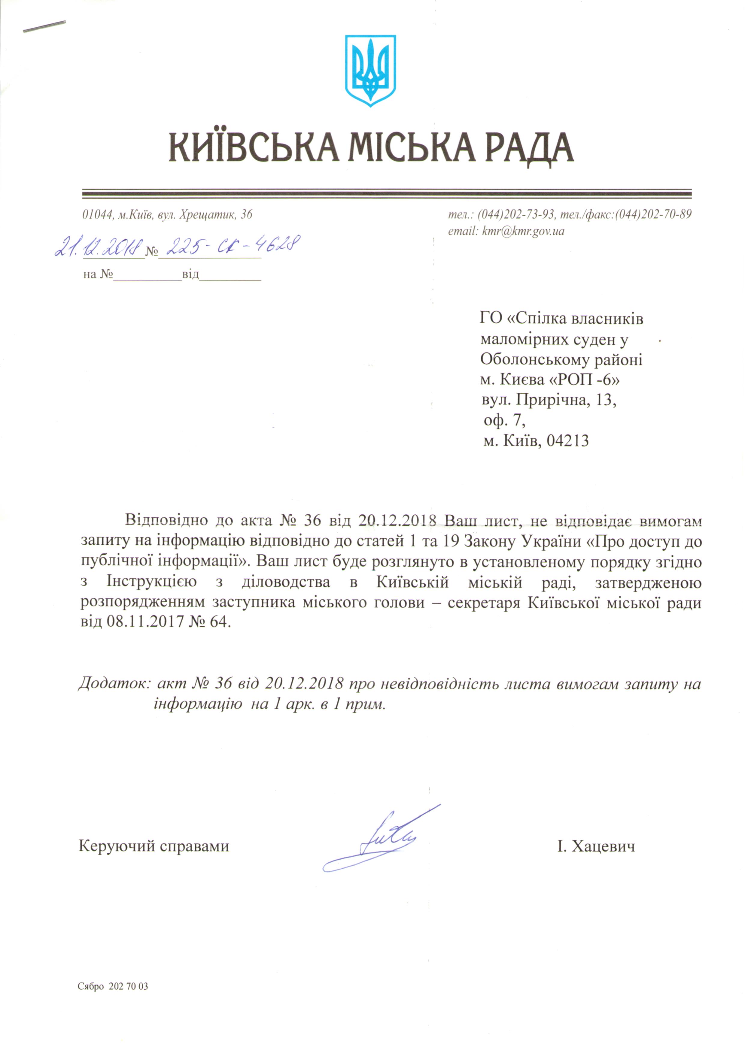 Сегодня получили ответ Киевской городской рады на наш запрос по поводу учреждения парка "Крым". Дивным в этом проекте есть то, что они ссылаются на то, что якобы наш запрос не отвечает требованиям ст.ст. 1, 19 Закона Украины "О доступе к публичной информации". Цитирую эти статьи закона: Статья 1 "Публічна інформація - це відображена та задокументована будь-якими засобами та на будь-яких носіях інформація, що була отримана або створена в процесі виконання суб'єктами владних повноважень своїх обов'язків, передбачених чинним законодавством, або яка знаходиться у володінні суб'єктів владних повноважень, інших розпорядників публічної інформації, визначених цим Законом". Статья 19 "1. Запит на інформацію - це прохання особи до розпорядника інформації надати публічну інформацію, що знаходиться у його володінні. 2. Запитувач має право звернутися до розпорядника інформації із запитом на інформацію незалежно від того, стосується ця інформація його особисто чи ні, без пояснення причини подання запиту. 3. Запит на інформацію може бути індивідуальним або колективним. Запити можуть подаватися в усній, письмовій чи іншій формі (поштою, факсом, телефоном, електронною поштою) на вибір запитувача. 4. Письмовий запит подається в довільній формі. 5. Запит на інформацію має містити: 1) ім'я (найменування) запитувача, поштову адресу або адресу електронної пошти, а також номер засобу зв'язку, якщо такий є; 2) загальний опис інформації або вид, назву, реквізити чи зміст документа, щодо якого зроблено запит, якщо запитувачу це відомо; 3) підпис і дату за умови подання запиту в письмовій формі. 6. З метою спрощення процедури оформлення письмових запитів на інформацію особа може подавати запит шляхом заповнення відповідних форм запитів на інформацію, які можна отримати в розпорядника інформації та на офіційному веб-сайті відповідного розпорядника. Зазначені форми мають містити стислу інструкцію щодо процедури подання запиту на інформацію, її отримання тощо. 7. У разі якщо з поважних причин (інвалідність, обмежені фізичні можливості тощо) особа не може подати письмовий запит, його має оформити відповідальна особа з питань доступу до публічної інформації, обов'язково зазначивши в запиті своє ім'я, контактний телефон, та надати копію запиту особі, яка його подала". В общем, читайте наш запрос на странице № 166, сообщение № 3318 этой темы и сравнивайте с требованиями закона. Выводы делайте сами. Напоминаю правила форума: сдерживайте свои формулировки)))) П.с. от депутата Владислава Михайленка ответа еще нет. Востаннє редагував Дмитрий 23564: 27.12.2018 о 15:59. |