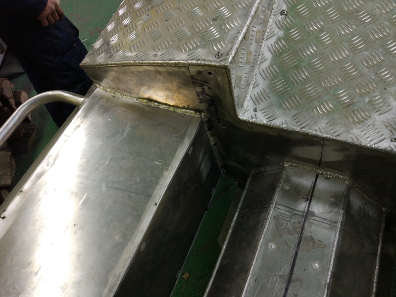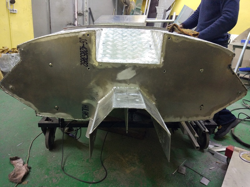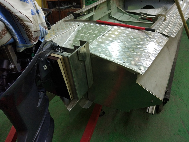 У Вас винт на ходу полупогружен, если вообще не сухой. Точнее, хода не будет, по причине захвата воздуха. Так видно на фото по уровню заглубления винта. Второй важный момент, Вы делаете лодку для мелководья, т.е. с малой осадкой. Зачем тогда нагрузили корпус рифленкой? И это, как я понинимаю, не предел, еще веса добавите.